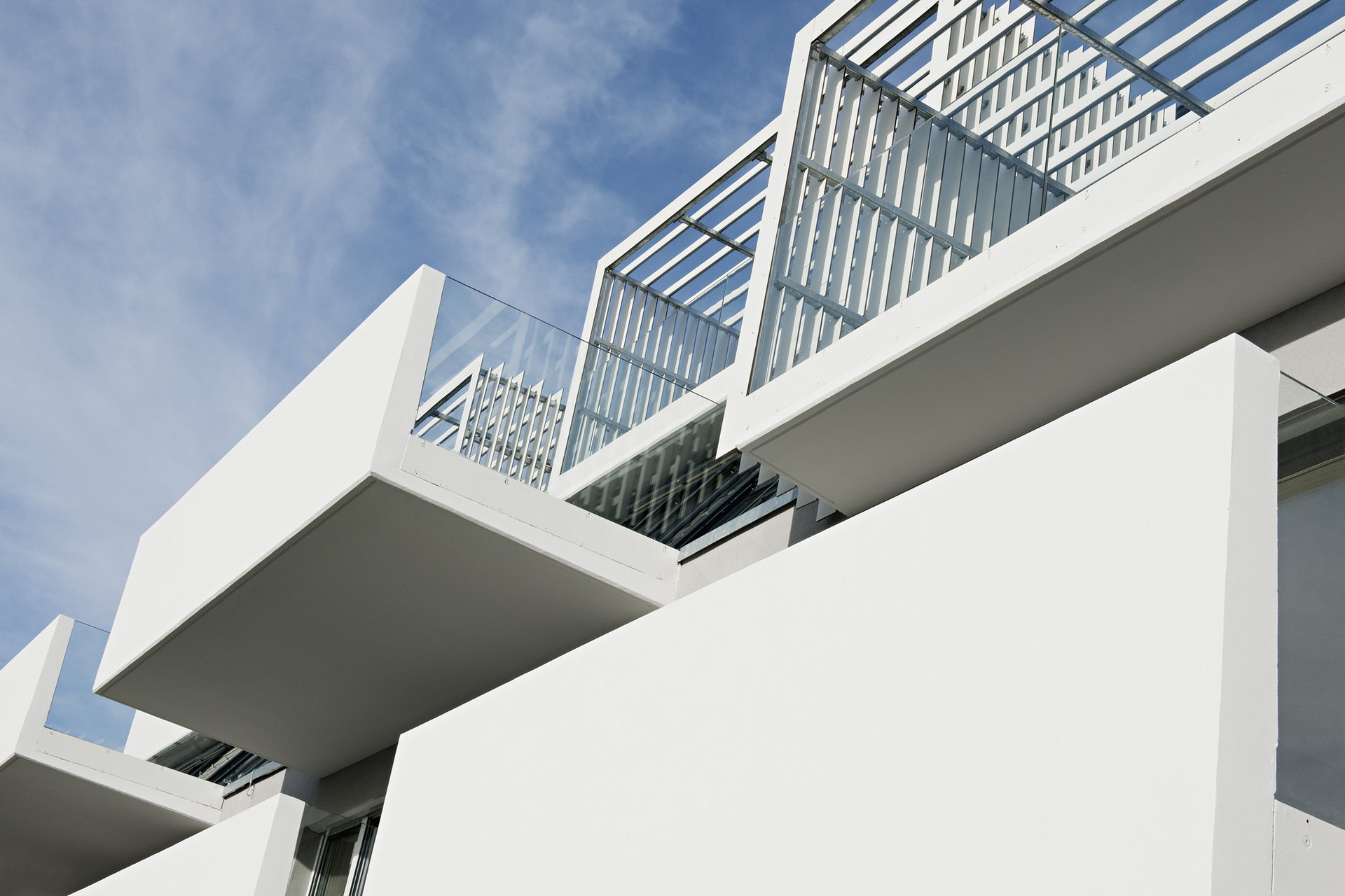 Die zwei Gebäude zur Straße geben sich selbstbewusst in großer abstrakter Form. Die Dachschräge im Süden geht über zwei Geschoße mit ausladenden Balkonkörpern. Ins Innere gewandt richtet sich eine ruhigere Ansicht mit offenen und geschlossenen Fassadenflächen. (Text: Martina Pfeifer Steiner)