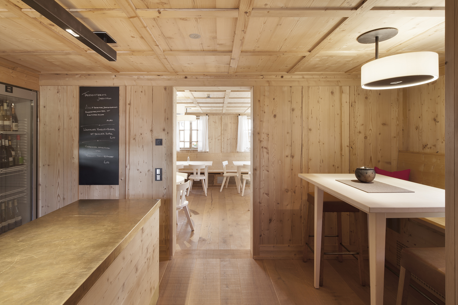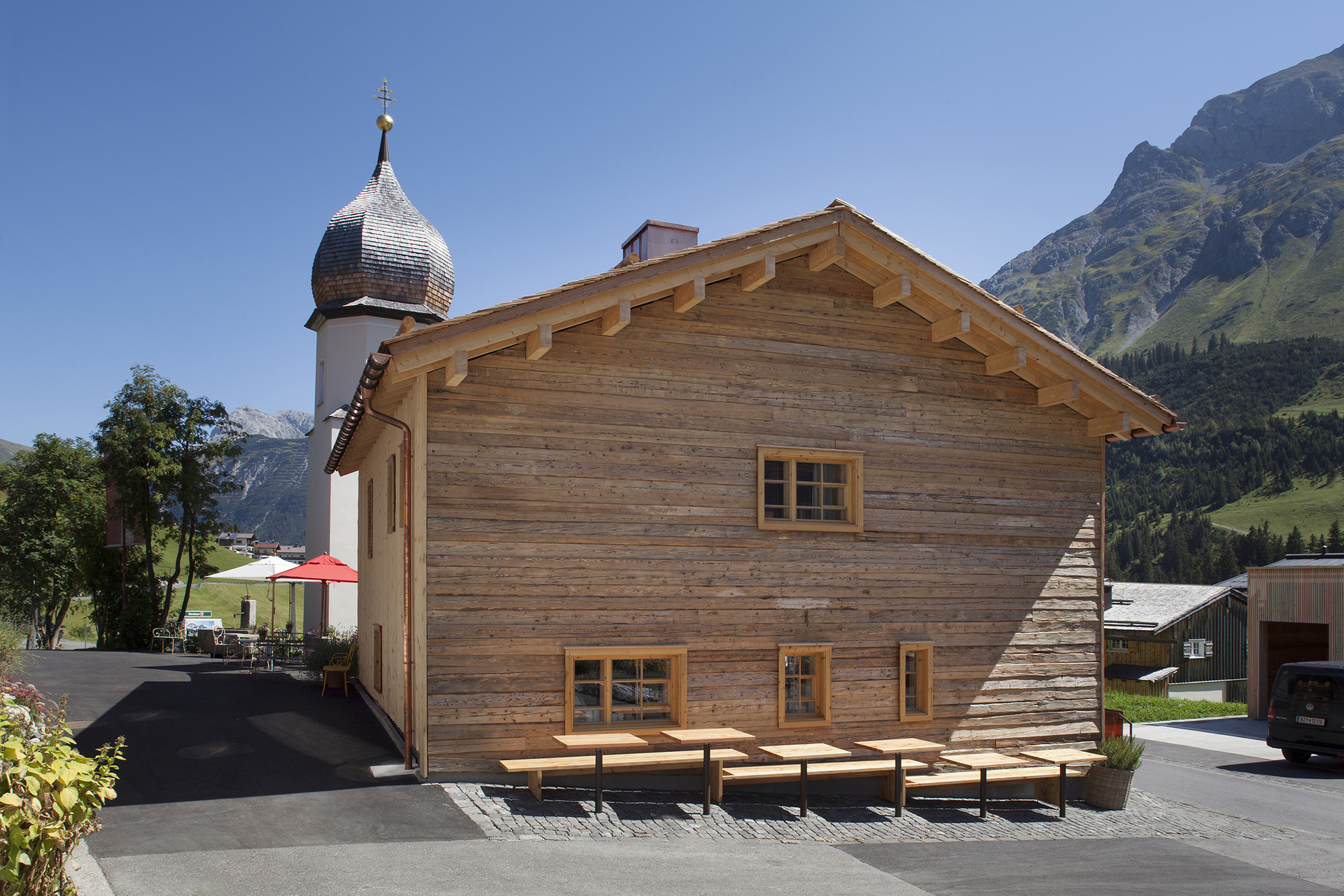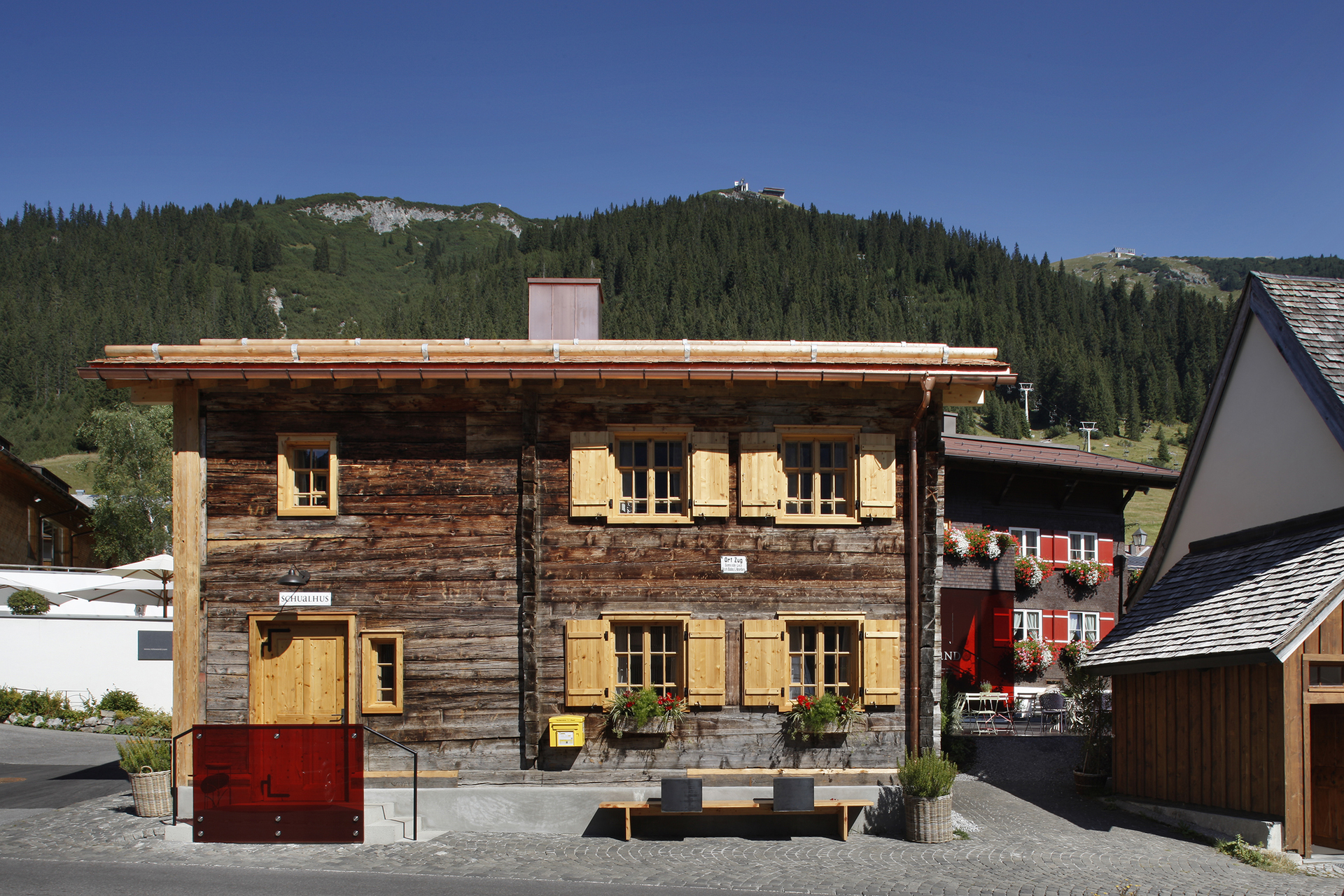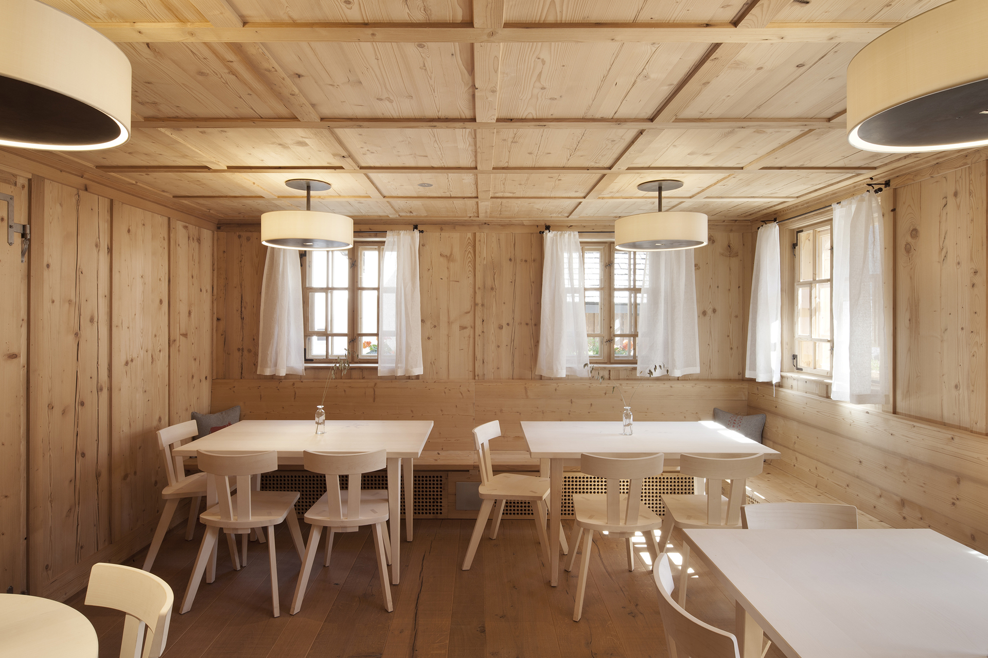 Die historische Konstruktion wurde von späteren Ergänzungen befreit, der ursprüngliche Strickbau ist nun wieder sichtbar. Die Außenwand erhielt eine innere Doppelschale, in der die Installationen und die Lüftungskanäle geführt werden. Neue Konstruktionen wie Kastenfenster, Innentäfelung und Holzschindeldach wurden nach historischen Vorbildern handwerklich aus Altholz erzeugt. Die zeitgemäße Funktion gibt dem „Alten Schualhus“ das für das Überleben historischer Häuser wichtigste Kapital zurück: eine vitale Alltagsnutzung für die nächste Generation. (Text: Architekten)