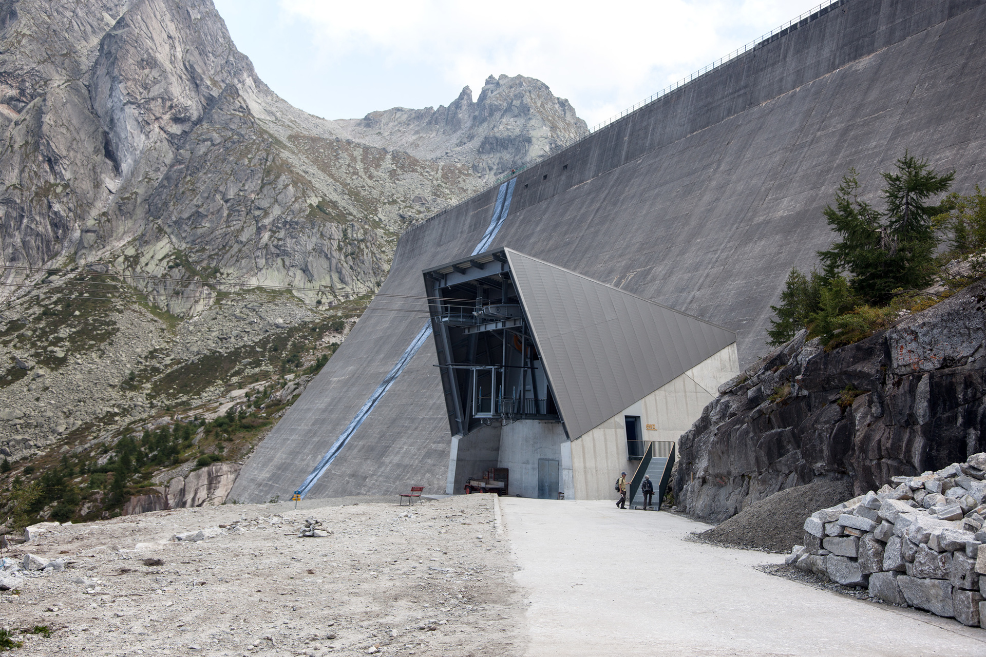 Die Bergstation, rund 900 Höhenmeter und knapp 2’500 Meter Seildistanz entfernt, steht der Faltung der Talstation als massive Baukörperfigur gegenüber. Ein Betonsockel als Schwergewicht bildet in expressiver Weise die wirkenden Seilkräfte ab und setzt sich am Fuss der emporsteigenden Staumauer fest. Auf dessen Krone komplettiert ein Stahlskelett die Gestalt – zum Tal hin sich öffnend und zur Staumauer auf die Höhe ihrer Dachträger verjüngt. In der Ausarbeitung der Fassaden wird die Schwere des Betonsockels durch Bearbeiten der Oberflächen zusammen mit der Metallhülle in ein Gleichgewicht von geometrischen Flächen überführt, das zwischen Monumentalität und Filigranität vermittelt und Staumauer und Station samt Seilbahntechnik in der Gestalt zusammenbringt.