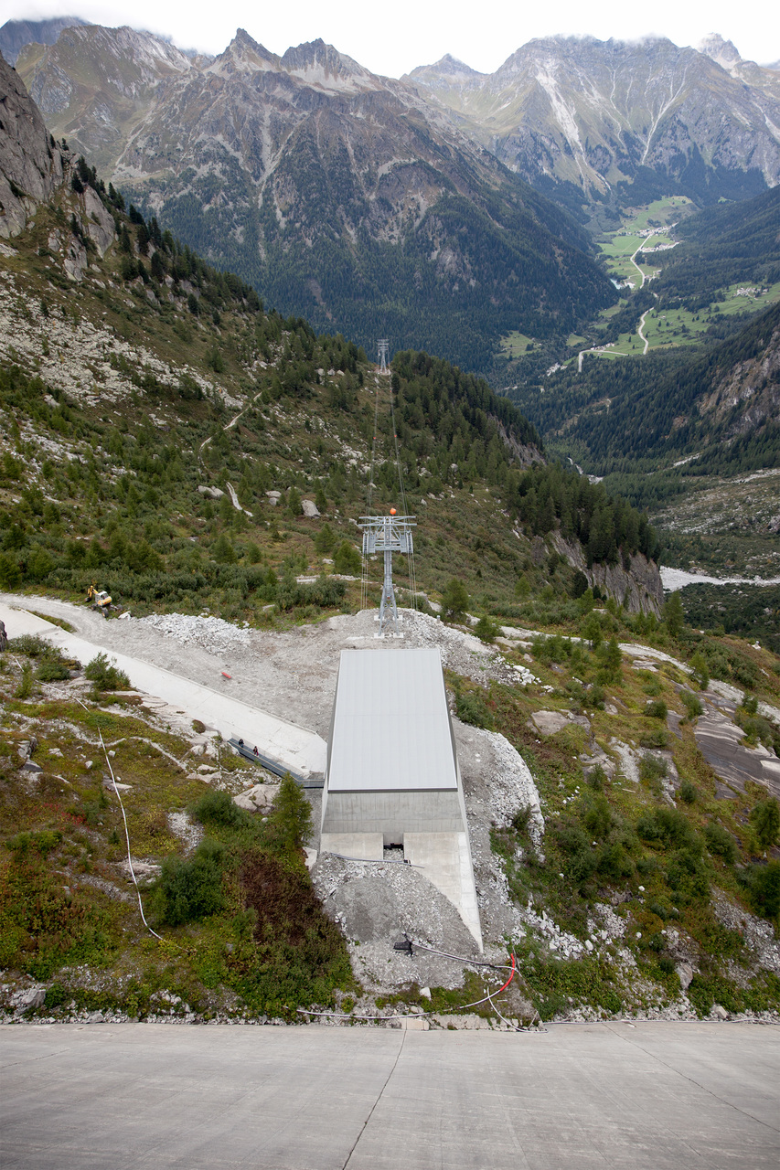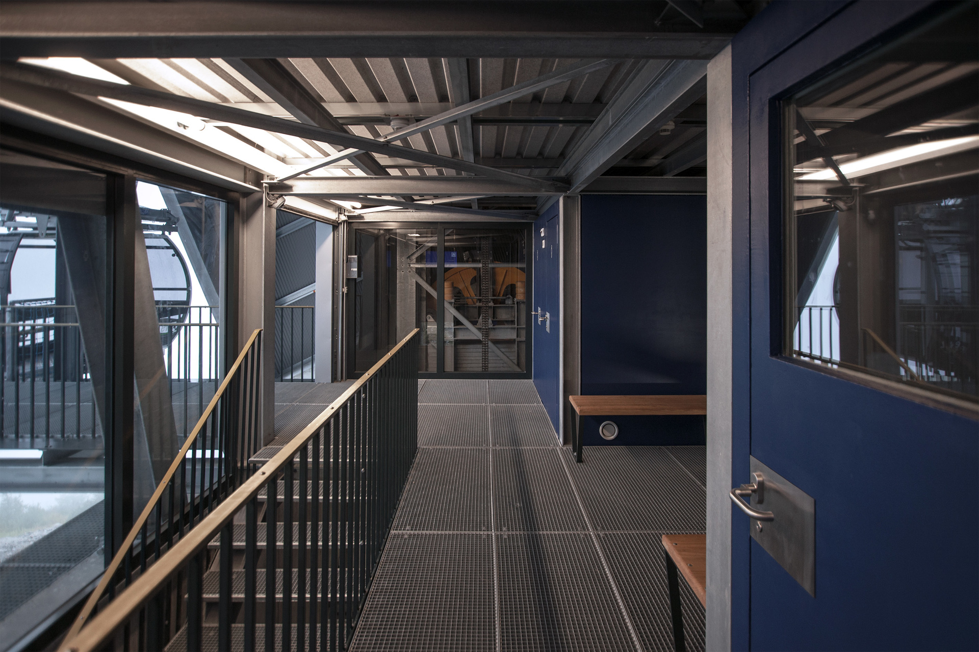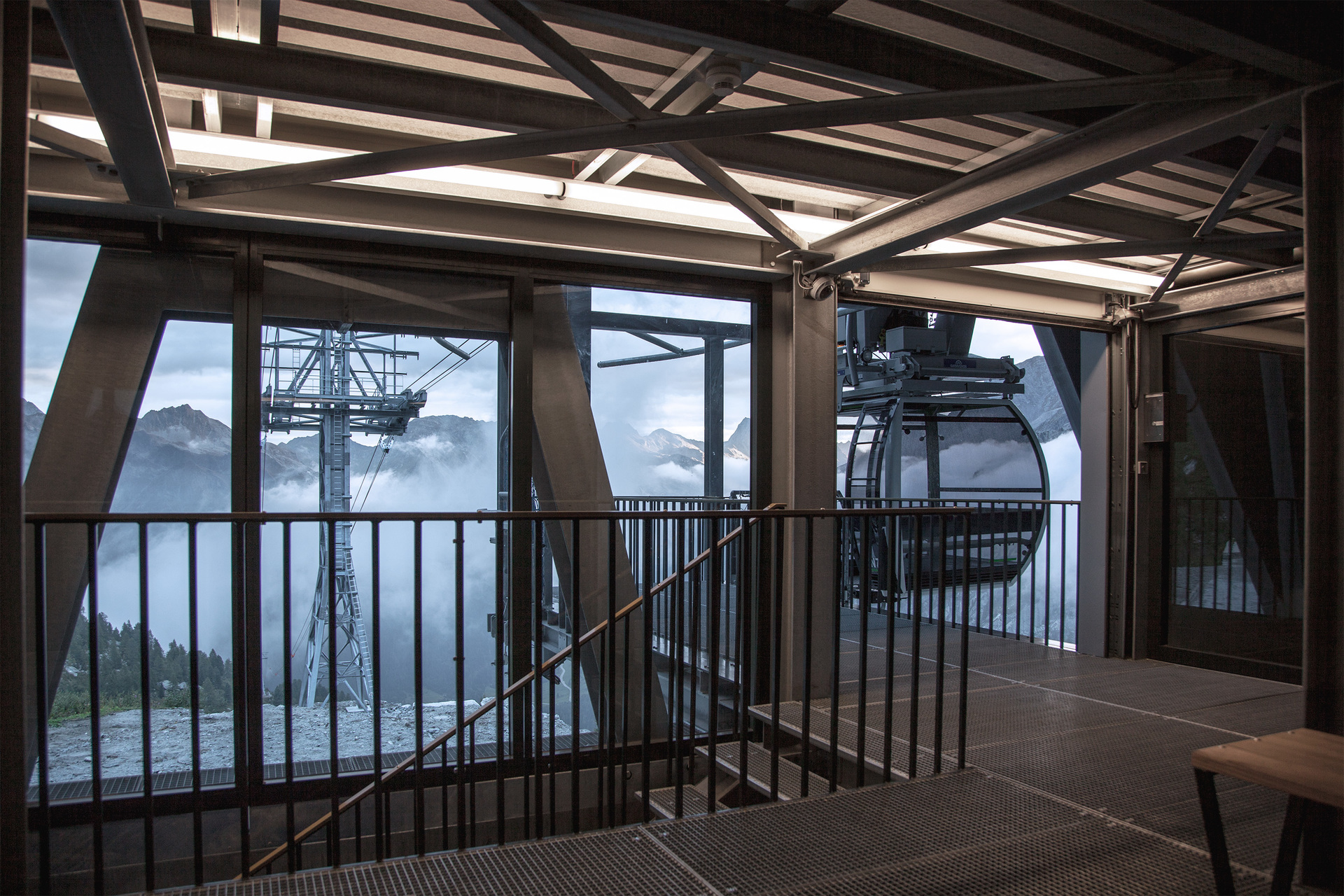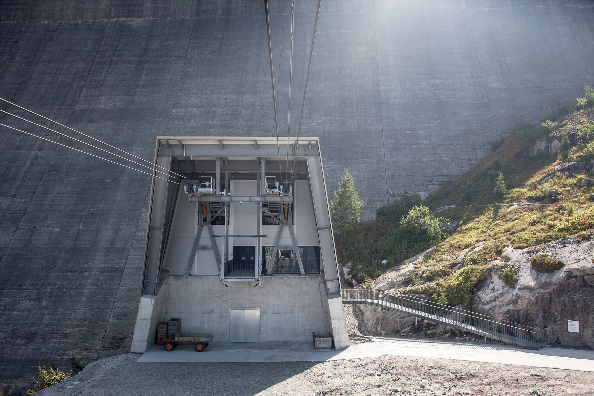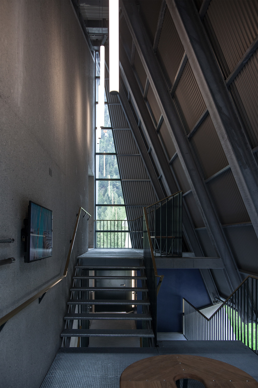 Die ankommende Gondel legt am von den Dachträgern hängenden Podest an, das unter den Seilen direkt in den Maschinenraum übergeht. Eine Treppe führt in den Bauch des massigen Sockels und durch eine Luke in der schrägen Betonwand in die Berglandschaft am Fusse der Staumauer. (Text: Architekt:innen)