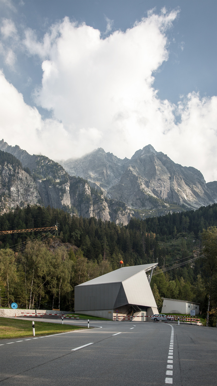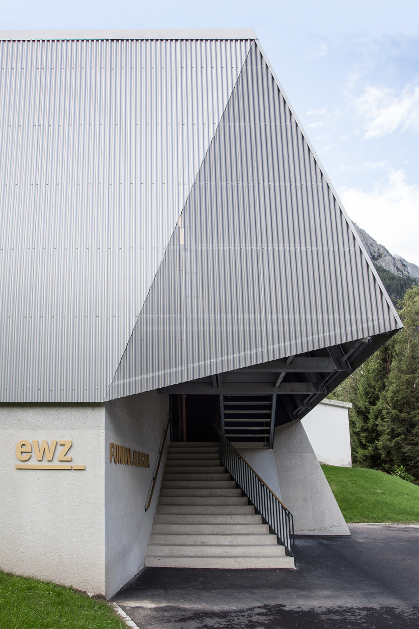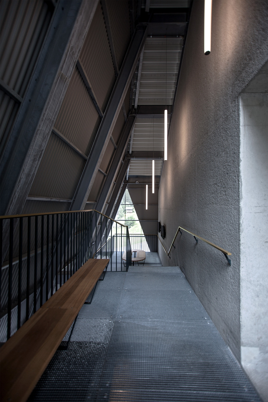 Zu Beginn der Suche nach einer Gestalt der Tal- sowie der Bergstation stand in der Konsequenz die minimale, ökonomische Ummantelung des Maschinenraums als betriebliche Grundvoraussetzung. In derselben industriellen Sprache, darin jedoch als präzise architektonische Geste formuliert, wurden die restlichen Funktionen daneben arrangiert, mit der Seilbahninfrastruktur unter einer Hülle vereint und in der Topografie zu einer prägnanten Figur geformt. Die Gebäude sollen in Einfachheit, jeweiliger Eigenständigkeit und evidenter Form erscheinen und sich als adäquates Gesicht der Elektrizitätswerke zeigen.
