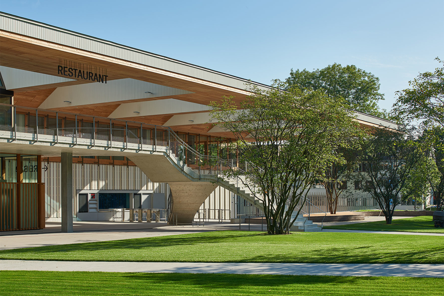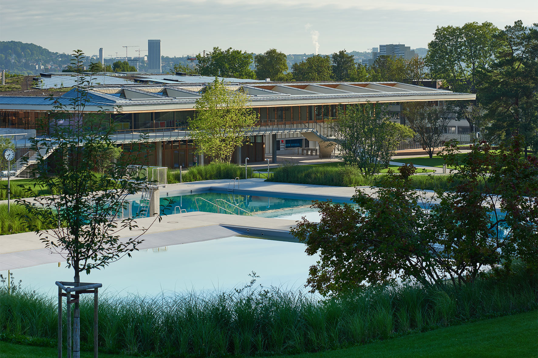 Ein ausgeklügeltes Energietauschsystem Sportund Energiespeichersystem sorgt dafür, dass die Abwärme der Kältemaschinen – sie arbeiten mit CO2– im Haus sowie im benachbarten GZ für Heizung und Warmwasser wiederverwendet wird. Die Solarstromanlage auf dem Dach deckt 20 Prozent des gesamten Stromverbrauchs. Das helle Trapezblech in der Eishalle trägt übrigens auch zum Energiesparen bei: es reflektiert die Kälte des Eisfelds in den Raum zurück. Doch zurück zum Anfang, zum Eingang des Sportzentrums: Hier kragt das Holzdach nicht weniger als 16 Meter über die Fassade aus und schafft so einen gefassten Empfangsbereich. Hier verwebt sich das Gebäude mit denn ihr Ziel ist das Freibad. Balliana Schubert Landschaftsarchitekten haben es neu gestaltet und geordnet. Dabei war das Ziel, dem Freibad möglichst viel landschaftliche Weite zu verleihen und die Liegewiesen nach Möglichkeit zu erweitern. Zwar blieb die Anlage in ihren Grundzügen unverändert, die Schwimmbecken sind am alten Ort und auch der Gehölzsaum an den Rändern ist geblieben. Wer aber genauer hinsieht, erkennt bald die Veränderungen. Ganz neu ist natürlich die offene Situation am Eingang, wo niedrige Mauern aus dunkel gefärbtem Stampfbeton zum Sitzen einladen. Die Wiese hat in diesem Bereich mehr Raum bekomder offenen Landschaft des Freibads: Eine doppelte Freitreppe schwingt sich elegant den Besucher:innen entgegen – eine Referenz an Max Frischs Treppe im Freibad Letzigraben. Sie führt zur offenen Terrasse, die Eingang und Bad überblickt und sich bergwärts bis ins Bad hinein fortsetzt. Das Restaurant und die öffentlichen Garderoben rücken als Glaskörper in diesen Raum hinein, sodass man vom Tisch aus Liegewiese und Becken überblickt. Wände und Decken sind hier mit Lärchenholz ausgekleidet – genau wie die Dachuntersicht im Freien. So verbinden sich Aussen und Innen zu einem Ganzen. Der vielleicht wichtigste, gewiss aber men, und neue Baumgruppen gliedern den Raum. Ein flacher Strand gibt Zutritt zum Nichtschwimmerbecken und zwei elegante Sprungtürme überblicken die Wasserflächen. Verschwunden sind die einstigen Hecken am Rand, an ihre Stelle traten Rabatten mit blühenden Stauden und hohen Gräsern.