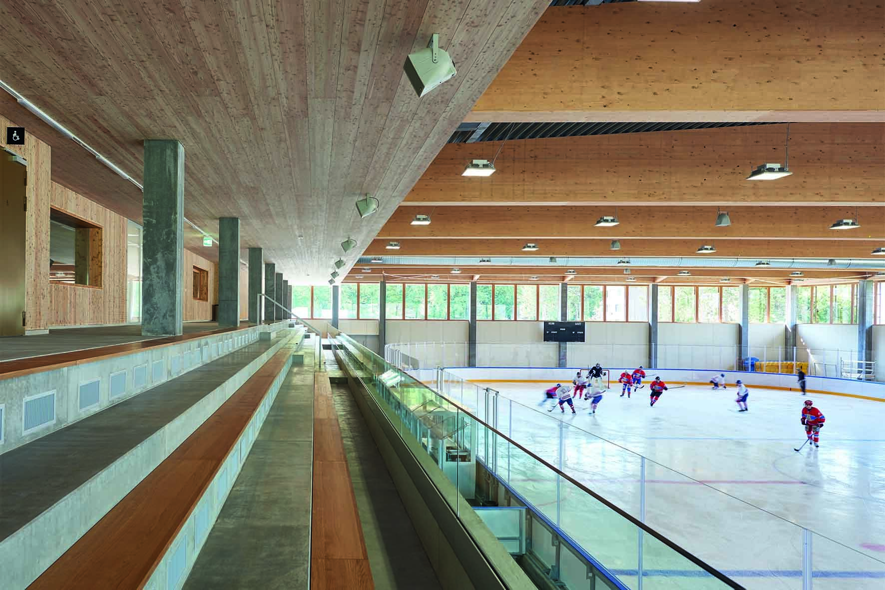 Mit seiner geschlossenen hölzernen Hülle auf einem Betonsockel und dem durchgehenden Fensterband im 1. Obergeschoss erinnert das Sportzentrum zunächst an einen Gewerbebau, es gibt nichts von seinem Inneren preis. Dort befinden sich, dicht angeordnet und spartanisch ausgebaut, die Garderoben und Nebenräume. Nur die kräftig gelbe Signaletik im Gebäude setzt hier farbige Akzente. Umso grosszügiger wirkt die hohe Eishalle, die den nördlichen Teil des Gebäudes besetzt: ein heller und offener Raum, gegliedert vom Rhythmus der Fassadenstützen und vor allem von den imposanten Holzbindern des Dachs, die hier frei sichtbar sind. Sie bilden zusammen mit dem verzinkten Trapezblech das Tragwerk des Dachs. Es wirkt wie ein Wunder: Ausser zwei Lüftungsrohren beeinträchtigen keine Installationen oder Kabel die klare Geometrie der Dachuntersicht; der Rhythmus von Holz und Metall prägt in aller Reinheit die Wirkung der Halle. Das Holz der Fenster und der Tribüne verleiht der Halle trotz kühler Temperaturen eine warme Ausstrahlung. Nur am Rand sei hier bemerkt: Eine Eislauf-Anlage gehört zu den sehr grossen Energieverbrauchern, denn das Eis in der Halle wird während elf Monaten im Jahr genutzt, das Ausseneisfeld während des ganzen Winters – Energiesparen ist hier oberstes Gebot, und das Sportzentrum erfüllt die Anforderungen von Minergie.