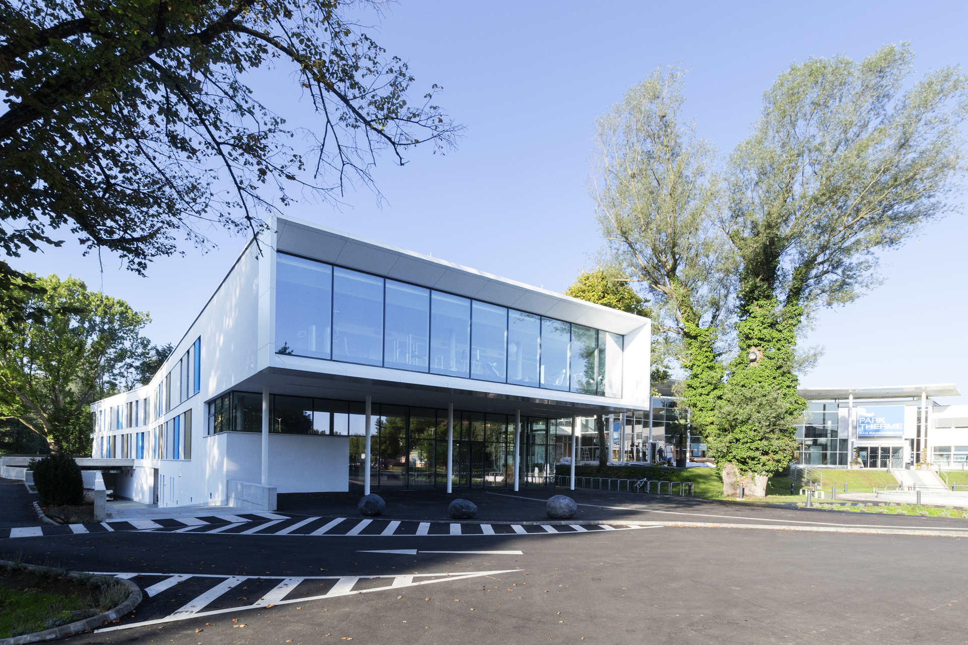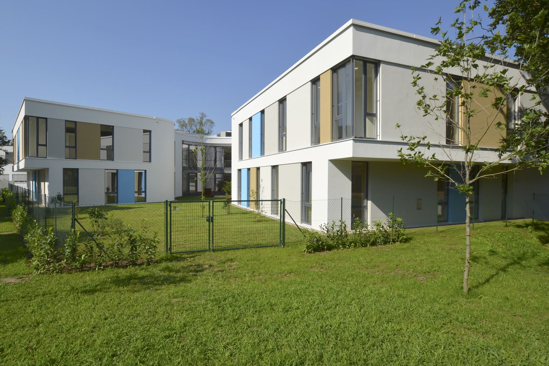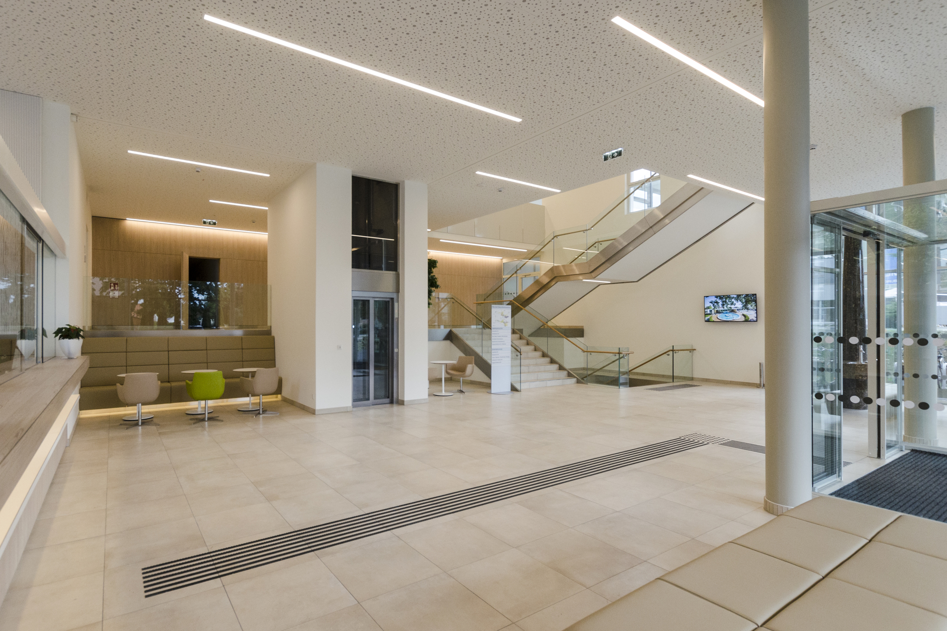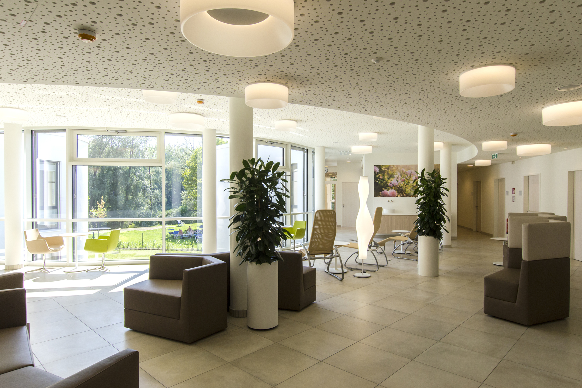 Der schlichte y-förmige Baukörper des neuen Therapiezentrums lässt der benachbarten Parktherme die erforderliche Dominanz. Das medizinische Trainingszentrum wird als Schaufenster zum Thermenplatz inszeniert, und bildet darunter einen witterungsgeschützen Vorplatz der Eingangshalle. Der zweigeschossige Therapietrakt öffnet sich in den zentralen Wartebereichen über den kreisförmigen Hof mit Blick zur südlichen Au. Die kompakte Anlage mit der unterirdischen Ladezone verbraucht möglichst wenig Grün- und Stellplatzfläche und lässt Platz für mögliche Erweiterungen. (Text: Architekten)