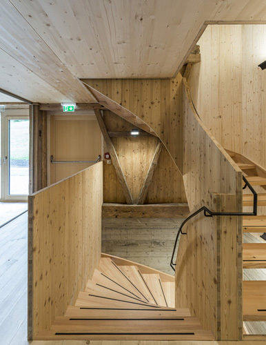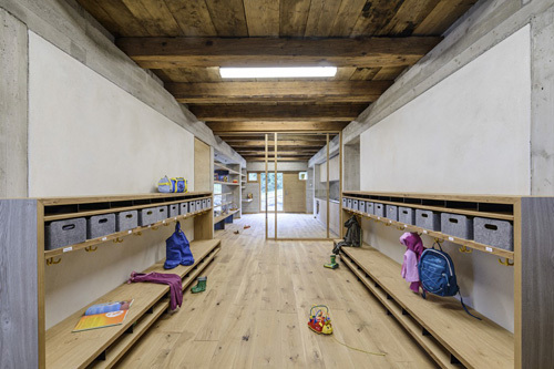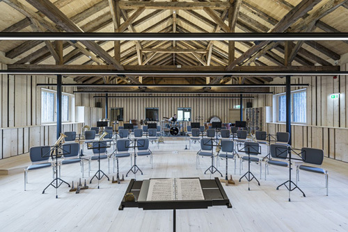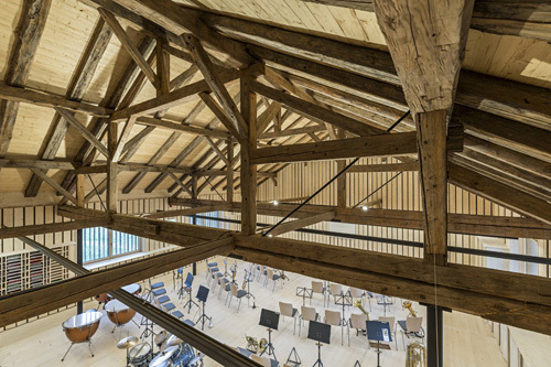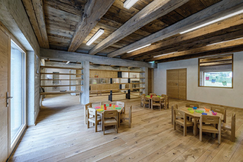Mit der Revitalisierung beauftragt wurde DIN A4 Architektur, die den vorderen, komplett in Massivbauweise errichteten und als Wohnung genutzten Gebäudeteil in seiner Gesamtstruktur innen und außen erhielten. Den mittleren Teil des Erdgeschosses adaptierten sie für die Krabbelstube, die einen eigens erschlossenen Bereich aus Gruppenraum, Ruheraum, Büro/Küche, Garderobe und Nebenräume erhielt. Im Norden des Bestandsgebäudes wurden Räume für die Musikkapelle und die Musikschule geschaffen, an die sich ein unterirdischer Anbau für Technik- und Sanitärräume anschließt. Das Herzstück des Dechantstalls, die ehemalige Tenne im Obergeschoss, wurde in einen großen Probe- und Aufführungsraum transformiert, in dem die gebäudetypische Fachwerkstruktur weitgehend erhalten geblieben ist. Zusätzlich wurde für die Musiker ein Aufenthaltsraum eingerichtet und darüber als offene Galerie das Notenarchiv und das Büro des Kapellmeisters.
