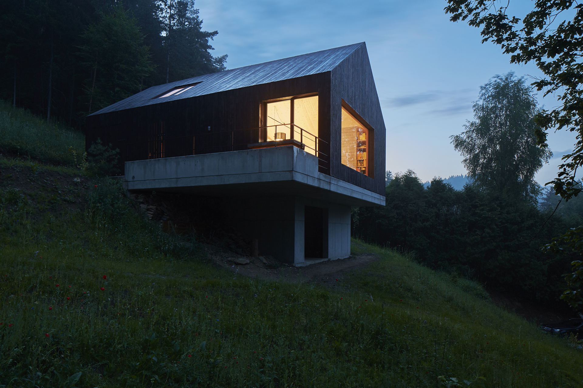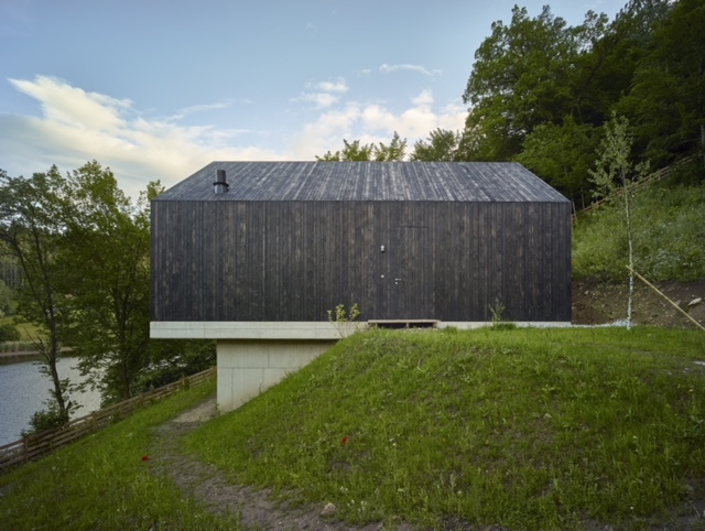 Einerseits wirkt das Haus wie ein unvermittelt in der Landschaft auftauchendes Biwak, andererseits scheint es von der Landschaft selbst hervorgebracht worden zu sein. Alles an ihm ist so weit wie möglich reduziert: die Form, die Farben, die Achsen. Selbst das Dach ist nur eine Fortsetzung von Struktur. Die Fassade wurde bewusst nicht mit Farbe behandelt, sondern, nach einem mittelalterlichen Rezept, schwarzgekohlt und geölt. Dadurch wird die Außenhaut witterungsunempfindlicher und erhält den gewünschten schwarzen Farbton.