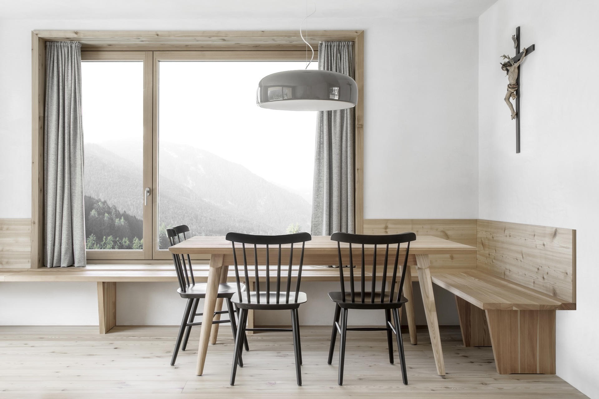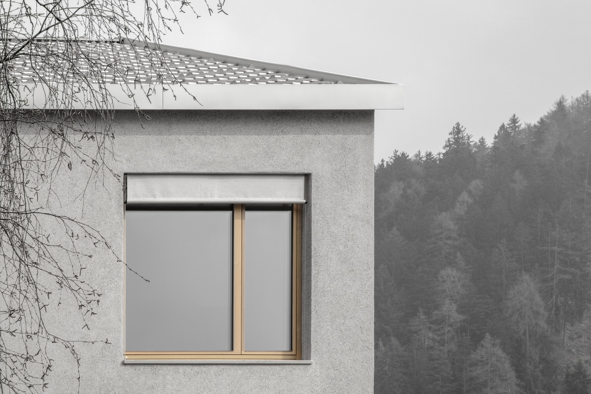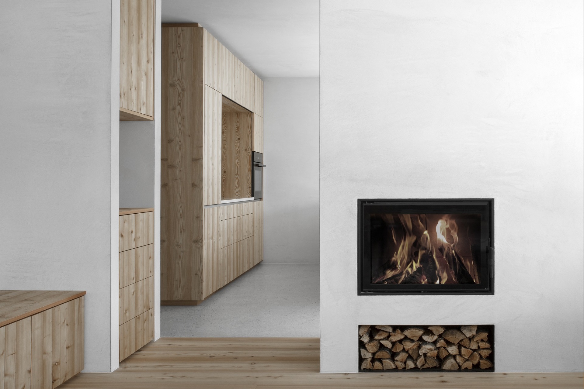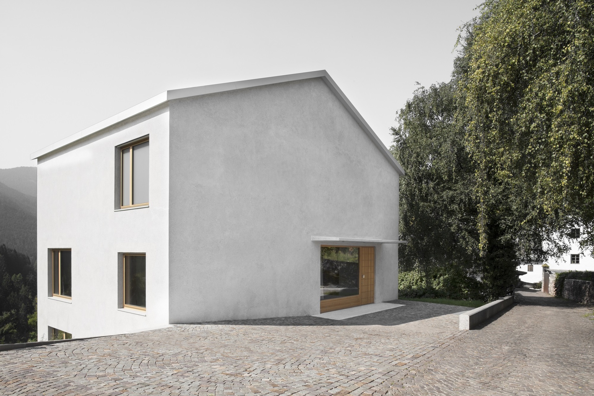 Im Inneren ermöglichen Sicht- und Kommunikationsbezüge das Erfassen des Gebäudes in alle seinen Dimensionen. Die Reduktion auf das Wesentliche zeigt sich auch hier in der Auswahl der Materialien: geglättete Putzoberflächen aus Lehm und Kalk mit Sandzuschlägen aus Dolomit und Porphyr, geschliffene Betonestriche mit Dolomitzuschlägen, Holzelemente aus lokalem Lärchenholz. (Text: Leicht gekürzter Text des Architekten)