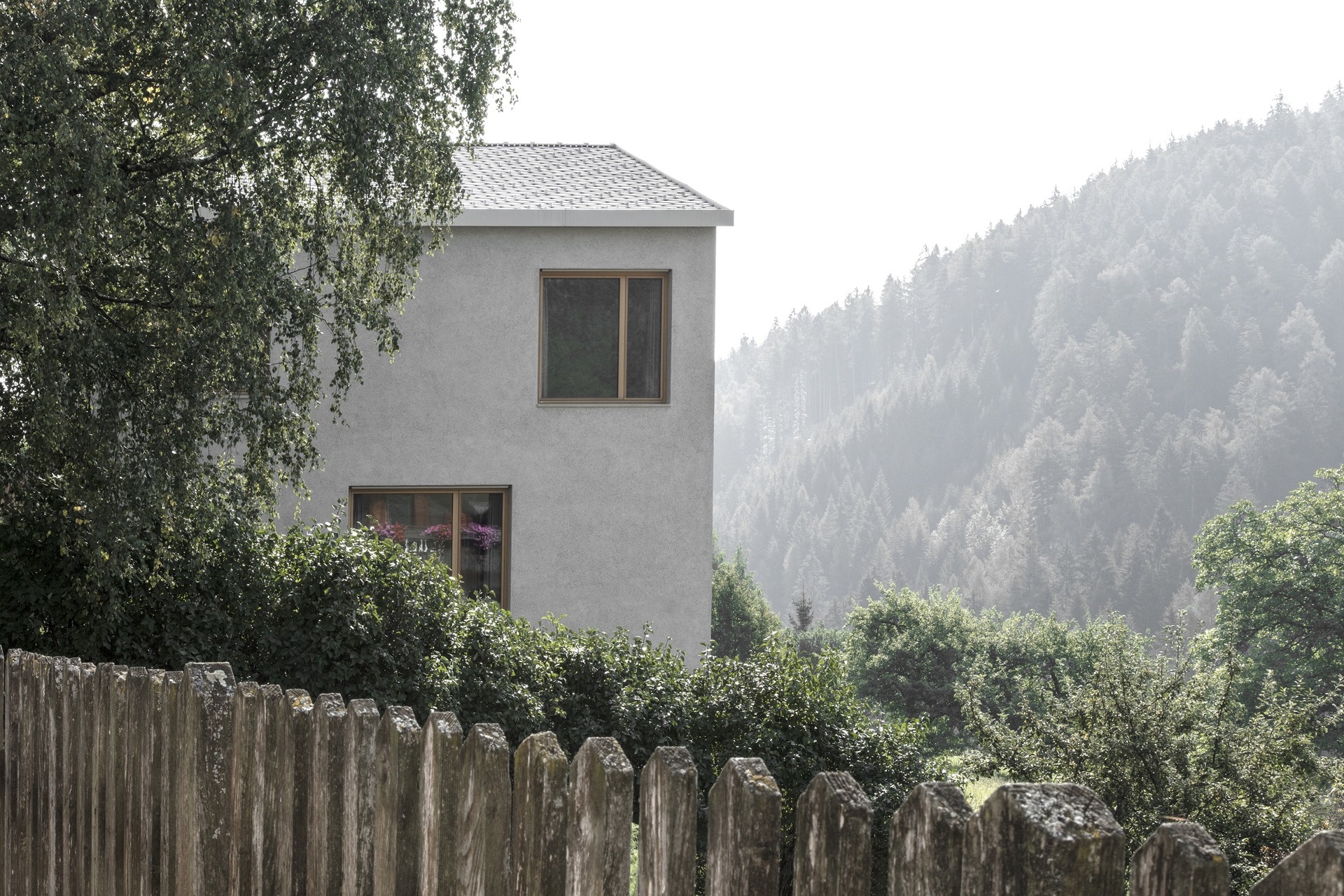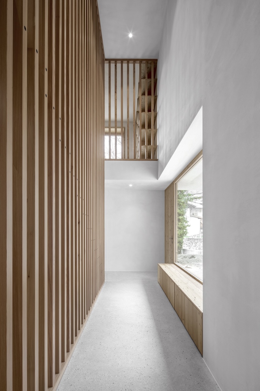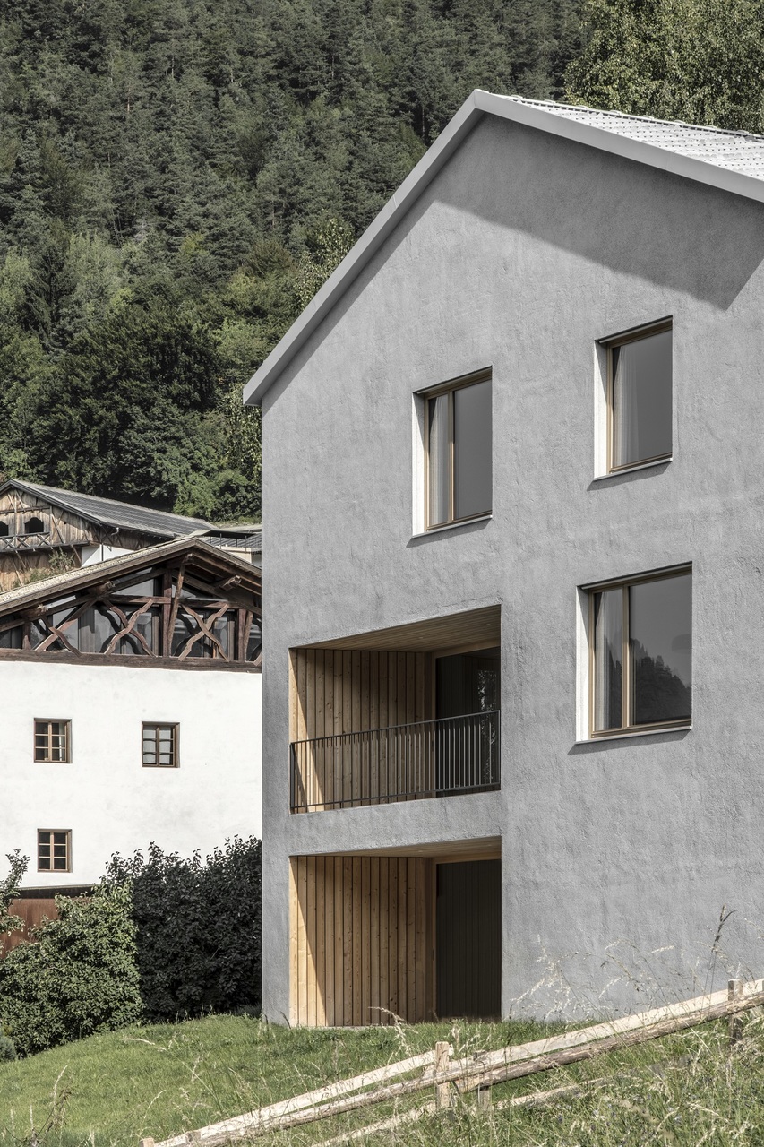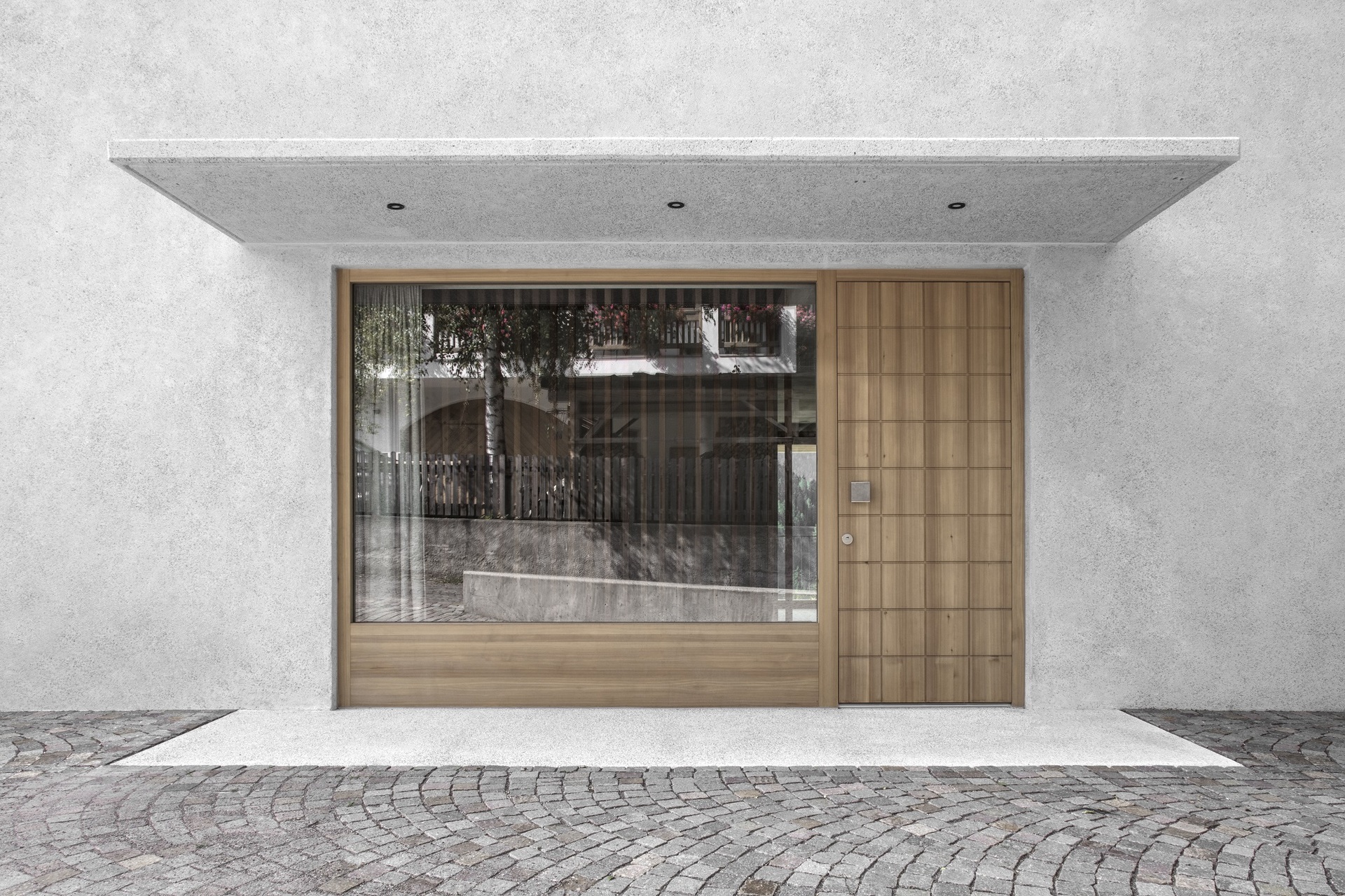 Im Inneren ermöglichen Sicht- und Kommunikationsbezüge das Erfassen des Gebäudes in alle seinen Dimensionen. Die Reduktion auf das Wesentliche zeigt sich auch hier in der Auswahl der Materialien: geglättete Putzoberflächen aus Lehm und Kalk mit Sandzuschlägen aus Dolomit und Porphyr, geschliffene Betonestriche mit Dolomitzuschlägen, Holzelemente aus lokalem Lärchenholz. (Text: Leicht gekürzter Text des Architekten)