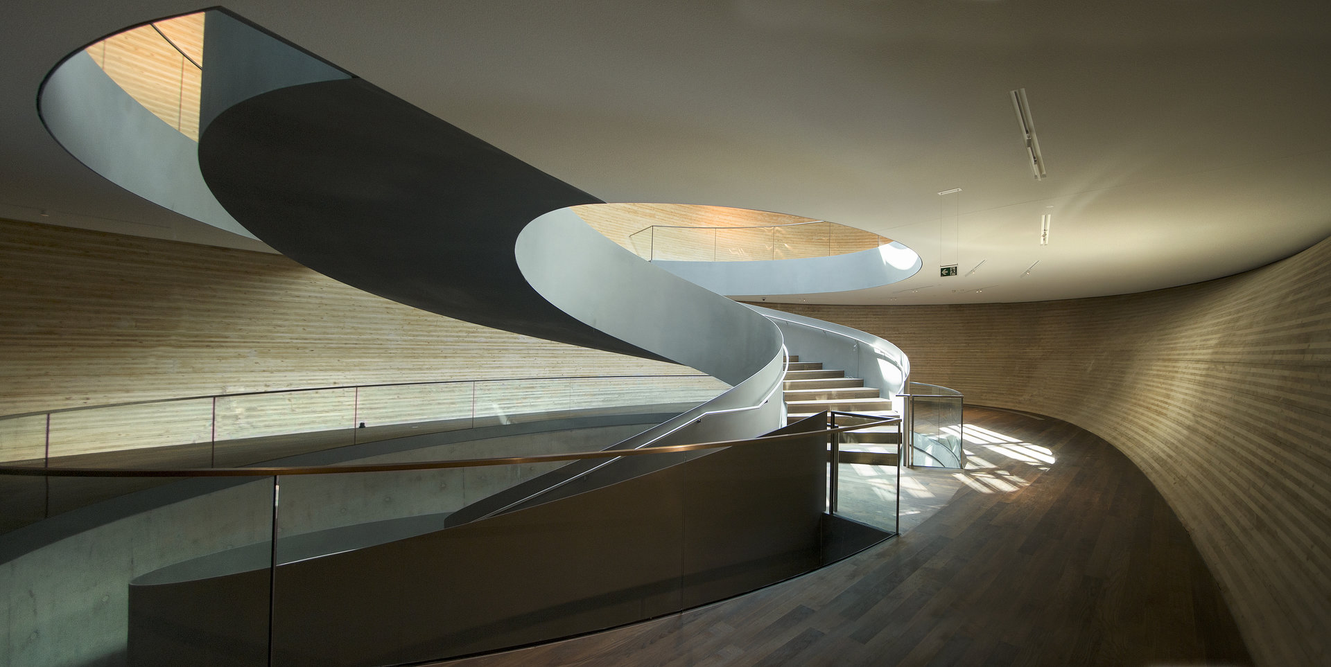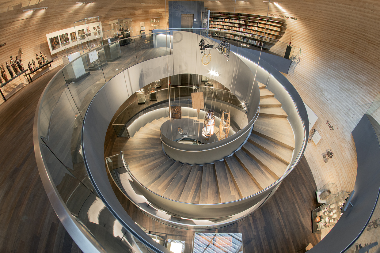 Die horizontale Schichtung von Brettsperrholz zur Konstruktion von freien Formen stellt nicht nur ein absolutes Novum im Holzbau dar, diese Art der Konstruktion ist derzeit wohl auch nur aus Holz möglich. Es entsteht ein äußerst spannender Raumeindruck, der so wohl einzigartig ist. Wie eine schützende Schale schmiegt sich das Holz um die ebenso liebevoll gestaltete Ausstellung und zeigt, wie ein frei geformter Entwurf durch digitale Fertigung Realität wird. (Jurytext Holzbaupreis Oberösterreich 2019)