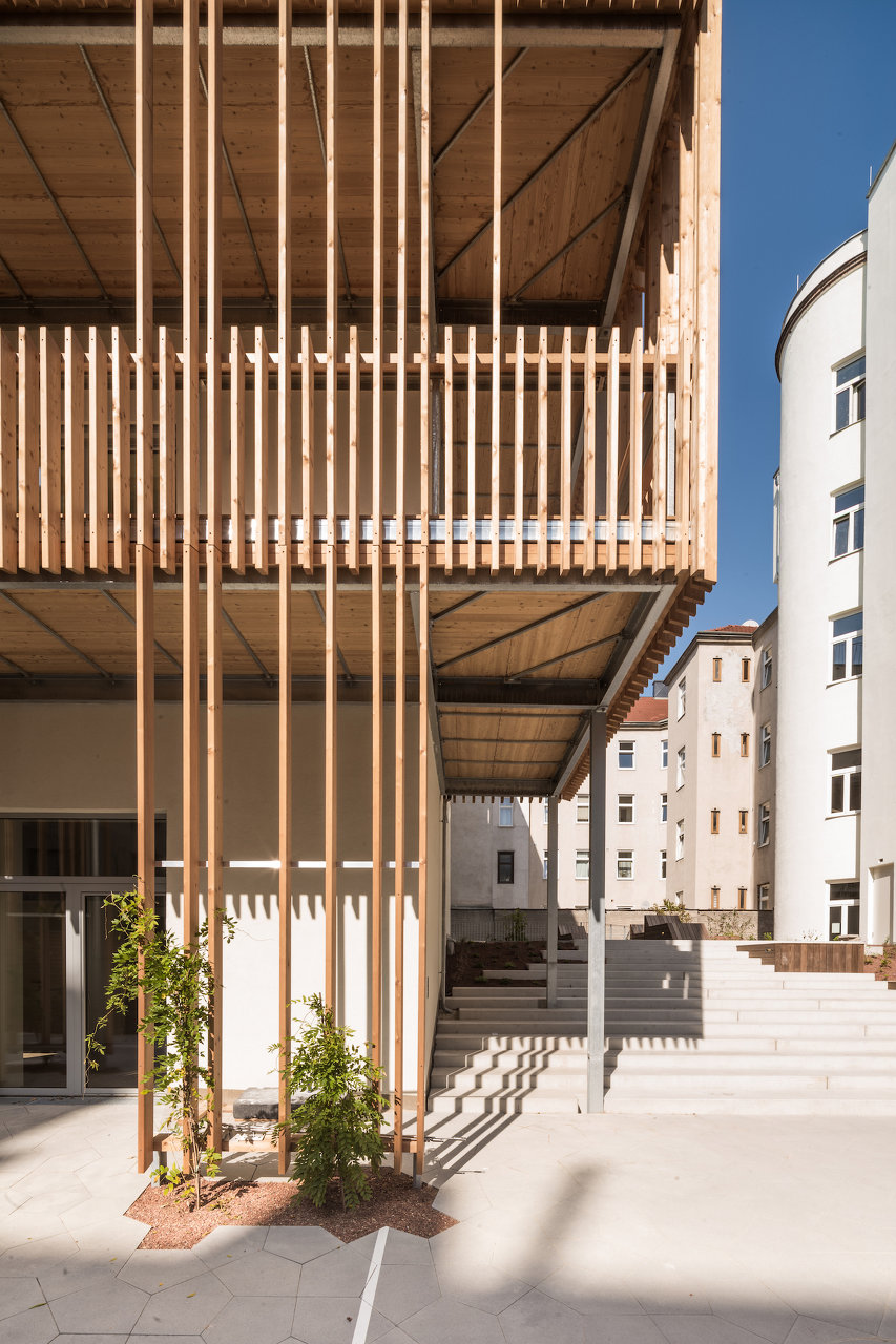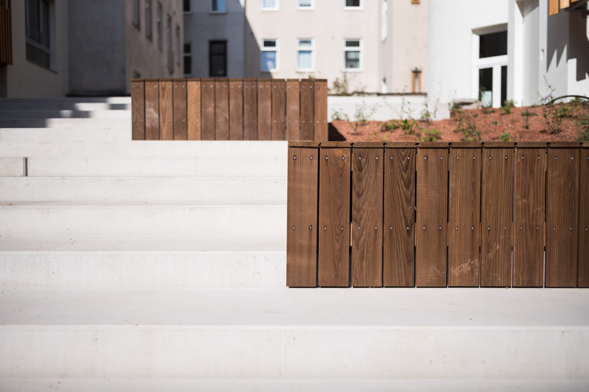 Die Altbautrakte wurden naturgemäß anders behandelt als die Neubauten, was der Harmonie keinen Abbruch tut. Vor die weißen Fassaden gestellte Stahl-Holz-Konstruktionen erweitern die Wohnungen großzügig ins Freie. Im Gegensatz zu den optisch wie haptisch härteren Neubaufassaden wirken sie wie Weichzeichner, was sich noch verstärken wird, sobald die Rankpflanzen hochgewachsen sind. Auch an der ruhigerenSchallergassenseite hat man sich bemüht, der Anlage keinen Hintaus-Charakter zu geben. Auskragende Balkone waren hier nicht möglich, dafür gibt es vorgehängte Pflanztröge, damit das Erdgeschoß nicht zu abgeschottet ist, öffnete es man mit einem großen horizontalen Fenster zur Straße.