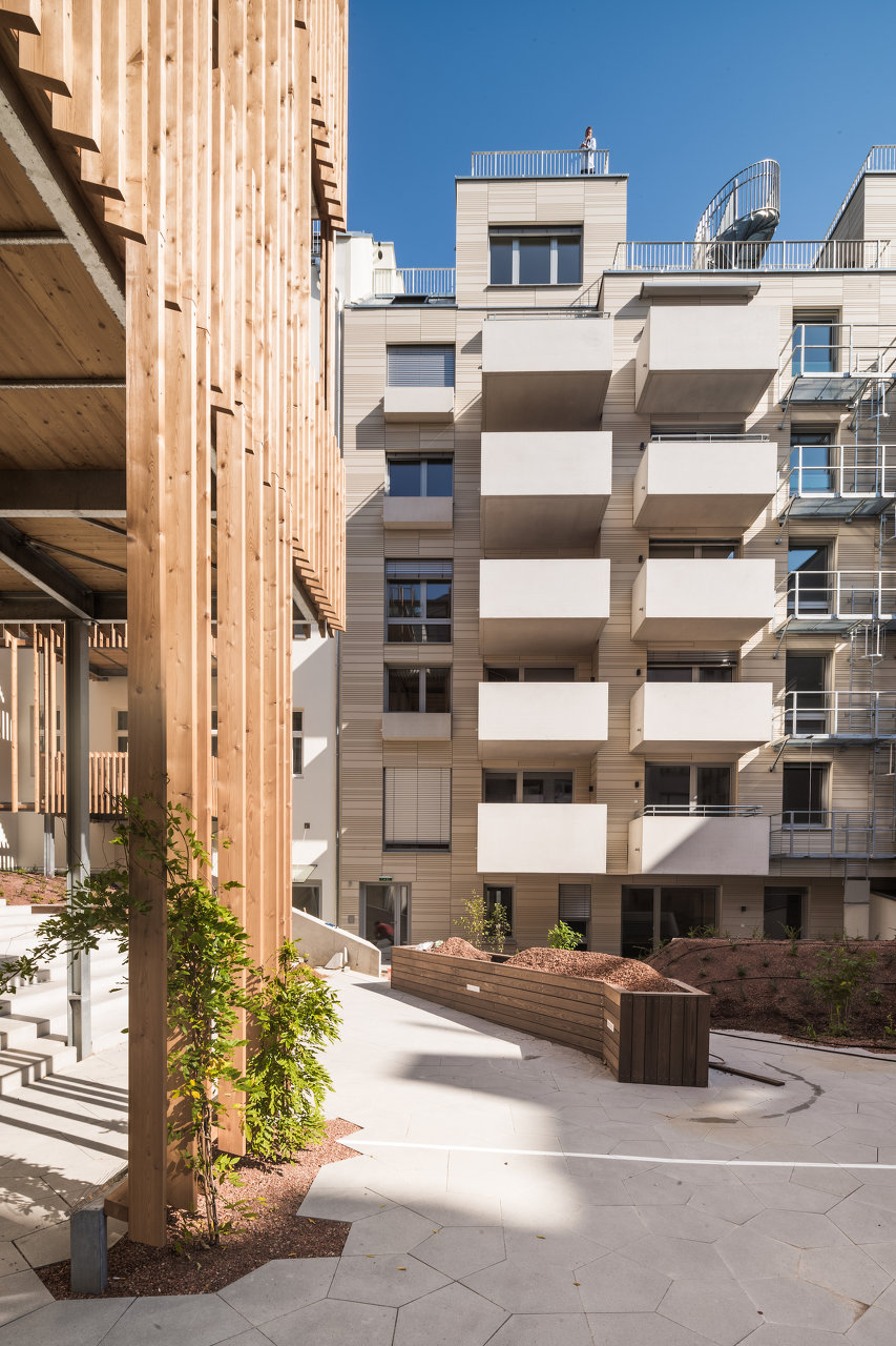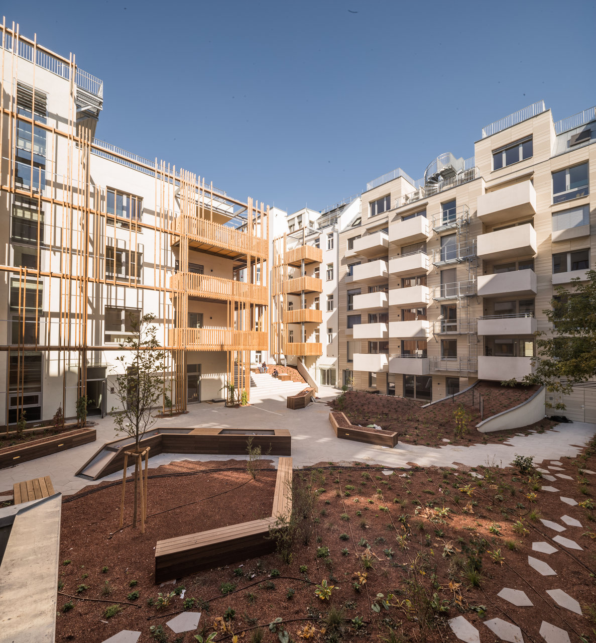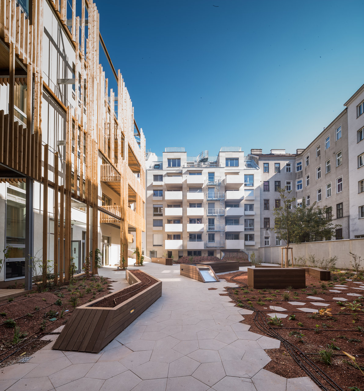 Balkone sind auch ein Hauptthema im Hof, wo die Fassaden der Neubauten ebenso hochwertig wie an der Straße ausgeführt wurden. Die Wiener Stadtgestaltungsmaxime, dass Stadtbild nur das sei, was man von der Straße aus sieht, fand also nicht Anwendung. Aus dem früheren, mit diversen Nebengebäuden, Abstell- und Rangierflächen zugebauten Hof wurde eine Parklandschaft mit Hochbeeten, Wasserbecken, Liegeflächen sowie einer Sitzstufenanlage. Dazu kommen noch kleinere gestaltete Freiräume wie der Hof des Büros oder der „verborgene Garten“ im Lichthof zur Tiefgarage. Davon profitieren nicht nur die Mieter und Eigentümer des Wolfshofs, sondern auch jene der benachbarten Häuser, für die das neue Ensemble Aussicht, Ambiente und Mikroklima verbessert.