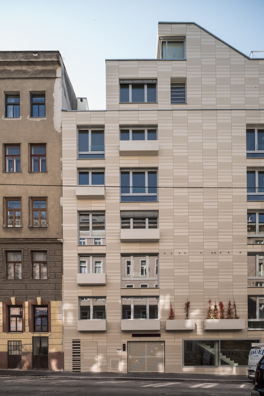 Der „Wolfshof“, so wurde es getauft, gibt sich schon aus der Ferne zu erkennen. Unterschiedlich weit ausgezogenen Schubladen gleich, strecken sich Balkone aus Betonfertigteilen mit integrierten Pflanztrögen oder Pflanztröge allein mehr oder weniger tief in die Luft über dem öffentlichen Gut der Wolfganggasse, als würden sie nach den Baumkronen greifen wollen. Im Erdgeschoß öffnen sich die Büros raumhoch verglast zur Straße und erhalten Sichtschutz durch einen langen Pflanztrog. Die Fassade wurde nicht in ein Wärmedämmverbundsystem gepackt, erstens weil man mit möglichst natürlichen Materialien arbeiten wollte, und zweitens weil der zwölfte Bezirk ein Ziegelbezirk ist, wovon zum Beispiel noch die nahe Remise der Badner Bahn, mit der einst die Ziegelöfen im Süden Wiens mit dem Zentrum verbunden wurden, Zeugnis ablegt. Daher griff man zu einer Dämmung aus Mineralwolle und einer Hülle aus Tonziegelpaneelen. In einem ähnlichen Farbton wie die Balkone gehalten und einem Verlegemuster aus gerillten und glatten Elementen entsteht ein schönes Hell-dunkel-Spiel, das durchaus Verwandtschaften zu historischen Wiener Fassaden aufweist. Denn auchdie waren stets überwiegend monochrom und in diversen hellen, steinfarbenen Tönen verputzt ausgeführt, womit sich auch bei vonHaus zu Haus unterschiedlichen Dekoren und Stilen ein einheitliches harmonisches Stadtbild erzeugen lässt. Es bleibt ein Rätsel, warum in Wien außerhalb der Schutzzonen dem bunten Patchwork, das so viel visuelle Unruhe verursacht, nicht beizukommen ist. Die Gerners haben jedenfalls verstanden, worauf es ankommt.