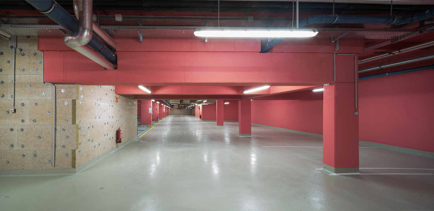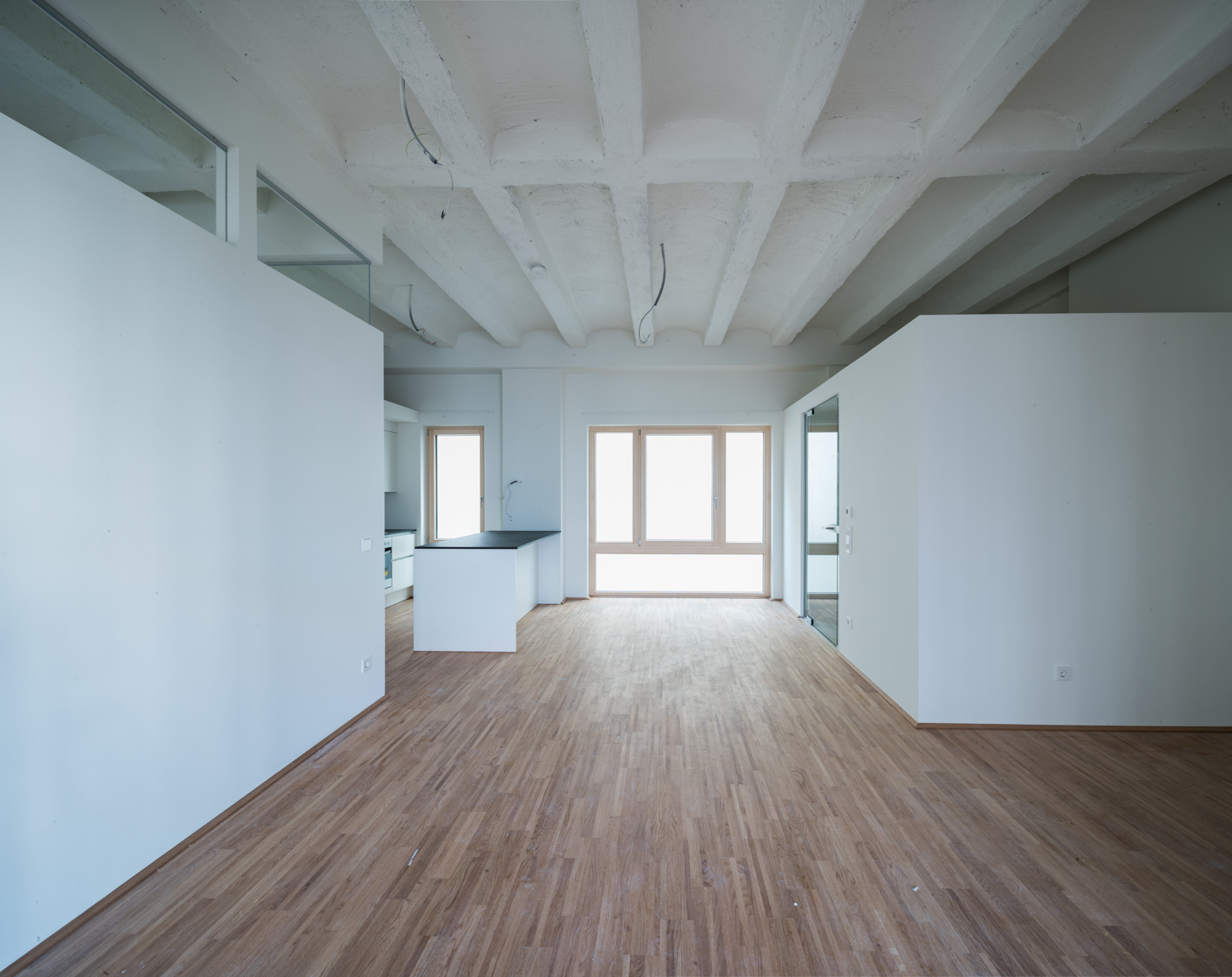 Sorgfalt im Detail, aber ohne zu kapriziöszu werden, kennzeichnet auch das Innere. Die 70 Wohnungen sind hochwertig und solide ausgestattet. Von besonderem Flair sind die Lofts im Altbau, wo die Ast-Molin-Rippendecken freigelegt wurden und die Sanitärzellen als niedrigere in den Raum gestellte Boxen den Grundriss gliedern, ohne die Großzügigkeit des Raumflusses zu unterbinden. Erwähnt seien noch ein riesengroßer Fahrradabstellraum und der geräumige Kinderspielraum mit Küche und Sanitärbereich,die zusammen mit dem Hof ein Angebot an gemeinschaftlichen Einrichtungen bereitstellen, wie es im üblicherweise zunächst aufRendite bedachten frei finanzierten Wohnbau in solchem Umfang und solcher Qualität äußerst selten ist.