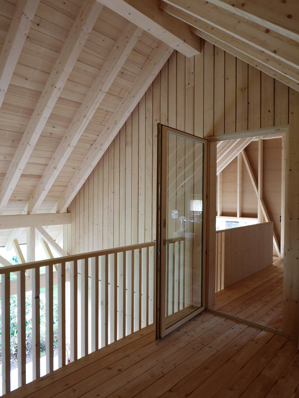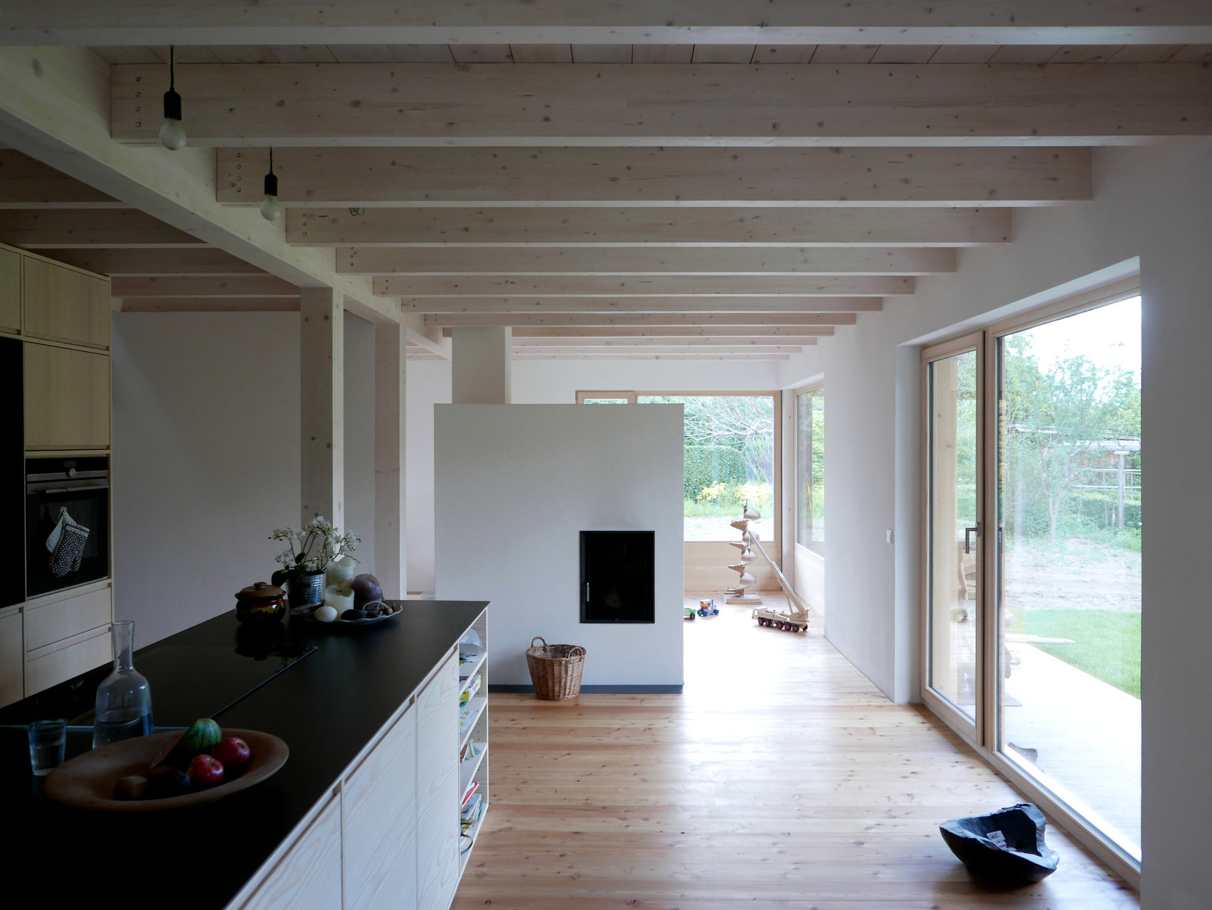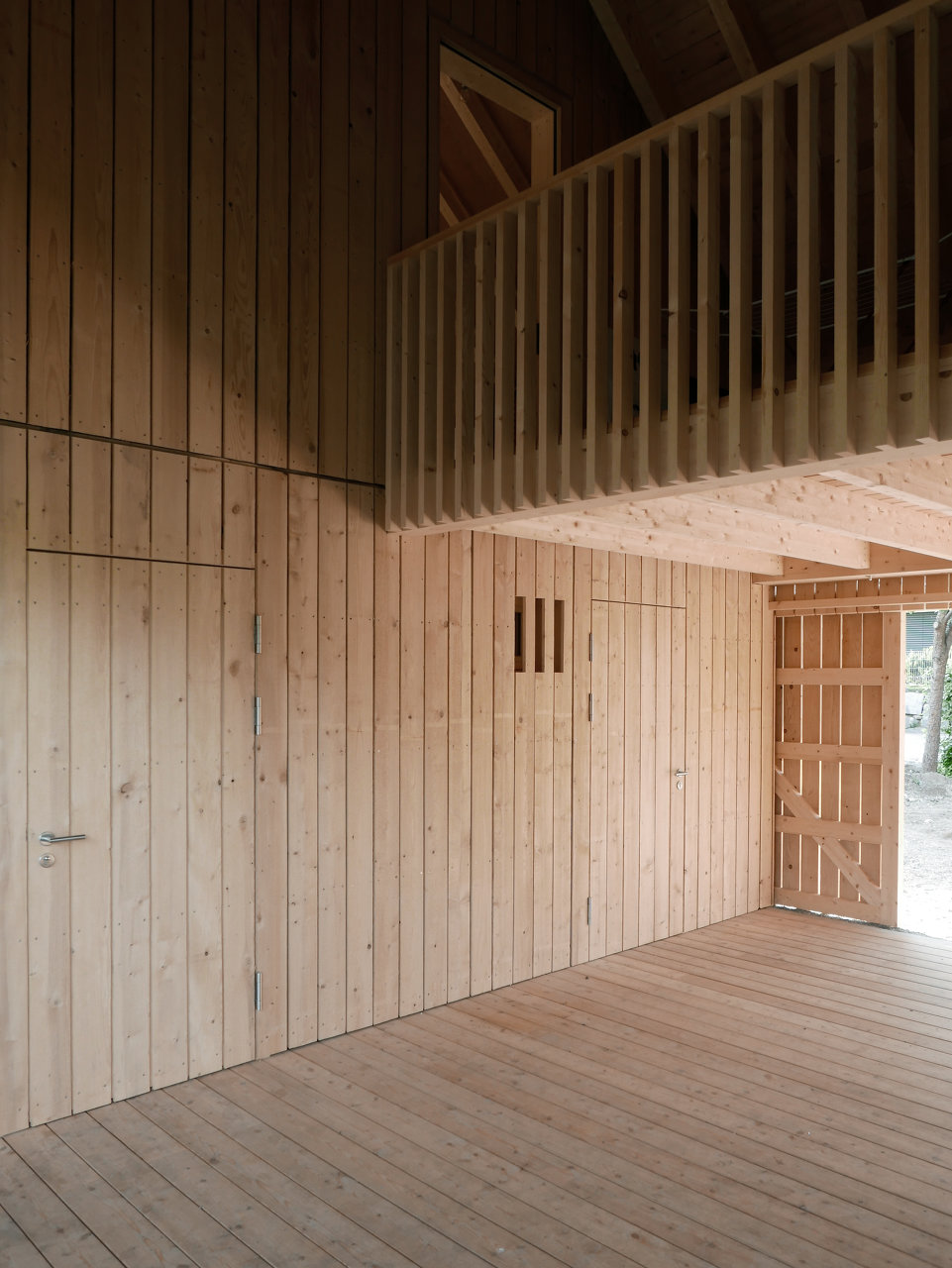 Der offene gedeckte Freiraum stellt den für die Familie wichtigen Bezug zum Garten und dem markanten zweistämmigen Nußbaum her. Das weit nach unten gezogene Vordach nimmt Bezug zum Stadl auf und gibt dem Haus seine für den Ort wichtige Maßstäblichkeit. (Text: Architekt:innen, leicht gekürzt)