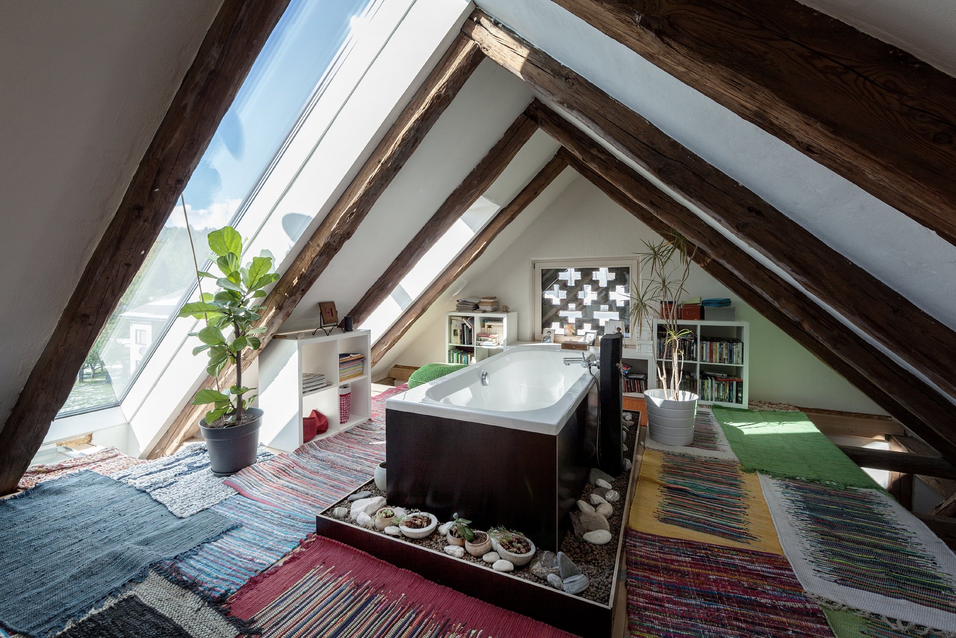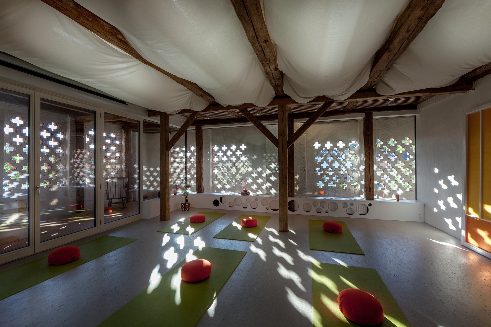 Der Bau aus dem 19. Jahrhundert war ursprünglich das Wirtschaftsgebäude des örtlichen Pfarrers, der hier Schweine und Kühe hielt. Der Bauherr, der auch selbst Architekt ist, baute diesen ehemaligen Kirchenstadel in eine Wohnung im Obergeschoß und ein Yoga-Studio im Parterre um.Über die Stadelbrücke betritt man das Gebäude. Die Wände wurden gegenüber der bestehenden Fassade zurückgerückt und mit einer raumhohen Verglasung ausgeführt. Damit entstand ein Laubengang, der auch als klimatische Pufferzone fungiert. Der Wohnbereich im nächsten Stockwerk ist bis in den First offen und bietet mit der ungewöhnlichen Raumhöhe viel Licht und Luft.