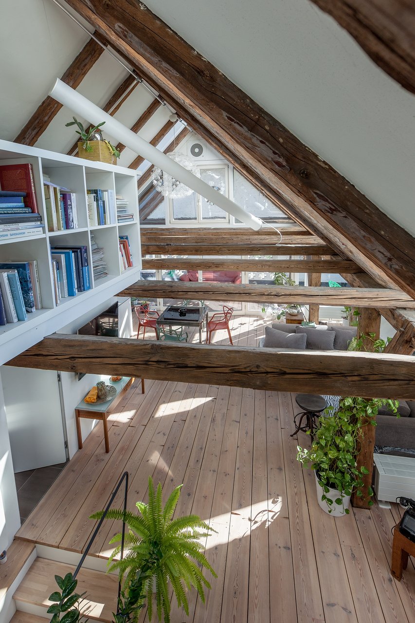 Die ursprünglichen Bodenpfosten wurden demontiert, aufgetrennt, gehobelt und geölt als Bodenbretter wieder eingesetzt. Holz findet man hier in verschiedenen Veredelungsgraden – von Massivholz bis Plattenmaterial.