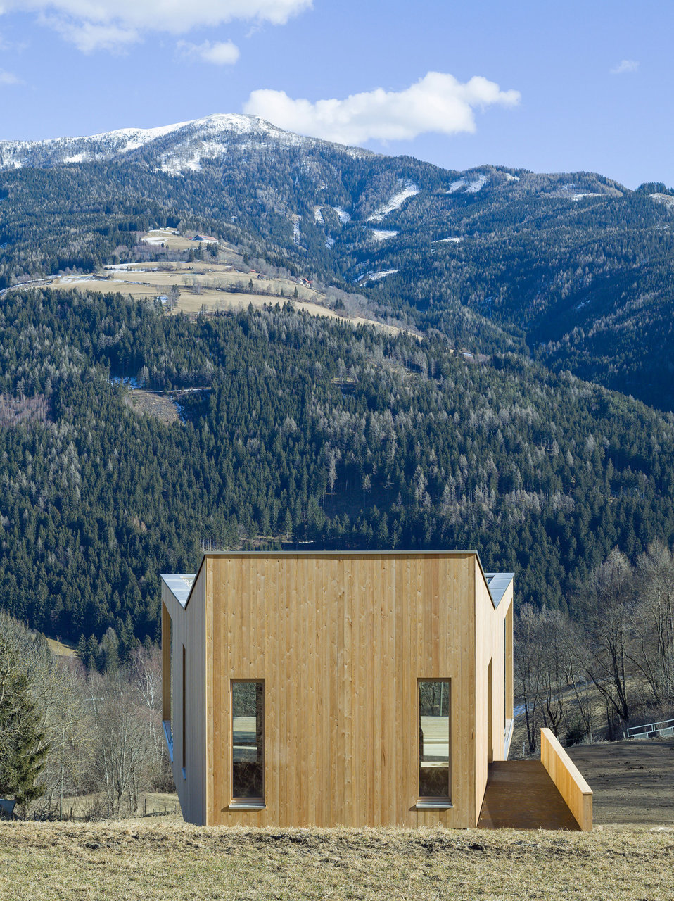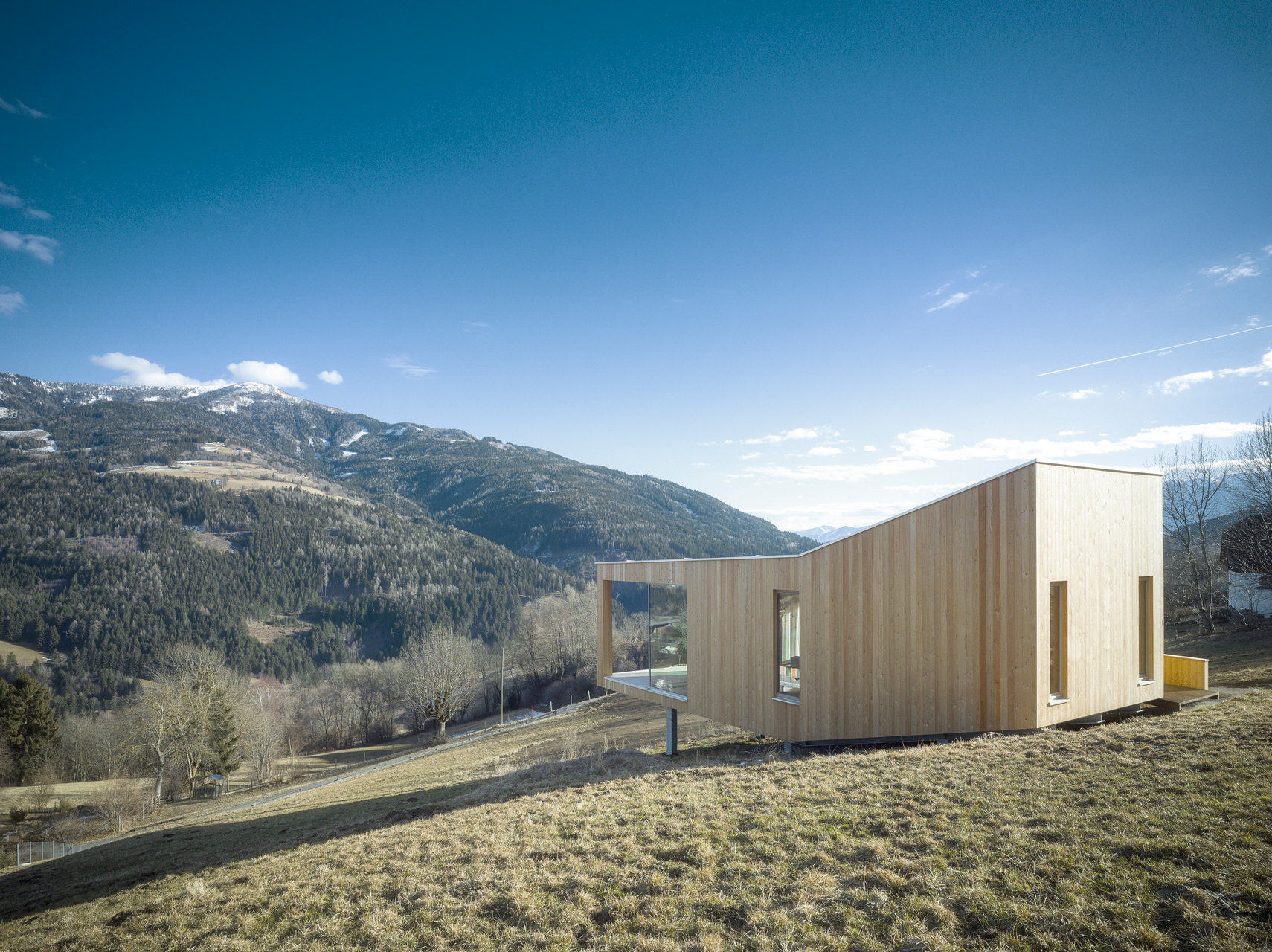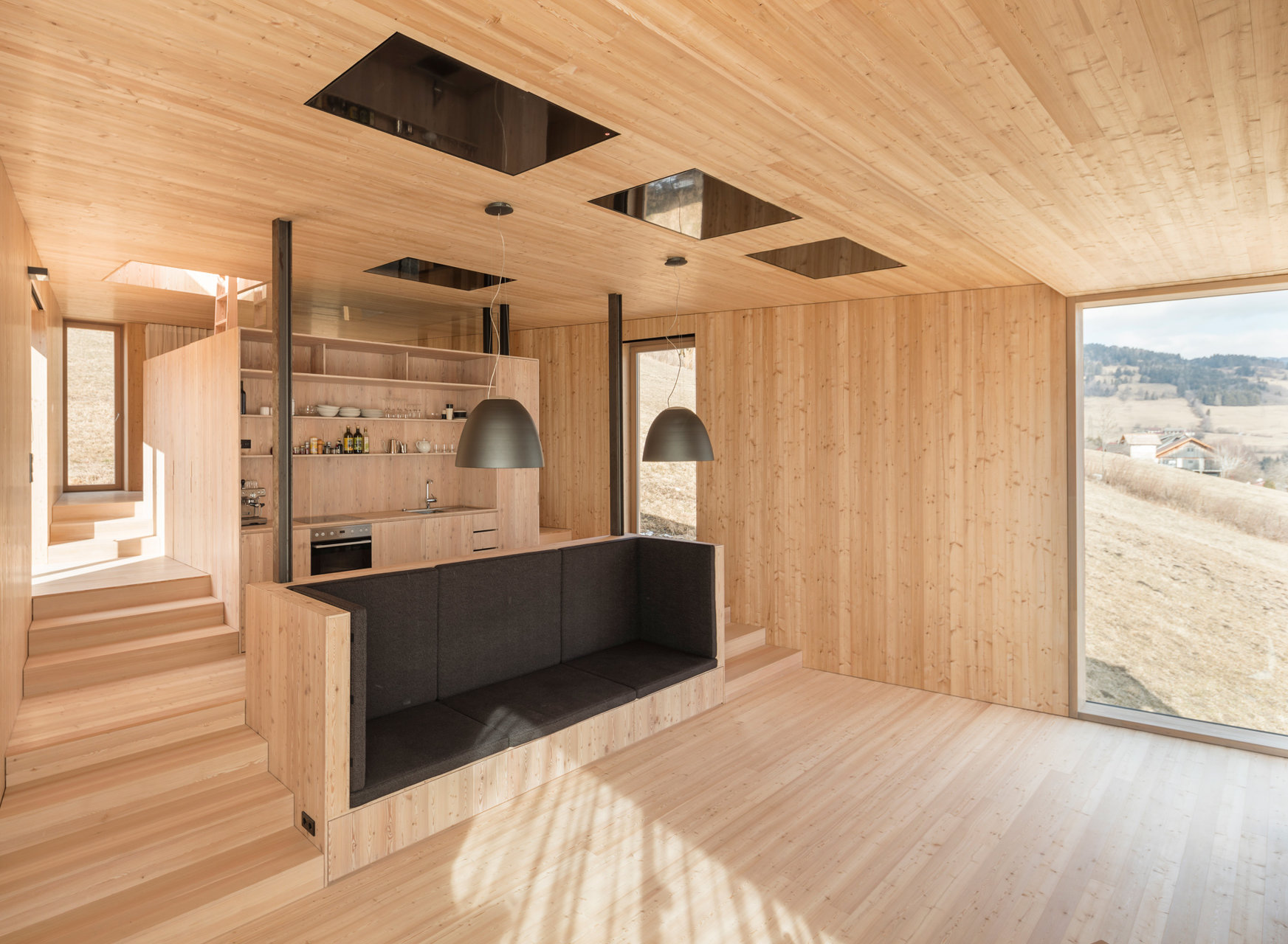 Alles an und in diesem Haus hoch über Trebesing wurde von den Bauherren, einem Architektenpaar, selbst entworfen. Die Tischlerei vom Ort hat das Interieur umgesetzt. Alle zusätzlichen Elemente, die nicht aus Holz gefertigt wurden, sind anthrazitfarben oder schwarz. Auf kleinstem Raum ist alles da: Wohnen, Essen Schlafen. Und das Dach, das man über eine Leiter erklimmt, ist die Aussichtsterrasse mit einem wunderbaren Blick übers Tal. Auf dem Grundstück, das auch heute noch ein Kuhwiesenhang ist, hat die Bauherrin als Kind viel Zeit verbracht und besitzt daher eine besondere Beziehung zu diesem Ort.Jury: Ein einfacher, kubischer Baukörper sitzt aufgeständert auf einer stählernen Unterkonstruktion inmitten einer unberührten Bergwiese. Die Funktionen sind gekonnt entlang der Hangneigung gestaffelt und in einem offenen Raumkonzept mit der nötigen Großzügigkeit umgesetzt. Die Ausführung der Holzarbeiten erfolgte mit sehr viel Liebe zum Detail und handwerklichem Können. Ein bemerkenswertes Beispiel zum Thema Bauen in den Alpen, bei dem einzig der Umgang mit den Baulandressourcen etwas zu hinterfragen bleibt. (Jurytext Holzbaupreis Kärnten 2017)
