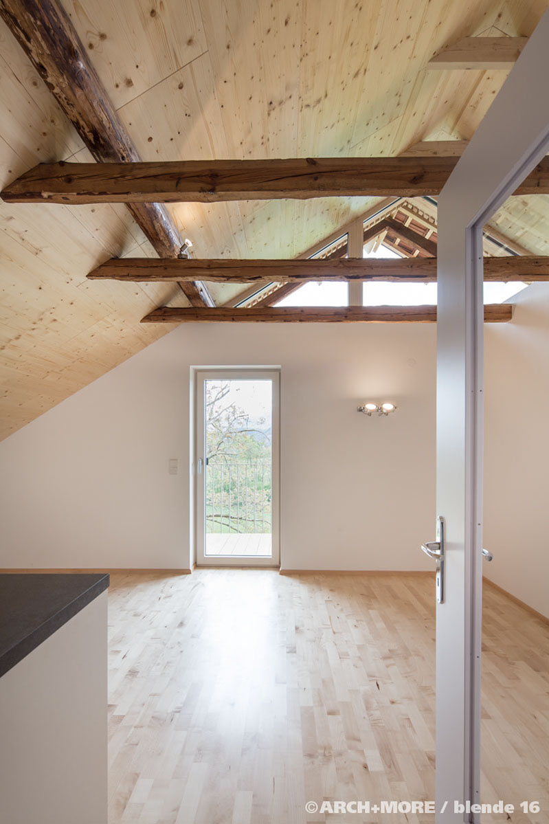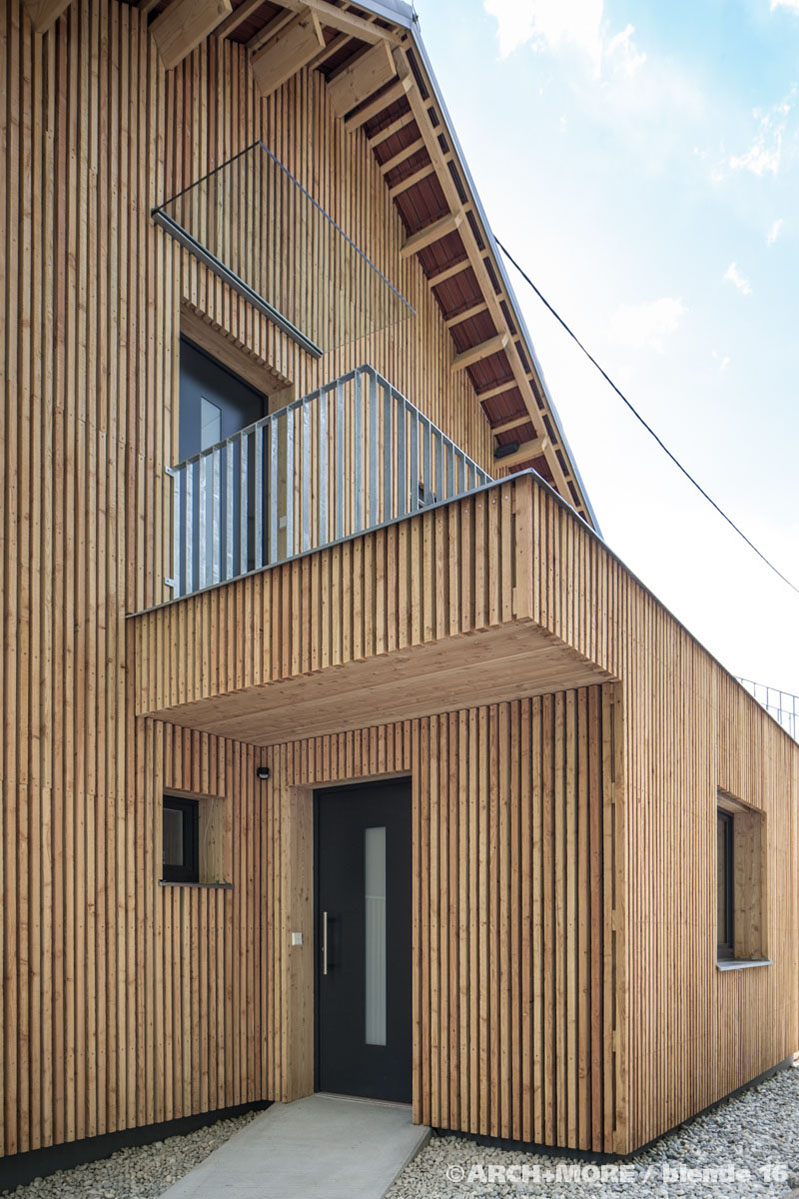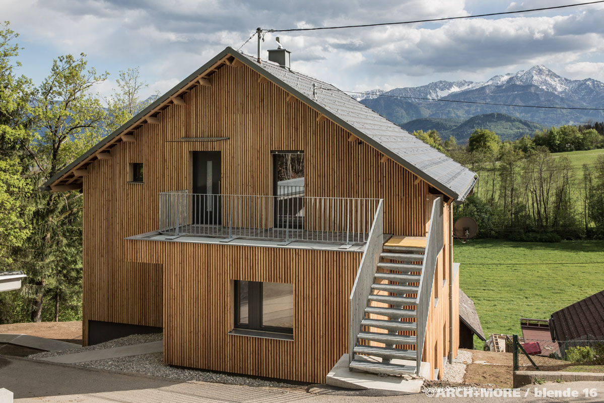 Ausgangspunkt war ein Einfamilienhaus aus den 1950er Jahren, das in leichter Südhanglage am Waldrand etwas außerhalb von Velden steht. Der Architekt baute den Bestand zu drei kleinen Wohnungen um, die allesamt getrennte Eingänge haben. Hauptaugenmerk lag nicht auf einer einfachen Sanierung, sondern auf der Umsetzung einer Strategie: Einfachheit und nachhaltiger Umgang mit dem Vorhandenen.Jury: Ein in die Jahre gekommenes kleines Wohnhaus war der Ausgangspunkt für eine vorbildliche Revitalisierung und Umnutzung in drei kleine Wohneinheiten. Alle drei übereinander gestapelt und nunmehr von außen erschlossen, sodass durch den Wegfall der Innentreppe mehr Wohnraum bleibt. Das Ergebnis ist leistbares Wohnen mit hoher Qualität und zeitgemäßem Energiestandard. (Jurytext Holzbaupreis Kärnten 2017)