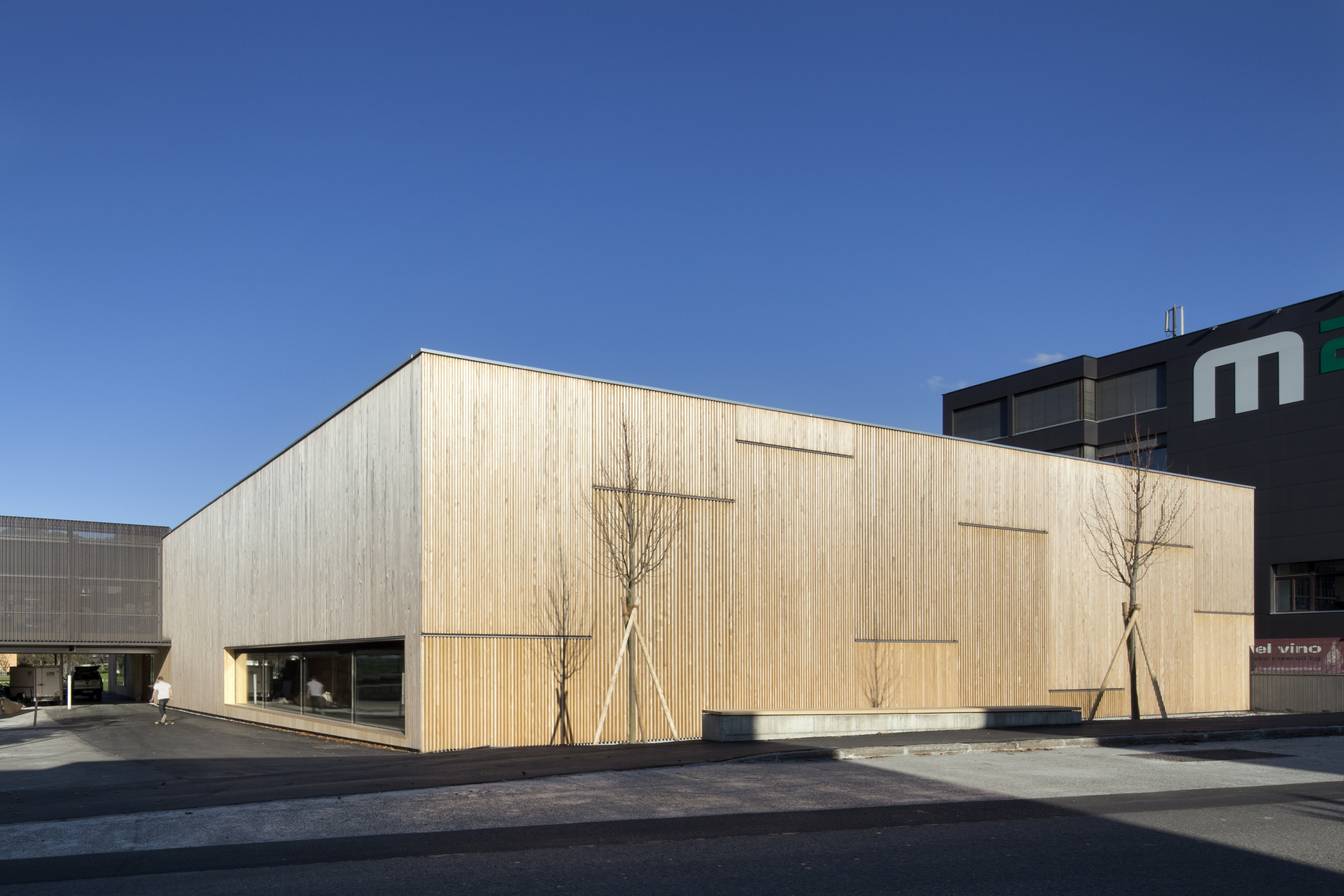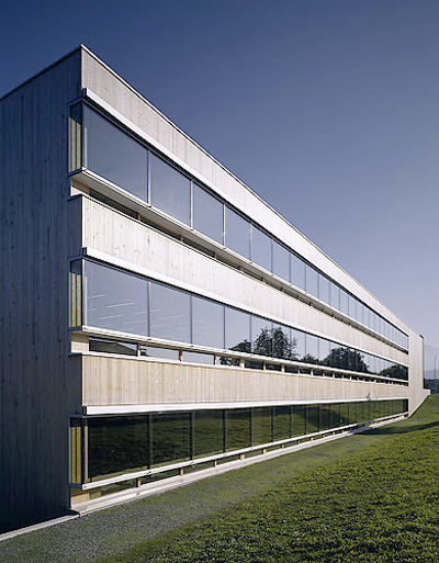 Angesichts des engen Zeitrahmens, einer strengen Kostenvorgabe und der geringen Belastbarkeit des Untergrunds wurde ein Holzbau mit vorgefertigten Elementen konzipiert. Durch sein geringeres Gewicht konnte eine aufwändige Pilotierung vermieden werden. Die Bedenken des Bauherrn bezüglich der akustischen Eigenschaften von Holzkonstruktionen wurden anhand von vergleichbaren Projekten (z.B. die Erweiterung des Klosters Mehrerau in Bregenz von Kaufmann und Lenz) ausgeräumt. Die bauphysikalischen Vorteile des Holzbaus ließen in der Planungsphase einen Passivhausstandard in greifbare Nähe rücken. Mit geringem finanziellen Mehraufwand konnte der zu erwartende Heizwärmebedarf unter die magische Grenze von 15 kWh⁄ m2 Geschossfläche und Jahr gedrückt werden. Mittels einer kontrollierten Be- und Entlüftung samt Wärmerückgewinnung und Vorkonditionierung in einem dreilagigen Erdregister wird nun beheizt und gekühlt. Der kontinuierliche Luftwechsel sorgt ununterbrochen für optimale Sauerstoffkonzentration und Lufthygiene. Die Brennwertgastherme zur Nachheizung wird in der zweiten Baustufe durch eine für Bestand und Neubau gemeinsam nutzbare Biomasseheizung (Hackschnitzel) ersetzt werden.