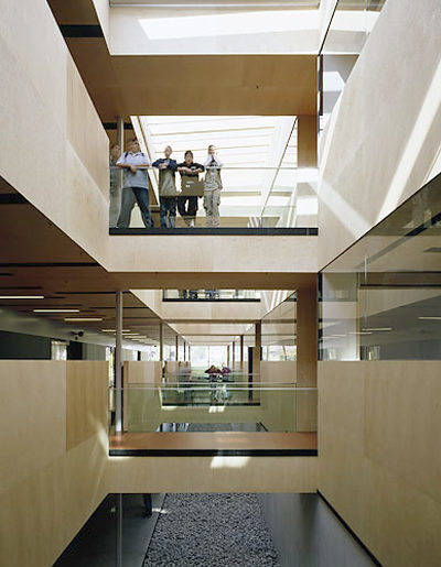 Um Missbrauch oder technischen Fehlern (Fehlalarmierungen der Feuerwehr) vorzubeugen, wurde eine Interventionsschaltung an der automatischen Brandmeldeanlage vorgesehen. Ein Alarm aus einem automatischen Brandmelder löst zwar interne Alarmeinrichtungen aus, gibt aber einer geschulten Person zwei Minuten Zeit, den Alarmgrund zu überprüfen. Bei Vorliegen von Fehl- bzw. Täuschungsalarmen erfolgt eine Alarmrückstellung, ansonsten die Weiterleitung zur Feuerwehr. Durch die automatische Sprinkleranlage wird ein mögliches Brandereignis begrenzt bzw. eingedämmt. Die beiden Stiegenhäuser und der Querriegel zur Straße wurden als eigenständige Brandabschnitte ausgeführt, die Fluchtstiegenhäuser und die Wandkonstruktion im UG in Stahlbeton gefertigt. Alle anderen tragenden Bauteile sind brandhemmend (F 30) ausgeführt. Sofern aus Holz, wurden sie mit zusätzlicher Sicherheit dimensioniert und bleiben auch nach einem kalkulierten Abbrand von 18 mm tragfähig (Deckenuntersichten aus Brettschichtholz und Leimholzstützen). Die Holzstützen im Innenbereich sind durch eine GKF-Verkleidung abgeschirmt. Aus gestalterischen Gründen wurden im Gangbereich schlanke Stahlstützen eingesetzt, die mit einem aufschäumenden Brandschutzanstrich versehen wurden. Dieses Beispiel zeigt, dass eine spezifische Konzeption von Brandschutz nicht zur kostenintensiven Nachbesserung von Materialien geraten muss, sondern unter der Voraussetzung einer frühzeitigen Einbindung von Spezialisten aus Brandschutz, Haustechnik und Statik durch eine gesamtheitliche Betrachtungsweise Synergien und Qualitäten erst zur Entfaltung bringt.