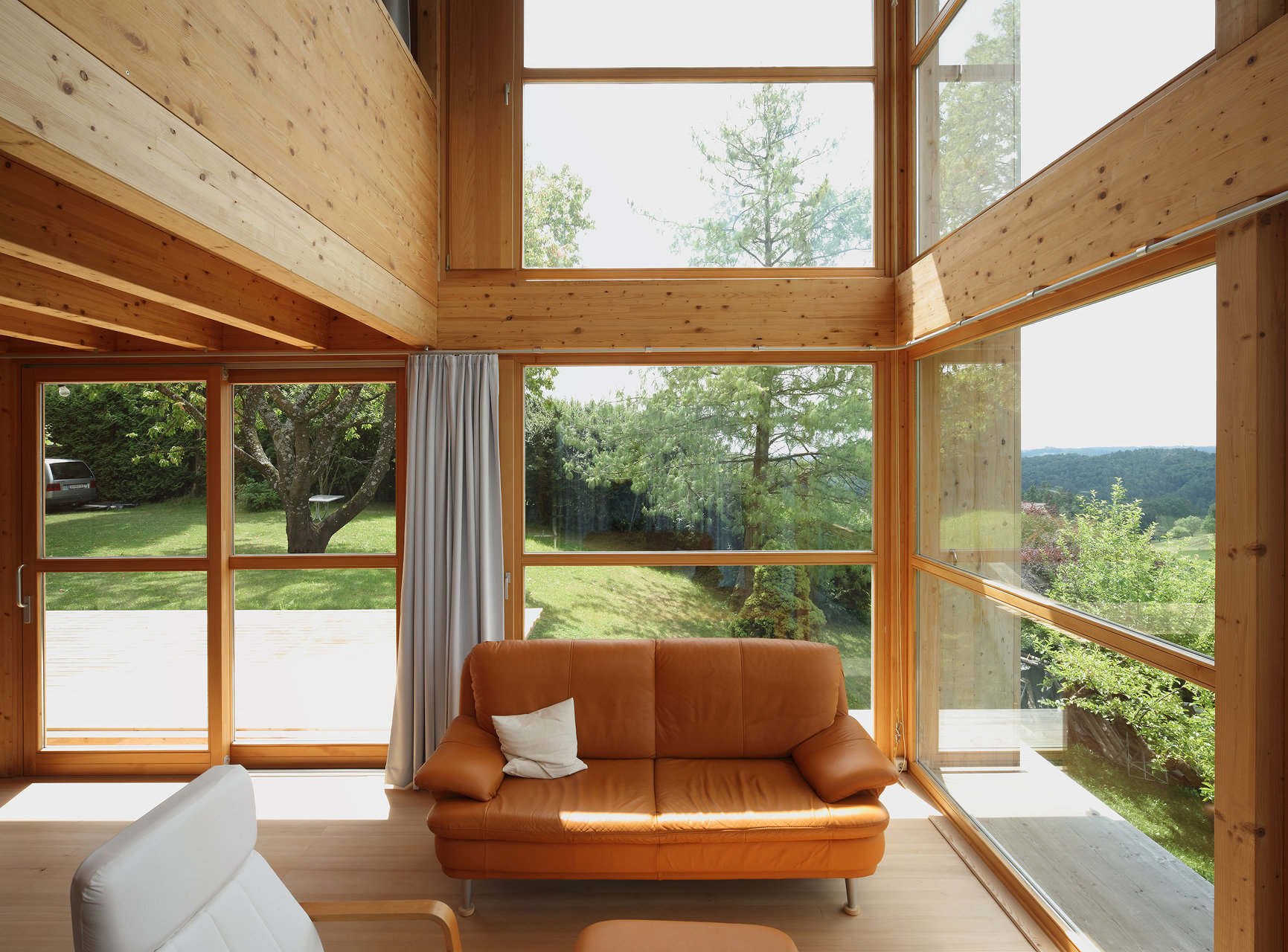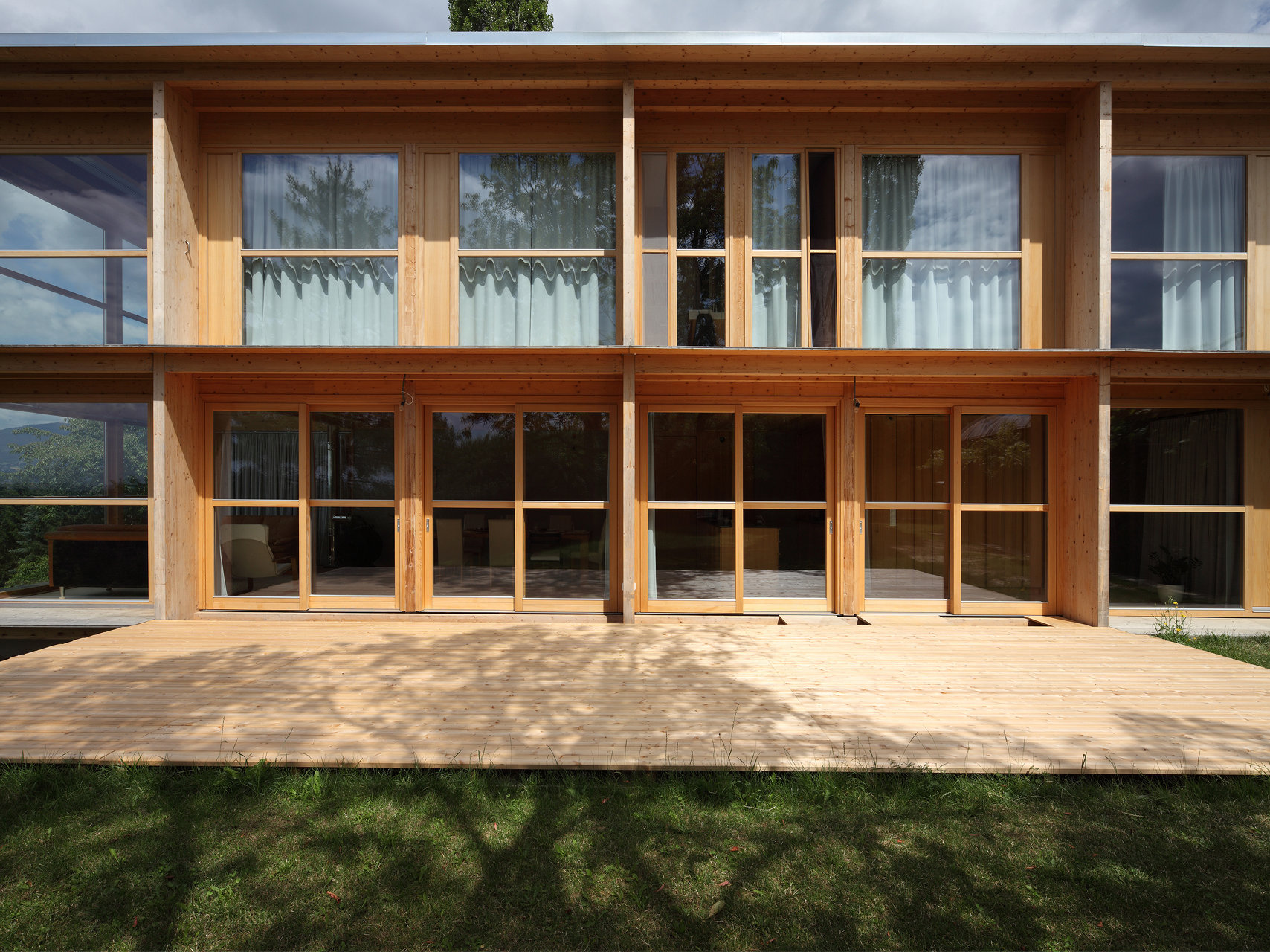 Das Haus baut sich aus breiten, vertikalen und horizontalen Balken auf. Die raumhohen Fensterflächen in beiden Stockwerken bieten den Bewohnern quasi ein Leben in der Natur. Tragendes Material ist Fichte, eingerichtet wurden die Räume mit Tanne.Jury: Das Haus besticht durch seine klare rechteckige Bauform und Gliederung , und die konsequente Verwendung von Holz in der Konstruktion und im Innenbereich. Intelligente Rahmenlösung, welche eine interessante Optik ergibt, und durch die tiefen Leibungen den baulichen Holzschutz der Fassade samt der Fensterkonstruktionen gewährleistet. (Jurytext Holzbaupreis Kärnten 2017)