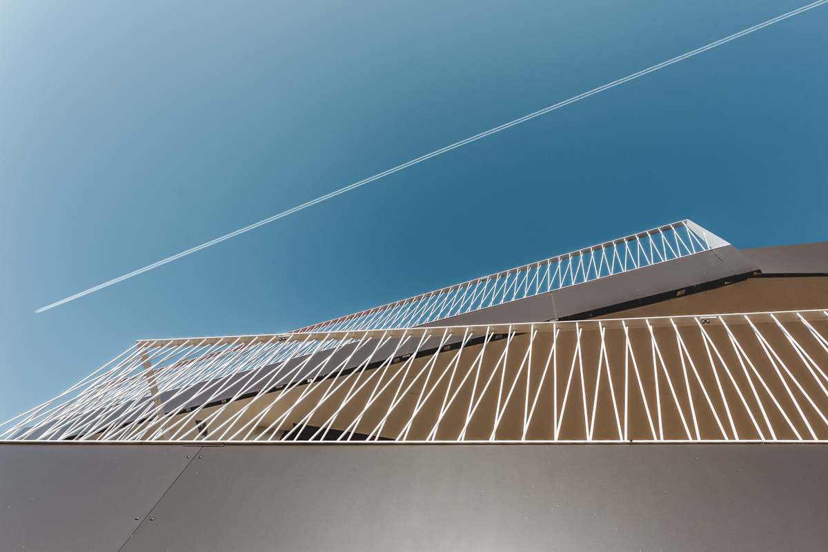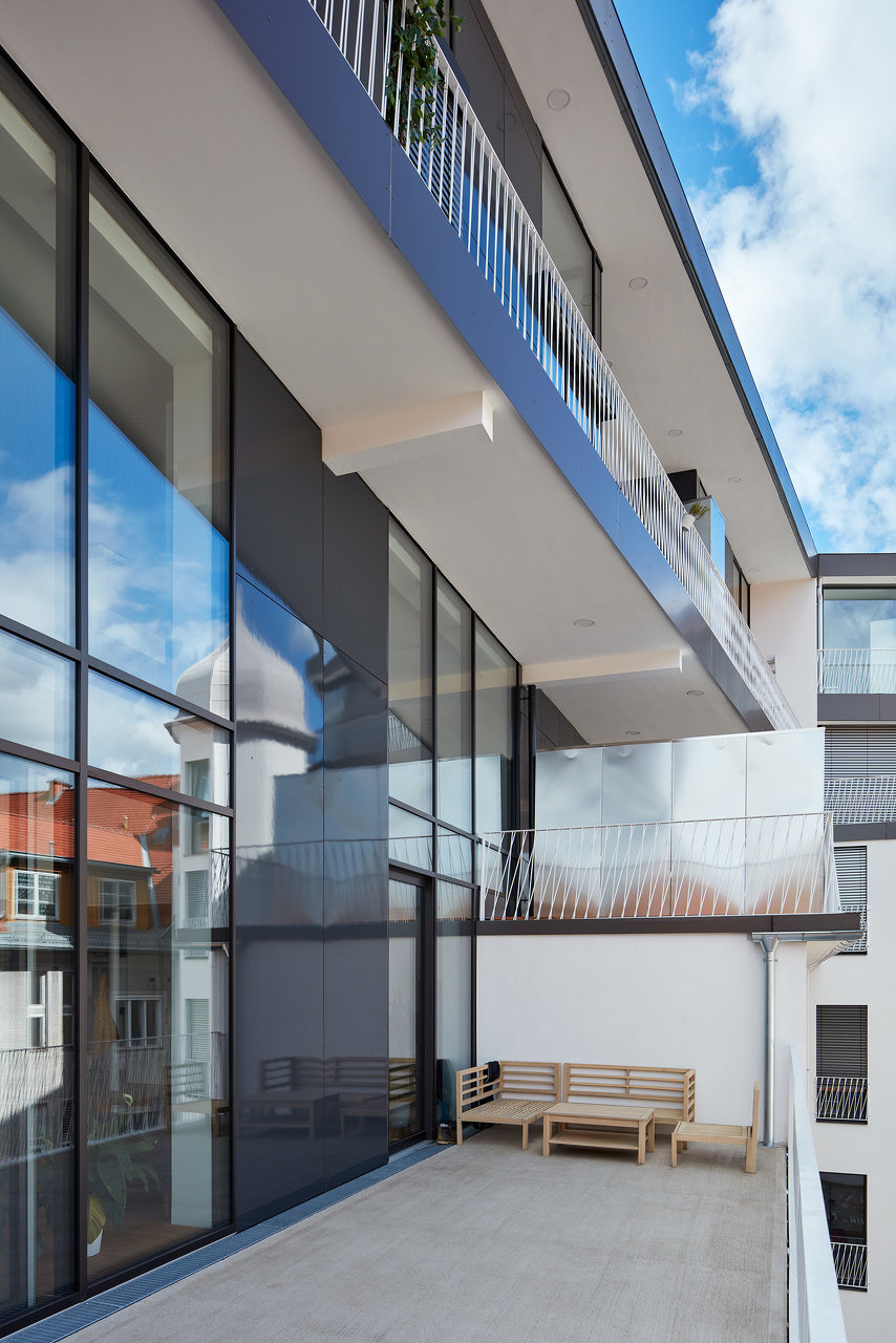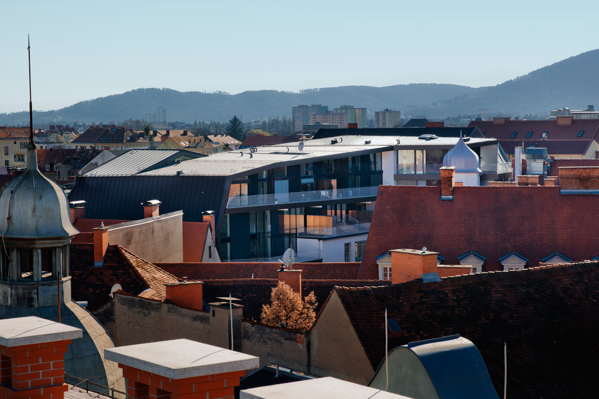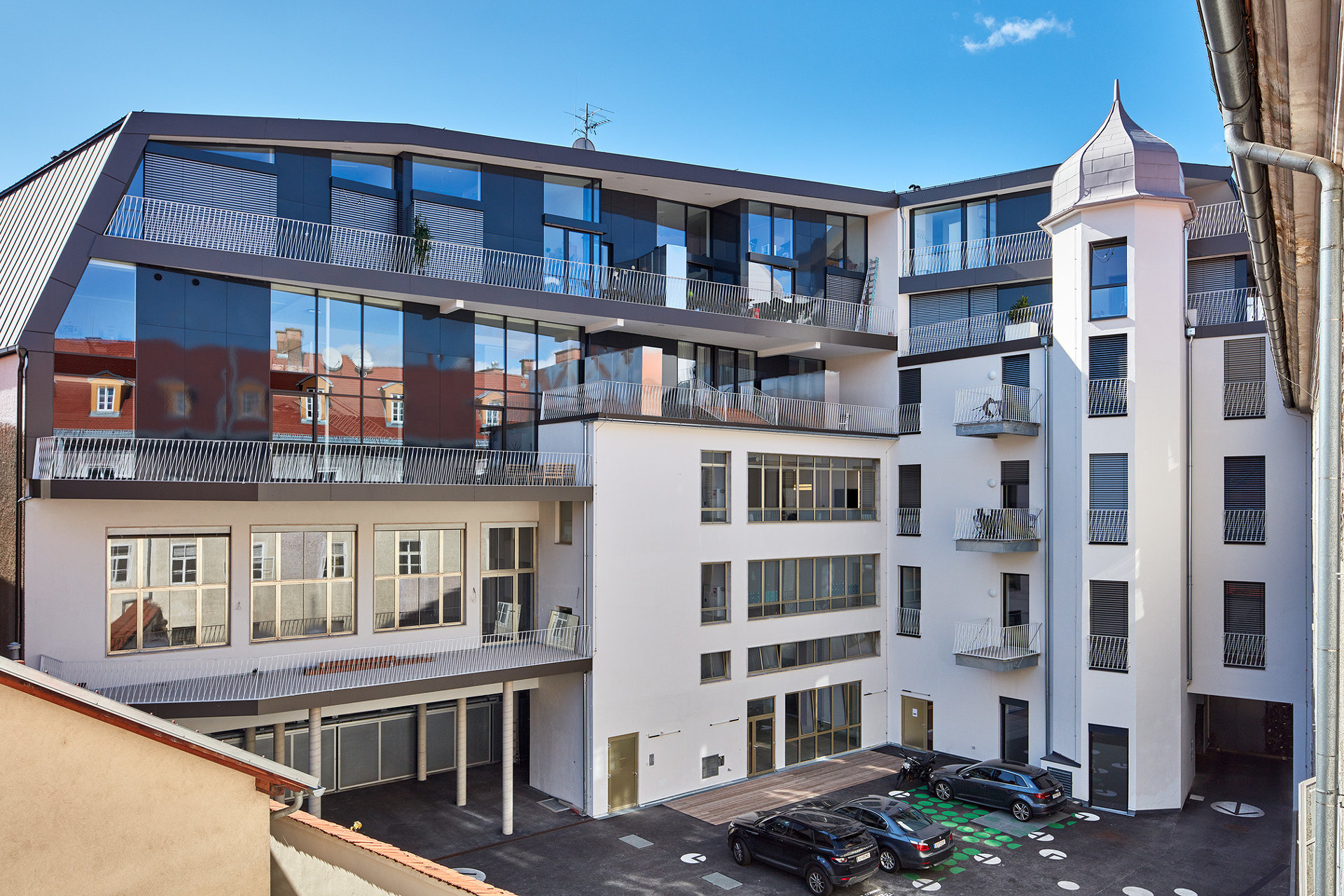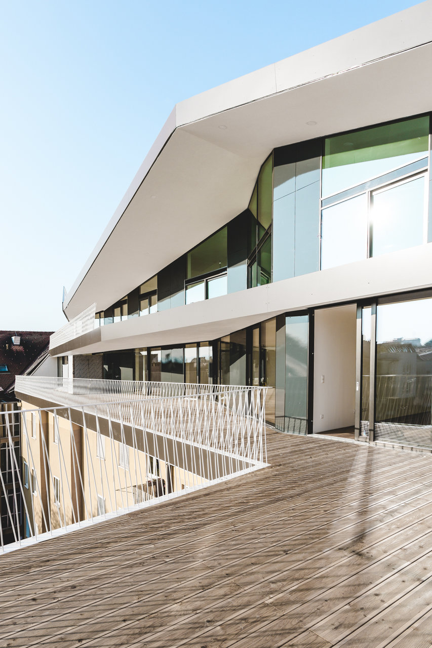 Das Penthouse wird an der Jakoministraße zweigeschossig auf das bestehende Gebäude aufgesetzt, und setzt sich im Hof eingeschossig fort. Das letzte Bestandsgeschoss, das 3. Obergeschoß, wird auf die Raumhöhe von 2,50 m reduziert. Die Dach- und Fassadenflächen falten sich auf und bilden eine Dachskulptur, wobei an der Jakoministraße, wo sich der Aufbau in die Reihe der traufständigen Dächer eingliedert, ein geschlossener Charakter entsteht als an den übrigen Seiten. Die Silhouette an der Jakoministraße bleibt annähernd gleich der Bestandsdachkontur. (Text: Architekten)
