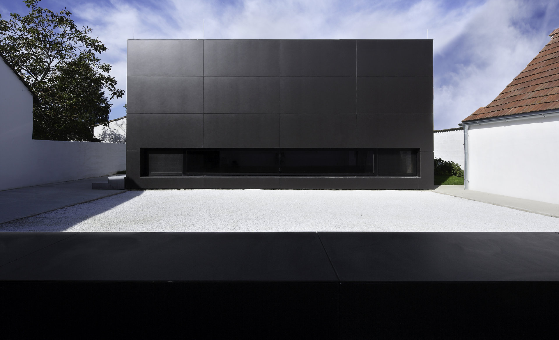 Die Lage des Kontrabasshauses ist in einem Hinterhof der dort typischen L-winkeligen Bebauungen. Es muss eine Kompensation dafür leisten, dass es so eine prominente Stellung im Hof einnimmt. Dafür, dass es dem Hof, Platz wegnimmt, muss es ihm auch etwas wiedergeben, dies geschieht in Form einer kleinen Plaza, einer von drei Seiten einsichtbaren und begehbaren Fläche aus Mamorkies. Durch diese kleine Plaza fungiert diese als Tableau oder Bühne für das eigentliche Gebäude und bindet bzw. beherrscht so etwas wie ein eigenständiges Territorium innerhalb der Masse, der umstehenden Gebäude.
