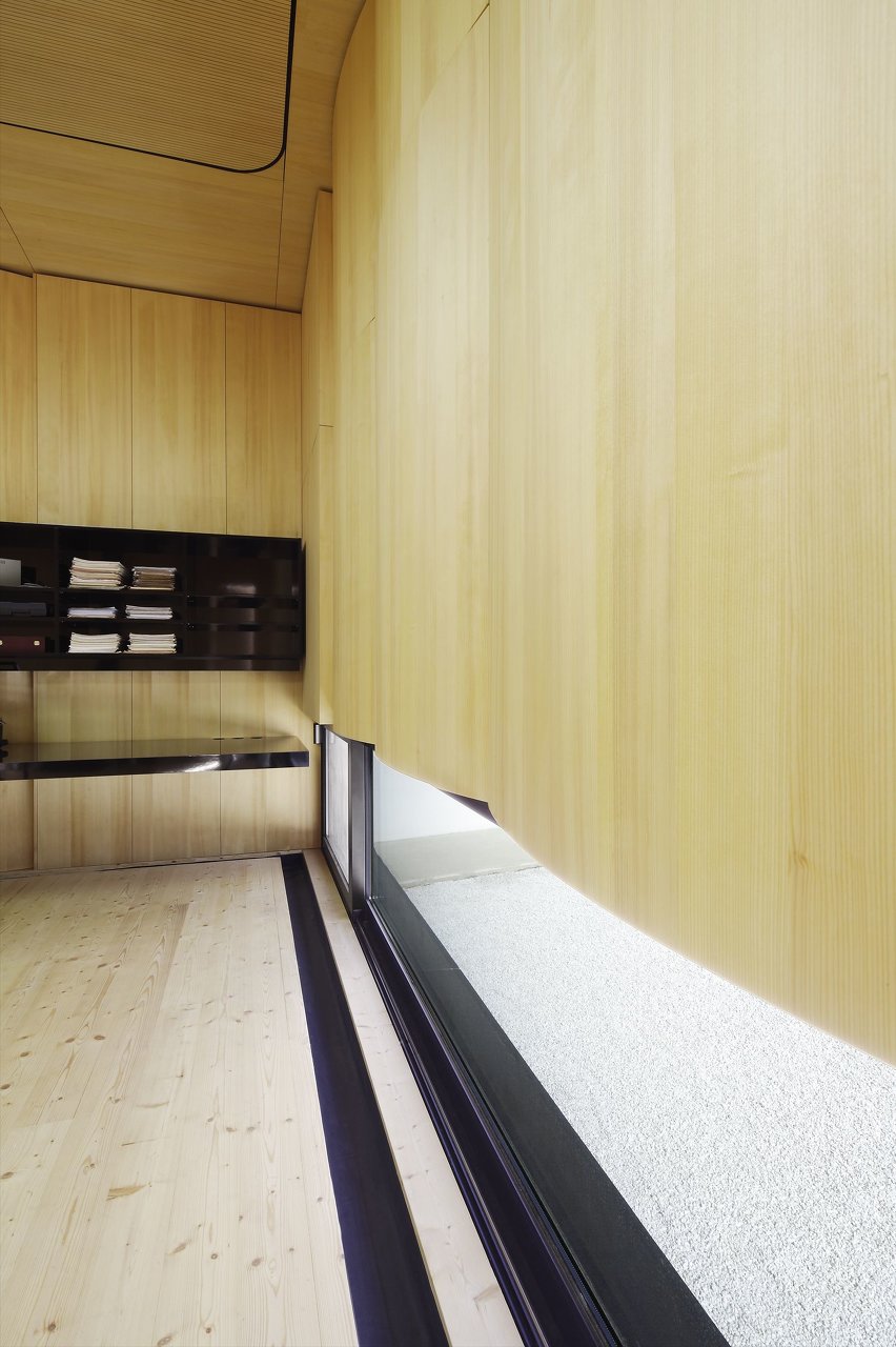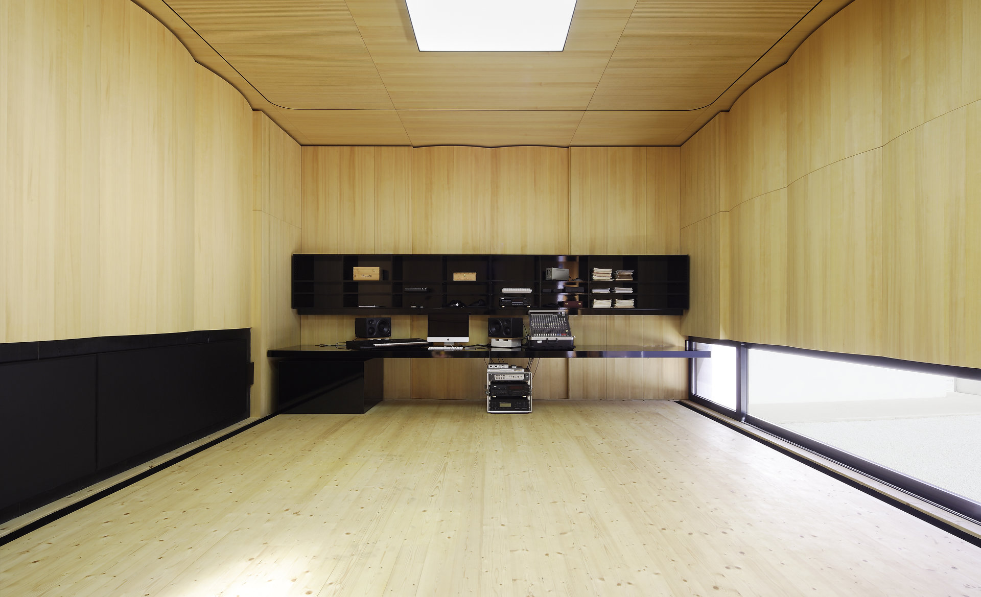 Für die Planung und das Design der akustischen Eigenschaften des Kontrabasshauses sind einerseits die Klangeigenschaften seines Instrumentes mit einem Tonumfang von ca. 30-11.000Hz und einer Schalleistung von ca. 0,156W sowie andererseits die angestrebte vielfältige Nutzung maßgebend. Diese umfasst das Spielen und Üben auf dem Instrument ohne Festlegung auf einen definierten Aufstellungsort im Raum, das Zusammenspiel mit elektroakustischer und elektronischer Musik und Tonaufnahmen des Kontrabasses in unterschiedlichen akustischen Aufnahmesituationen. Nach diesen Anforderungen wurde nun eine akustisch entsprechende kubische Raumgeometrie mit einem Volumen von ca. 160m³ und Seitenverhältnissen mit ungeradzahligen Vielfachen zur gleichmäßigen Ausbreitung des angeregten Schallfeldes entwickelt. Raumbegrenzende Oberflächen und deren Platzierung wurden mit Hilfe raumakustischer Computersimulationen definiert. Die optimale Nachhallzeit für das Spielen wurde im Bereich von 0,8-1,0 Sekunden und für Tonaufnahmen auf unter 0,4 Sekunden projektiert und durch Entwicklung von mobilen reflektierenden Diffusoren aus gebogenen Holzflächen sowie durch den Einsatz von Absorberelementen umgesetzt. Die klanglichen Eigenschaften des Instruments werden durch die Materialien und die Konstruktion des Hohldielenbodens unterstützt. (Text: Architekten)