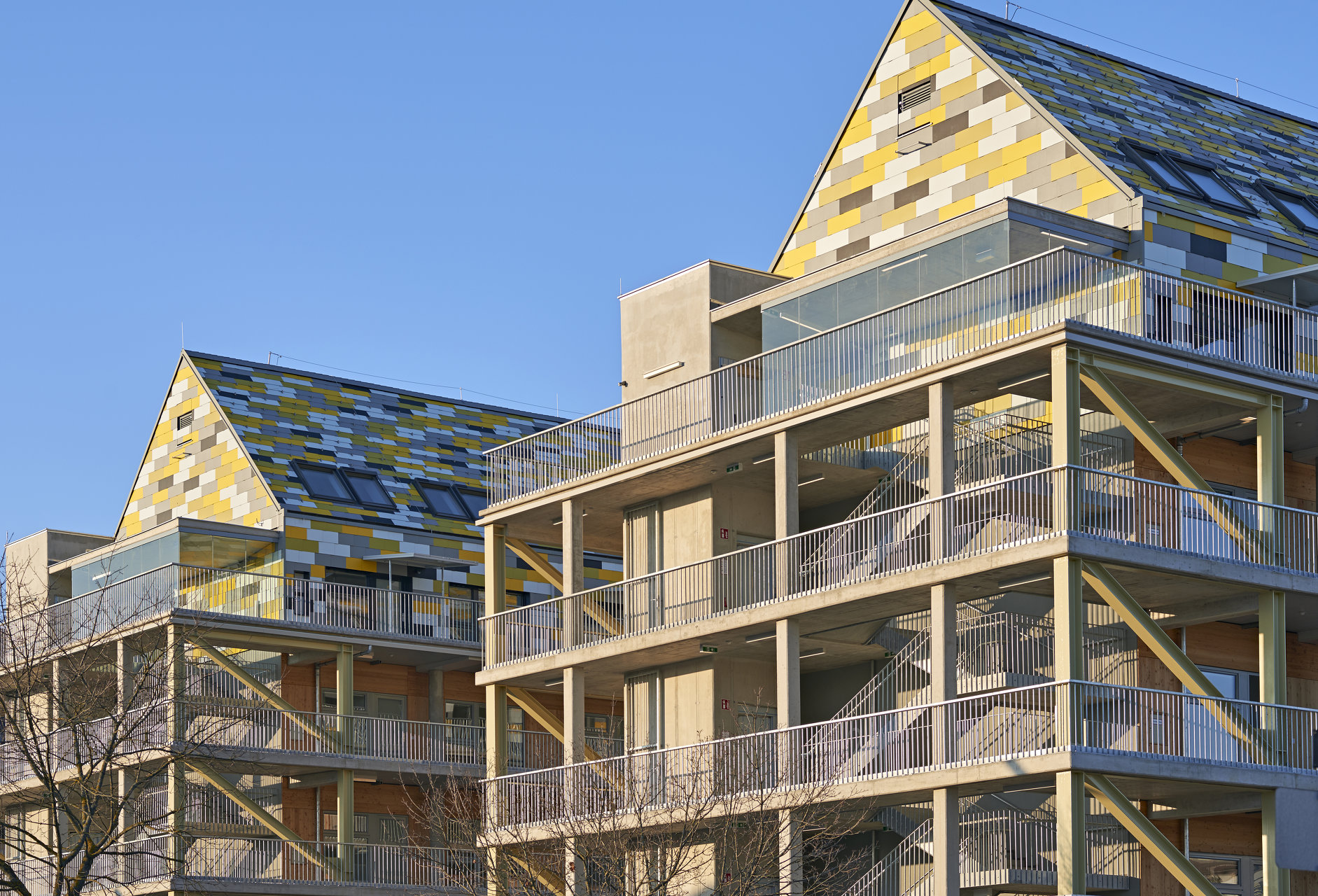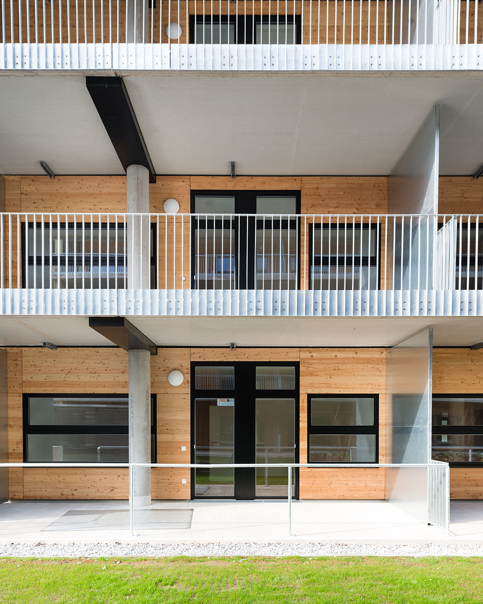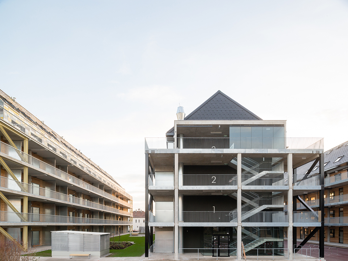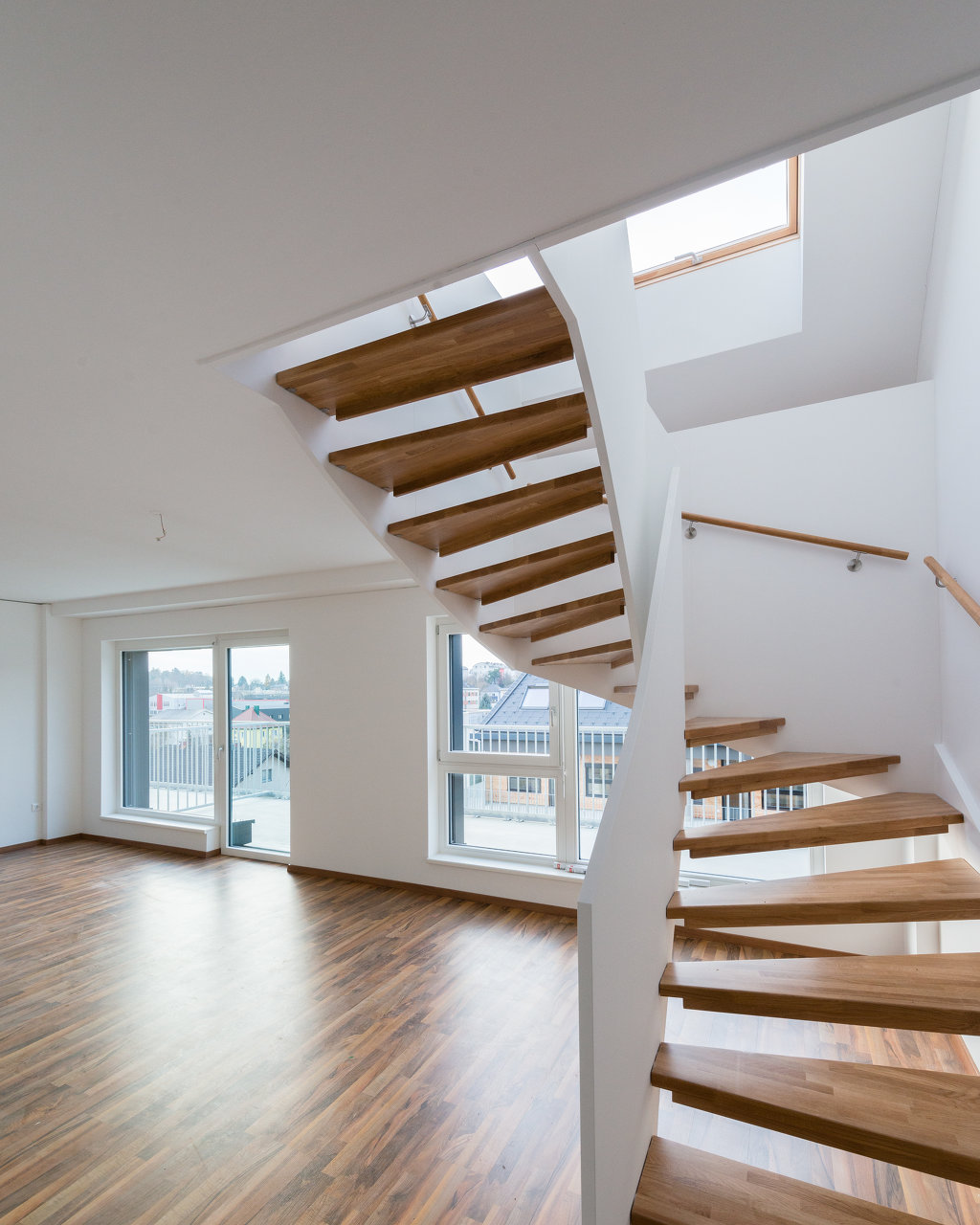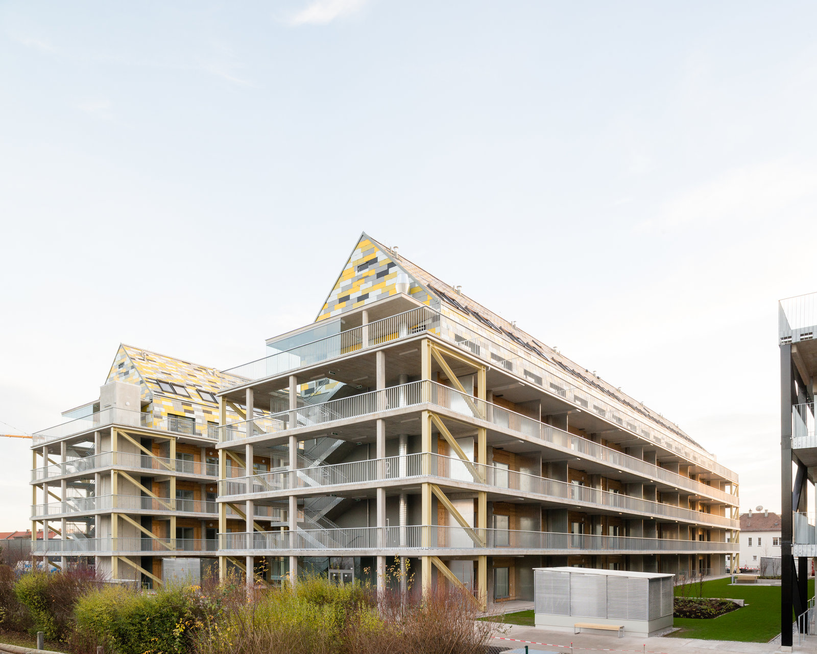 Das Erschließungssystem wird als Teil einer vertikalen Stadtlandschaft verstanden, wodurch die kompakten Wohnungen viel Platz vor der Haustüre erhalten und durch die Balkonzonen Raum vor der Fassade entsteht. Die brandbeständigen Betondecken ermöglichen eine hinterlüftete Holzriegelbauweise, wodurch ökonomisch ausgereizte, aber räumlich und von der Nutzung her vielseitige Grundrisse entstehen. (Text: Architekt:innen)