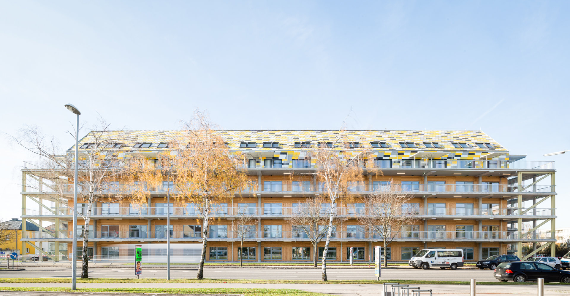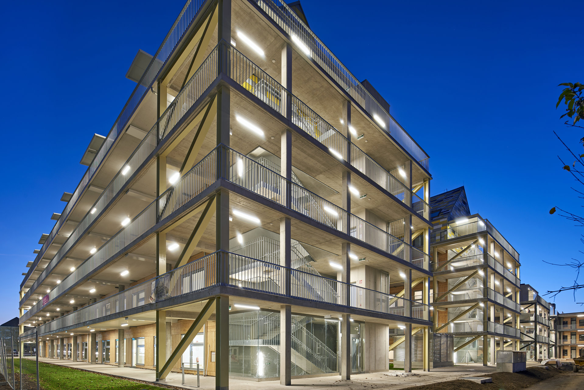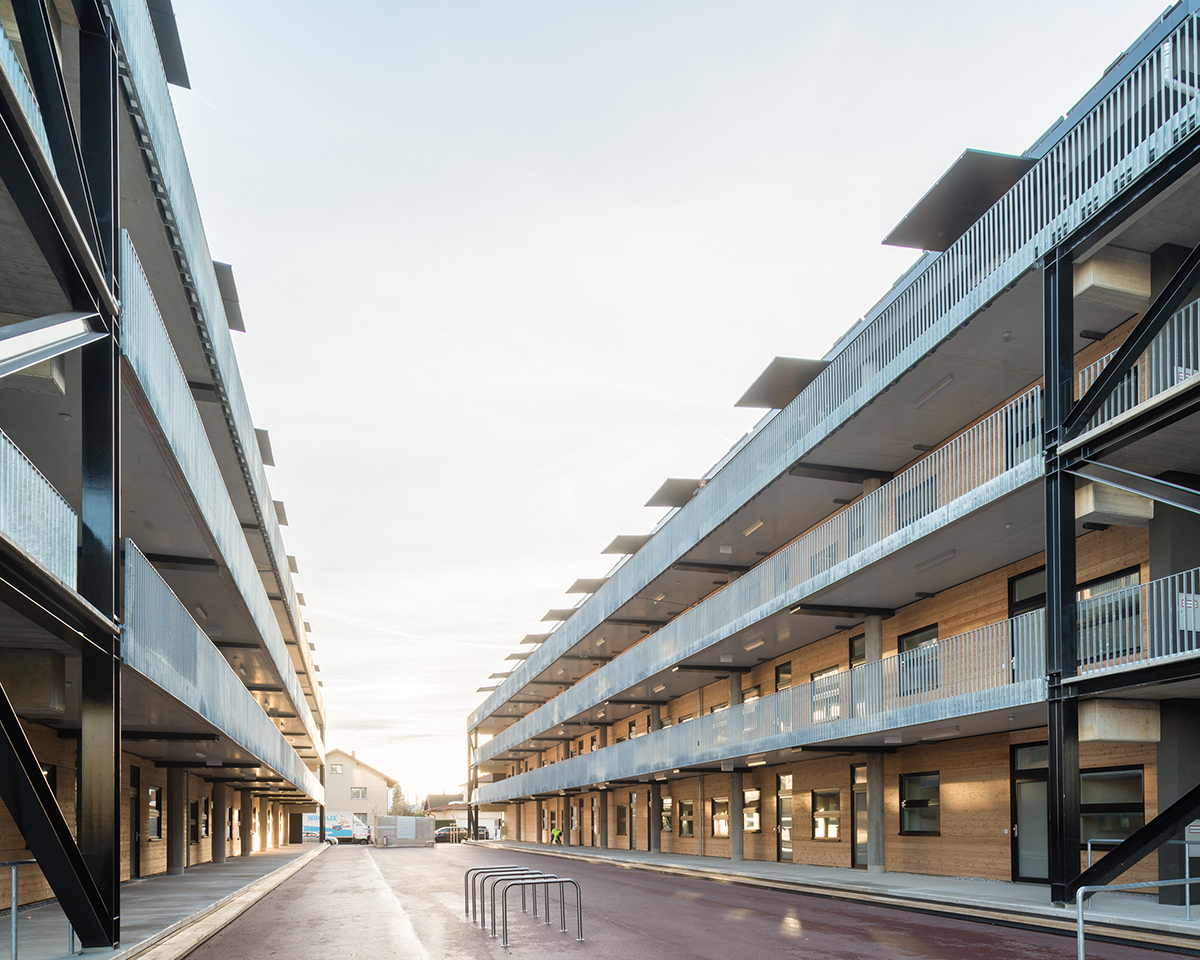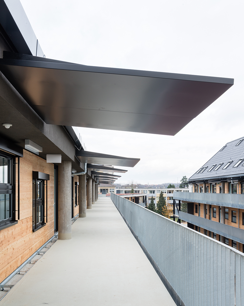 Das Erschließungssystem wird als Teil einer vertikalen Stadtlandschaft verstanden, wodurch die kompakten Wohnungen viel Platz vor der Haustüre erhalten und durch die Balkonzonen Raum vor der Fassade entsteht. Die brandbeständigen Betondecken ermöglichen eine hinterlüftete Holzriegelbauweise, wodurch ökonomisch ausgereizte, aber räumlich und von der Nutzung her vielseitige Grundrisse entstehen. (Text: Architekt:innen)