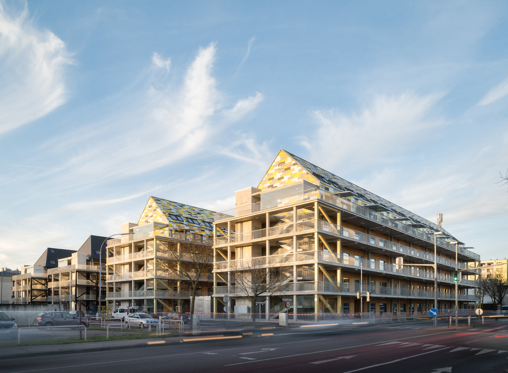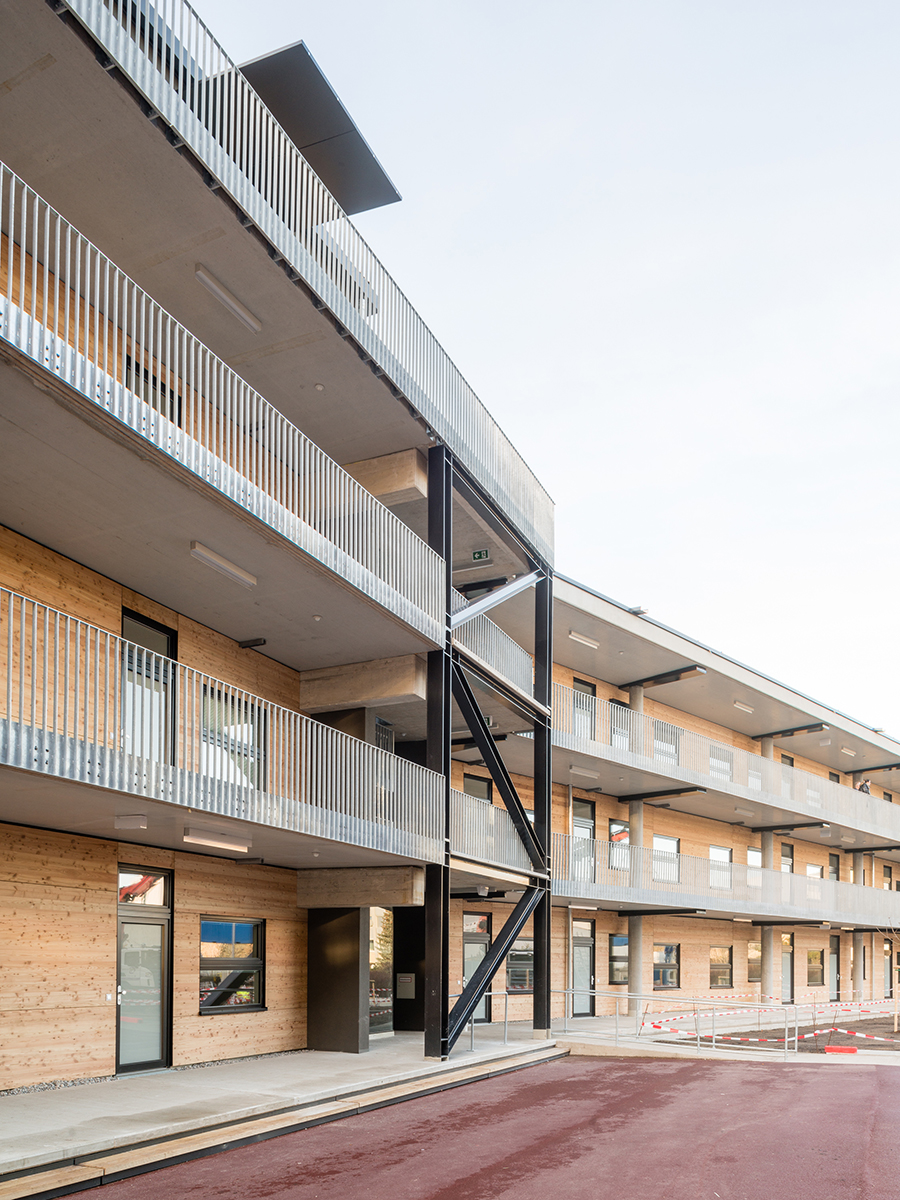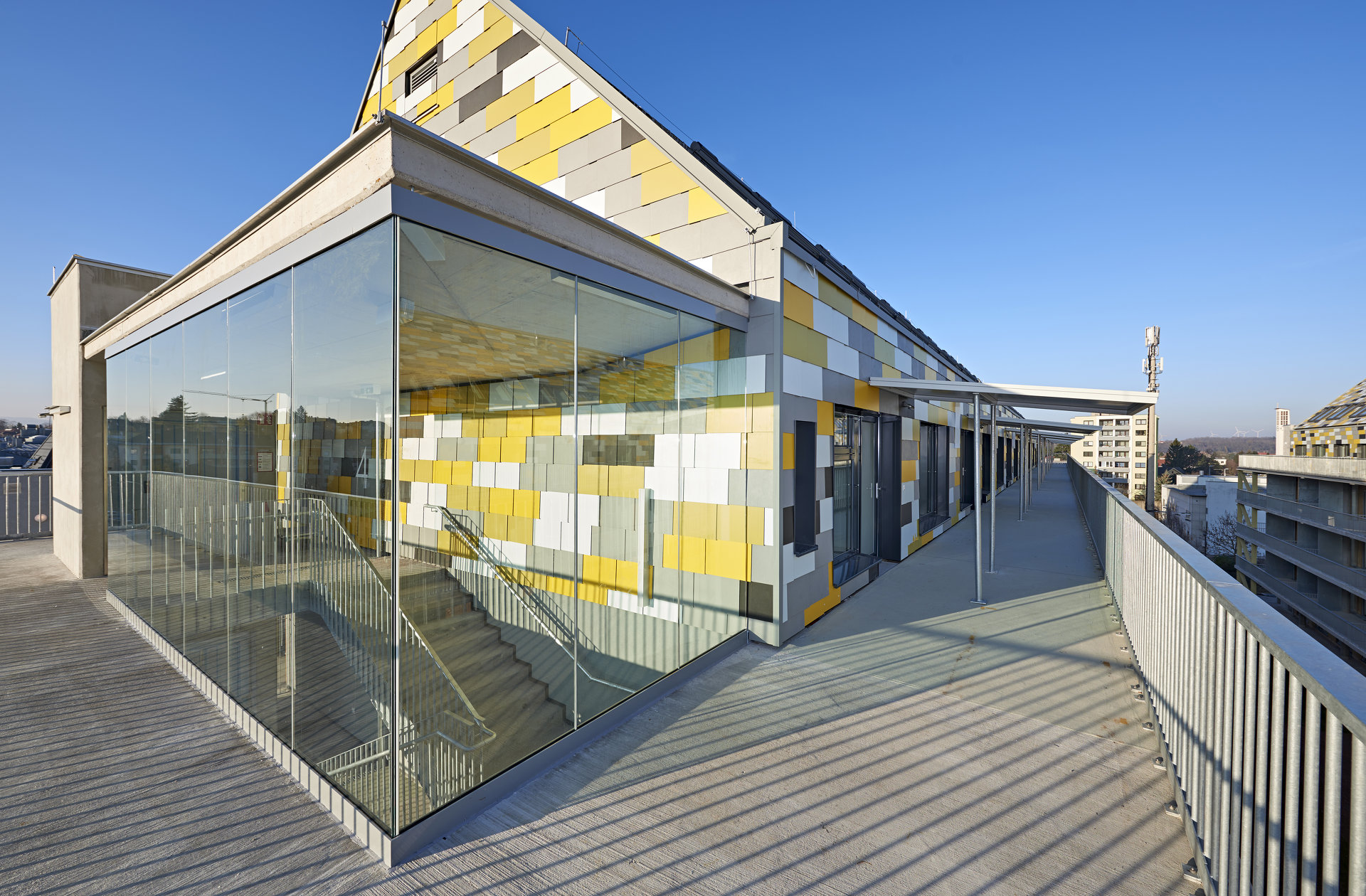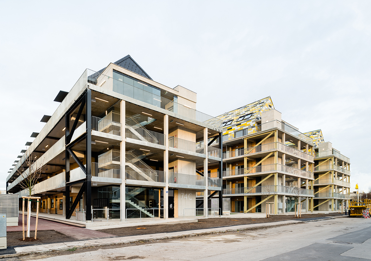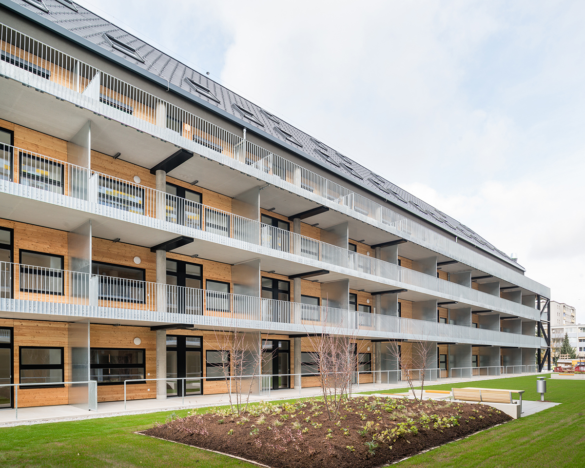 Das Erschließungssystem wird als Teil einer vertikalen Stadtlandschaft verstanden, wodurch die kompakten Wohnungen viel Platz vor der Haustüre erhalten und durch die Balkonzonen Raum vor der Fassade entsteht. Die brandbeständigen Betondecken ermöglichen eine hinterlüftete Holzriegelbauweise, wodurch ökonomisch ausgereizte, aber räumlich und von der Nutzung her vielseitige Grundrisse entstehen. (Text: Architekt:innen)
