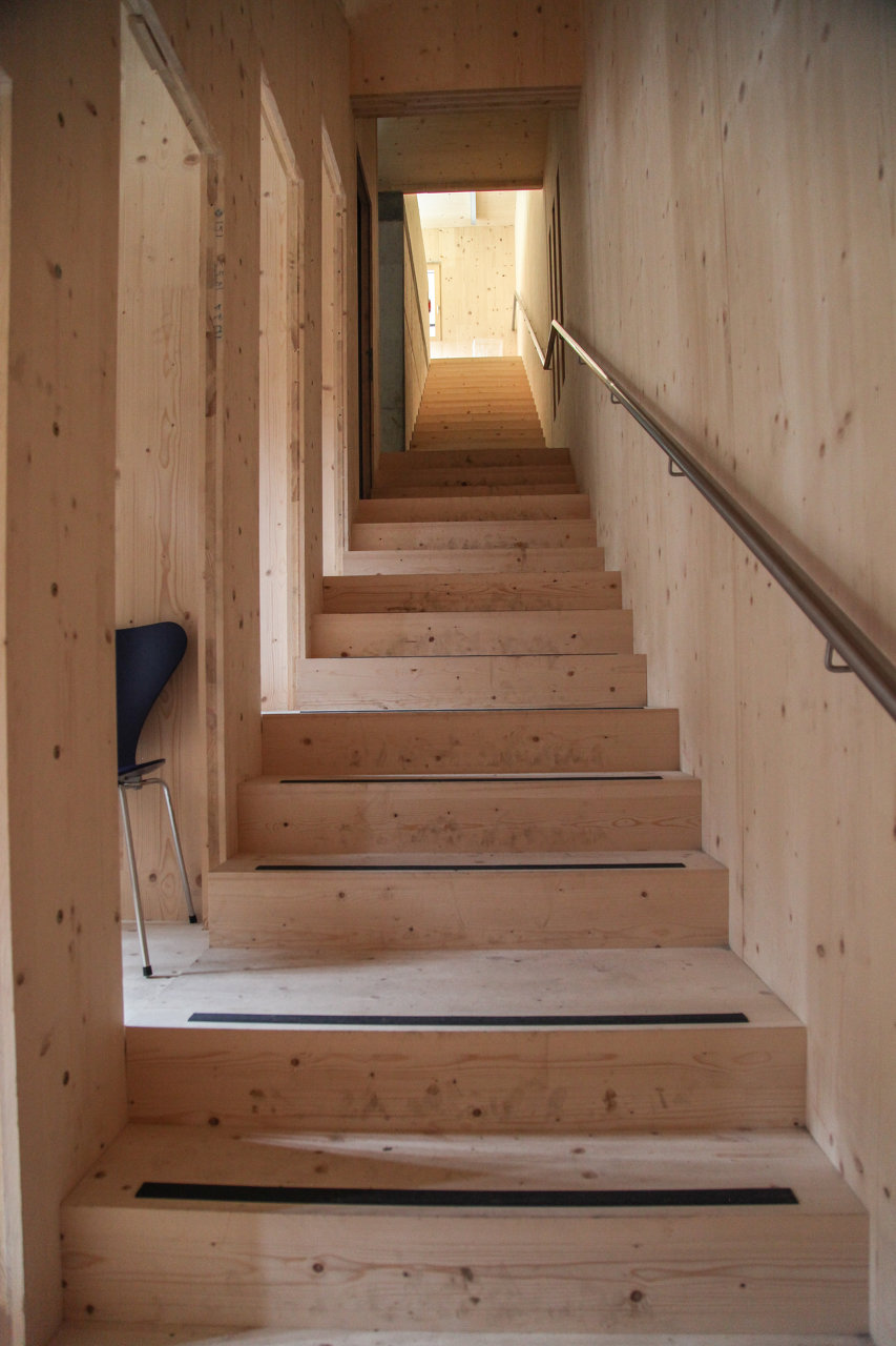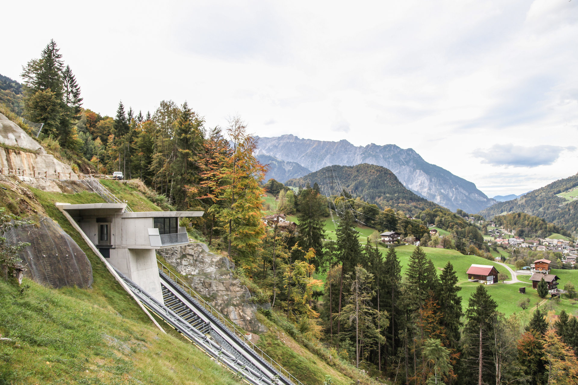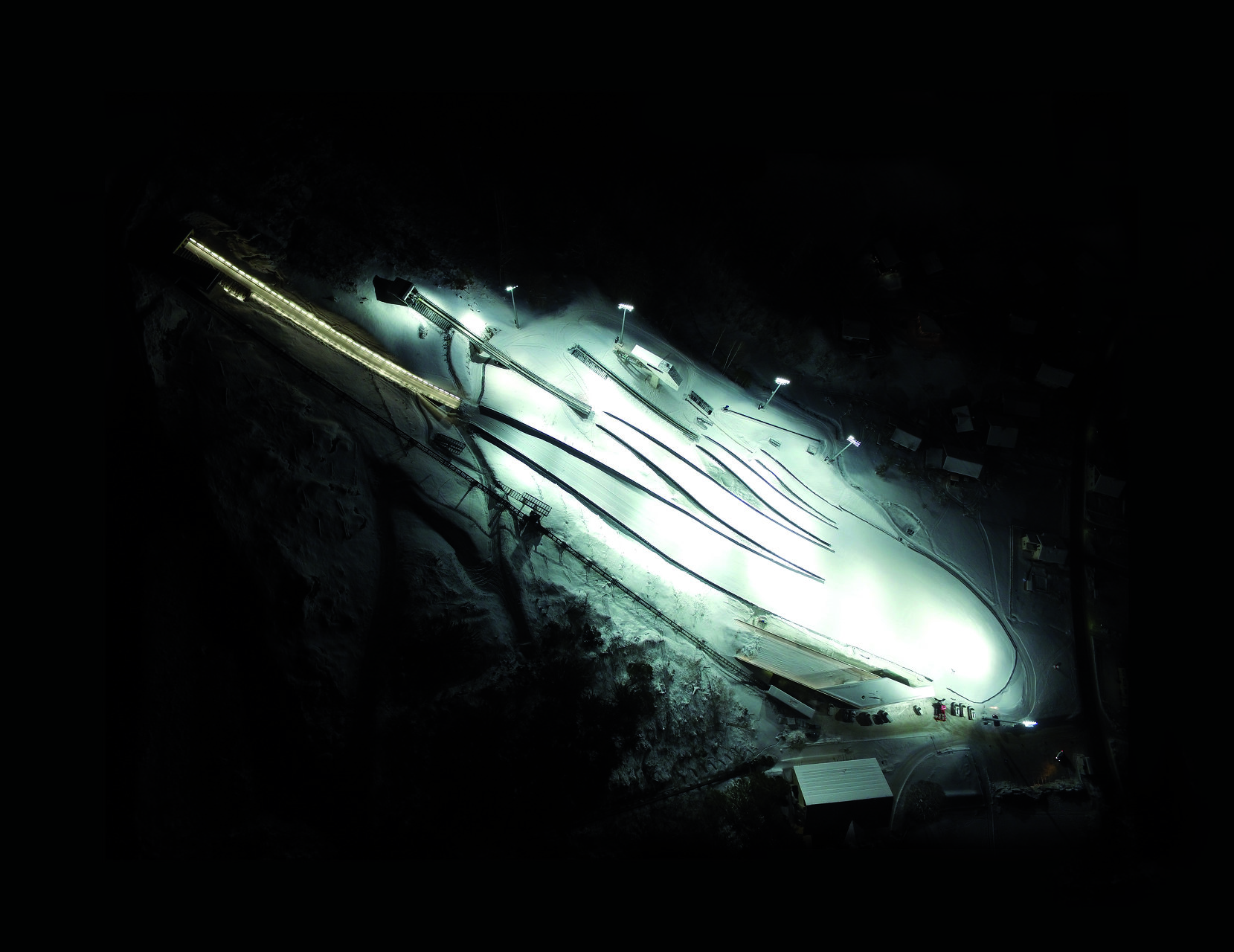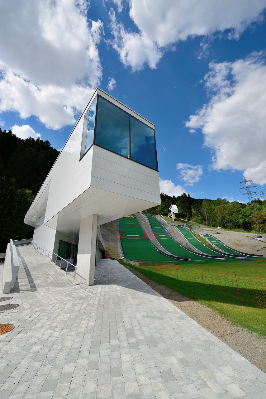 Die Schanzen, das Funktionsgebäude und der Pylon des Sprungrichterturms sind als massive Betonkonstruktionen ausgeführt. Der Turmkopf wurde als stabiler „Holzkasten“ erstellt. Die Formen von Turm und Funktionsgebäude beziehen sich auf den Sprungverlauf der Skispringer. Die Betonfassaden sind mit weißen, opaken, die umliegende Landschaft reflektierenden Kunststoffplatten verkleidet – als Anlehnung an die Verwendung des Acrylglases bei den Schanzen. Die robusten Teppichbeläge beziehen sich auf das Grün der Schanzenmatten. Sämtliche Nebenbauteile sind in Anthrazit gehalten. (Text: Renate Binder)