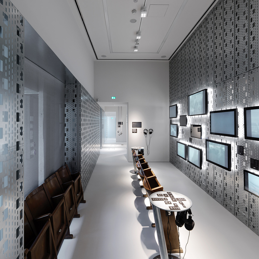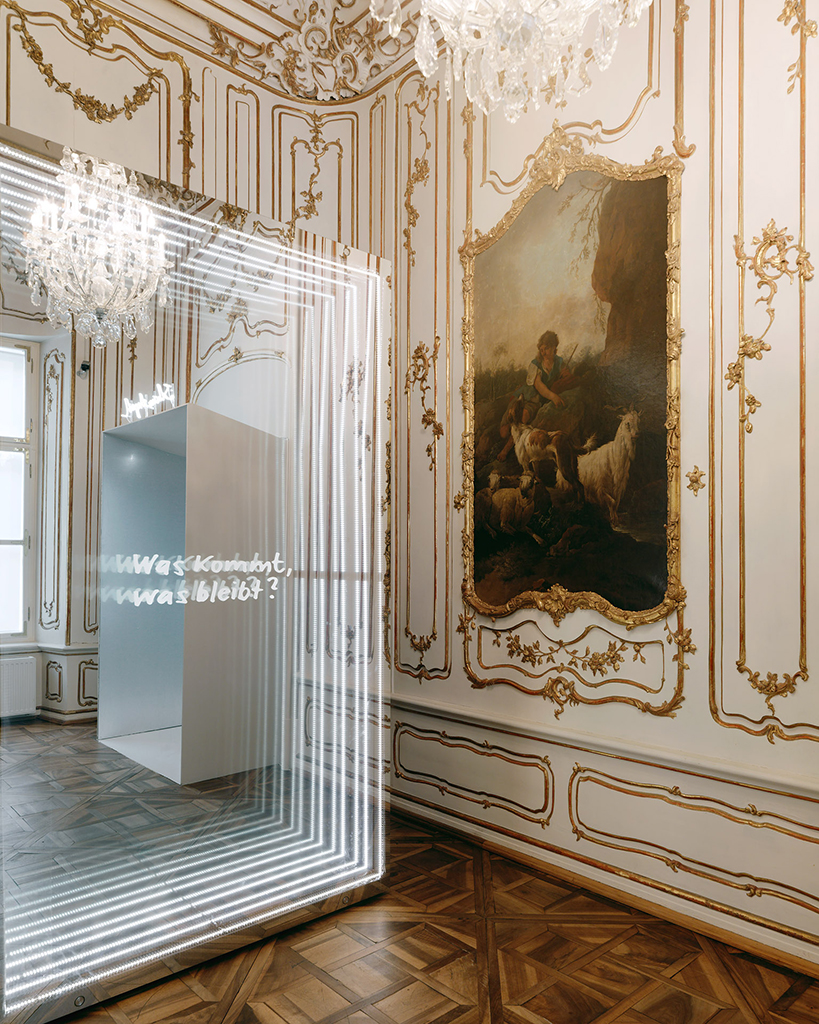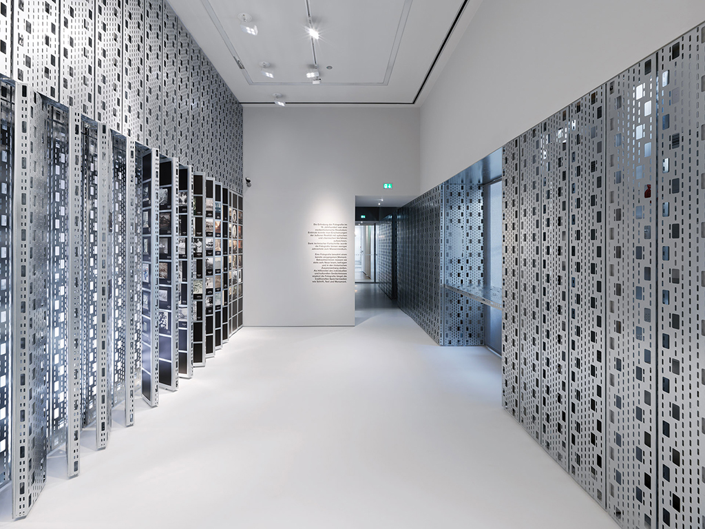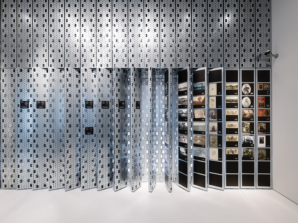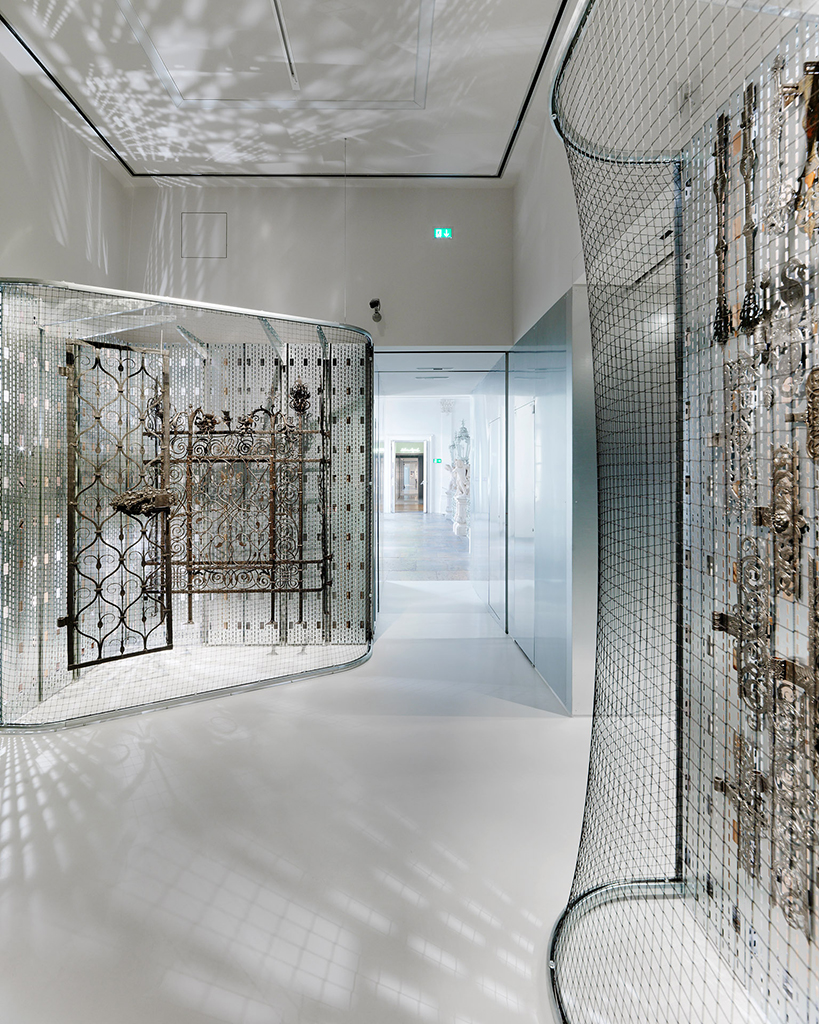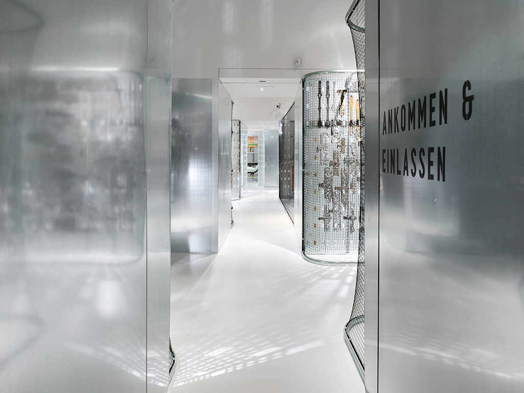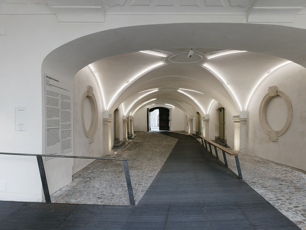 Neben dem Ausstellungsdesign im gesamten zweiten Stockwerk, das sich um ein zentrales Atrium spannt, beinhaltet das Projekt den Umbau und die Adaption des Museumeingangs im Erdgeschoss. Die Neugestaltung erforderte eine Lösung, die den Besucher durch das Erdgeschoss führt und subtil die Aufmerksamkeit des Eingangs – einem bis dahin sehr versteckten und dunklem Innenhof – steigert. Ein maßgeschneiderter, eiserner „Teppich“ wurde über den historischen Steinboden gelegt um eine Plattform zum Entdecken zu schaffen in Bezug auf die Lichtinstallation an der Decke, die von der österreichischen Künstlerin Brigitte Kowanz gestaltet wurde.