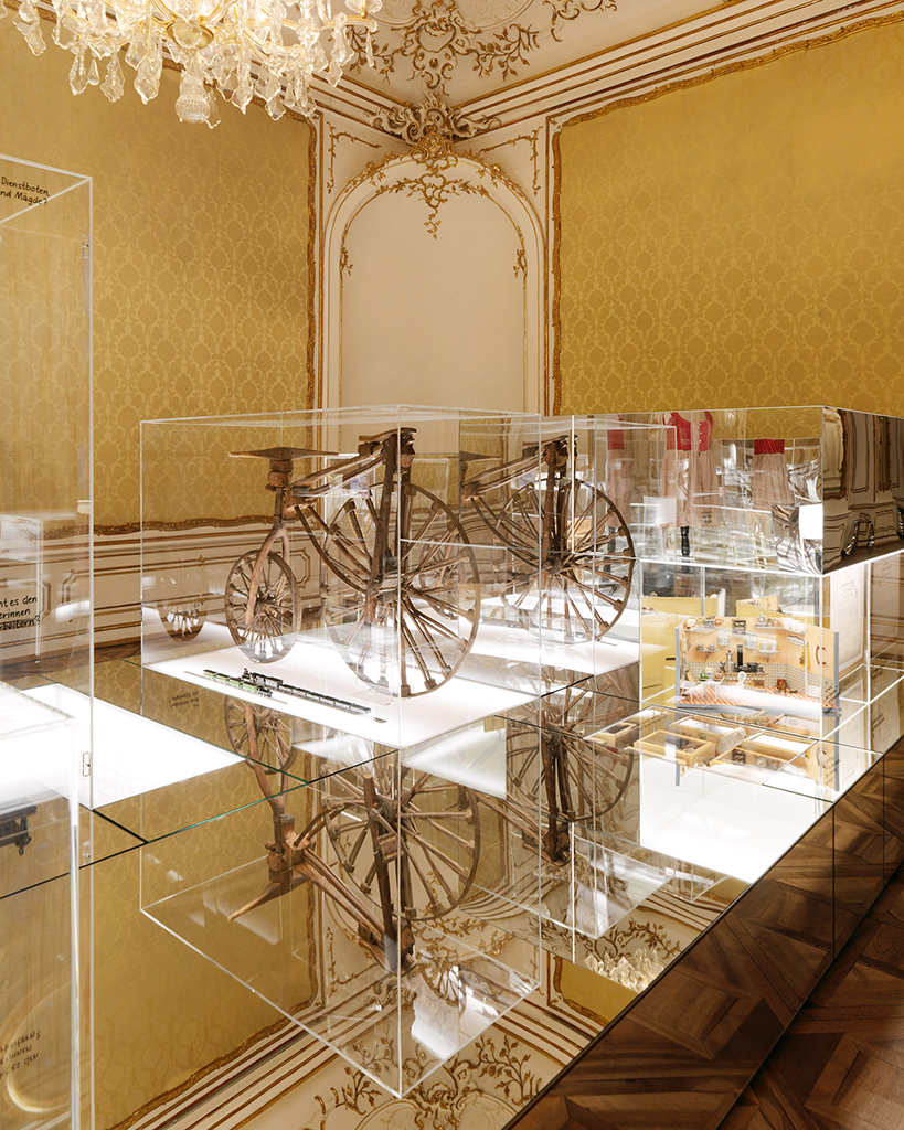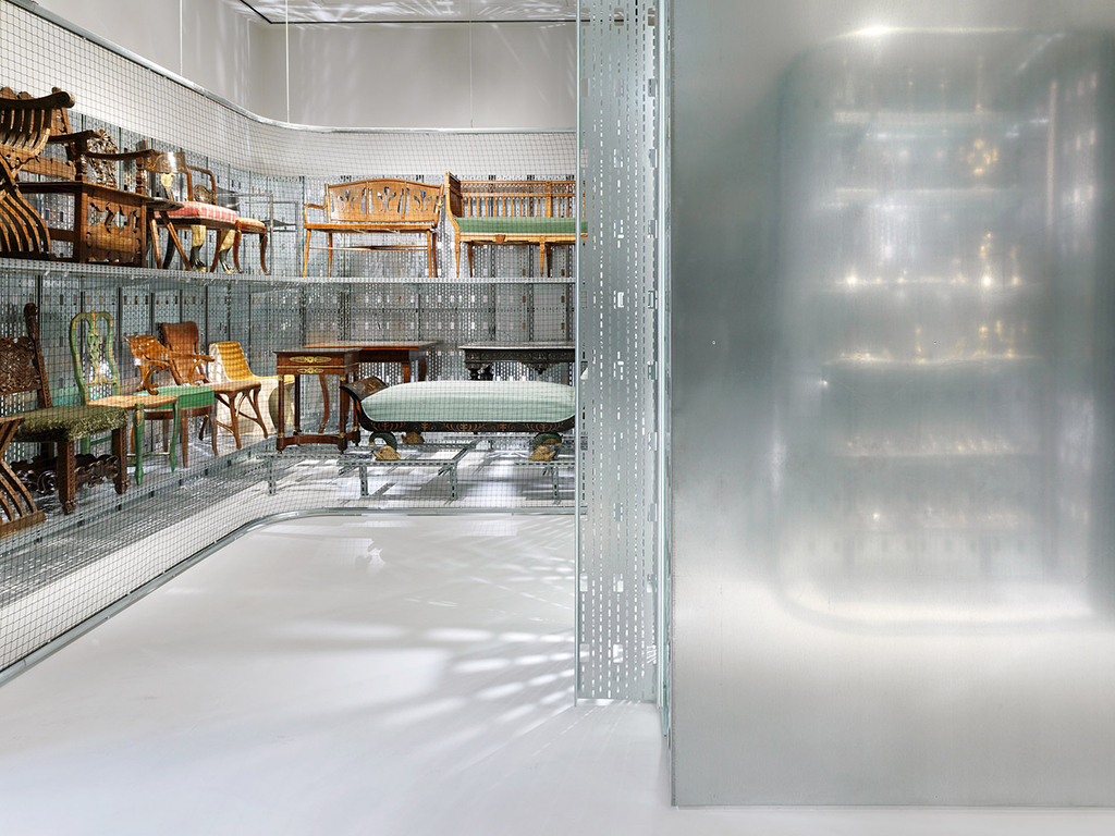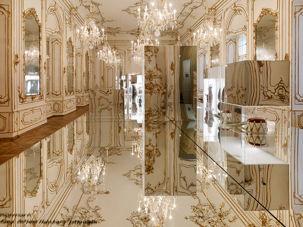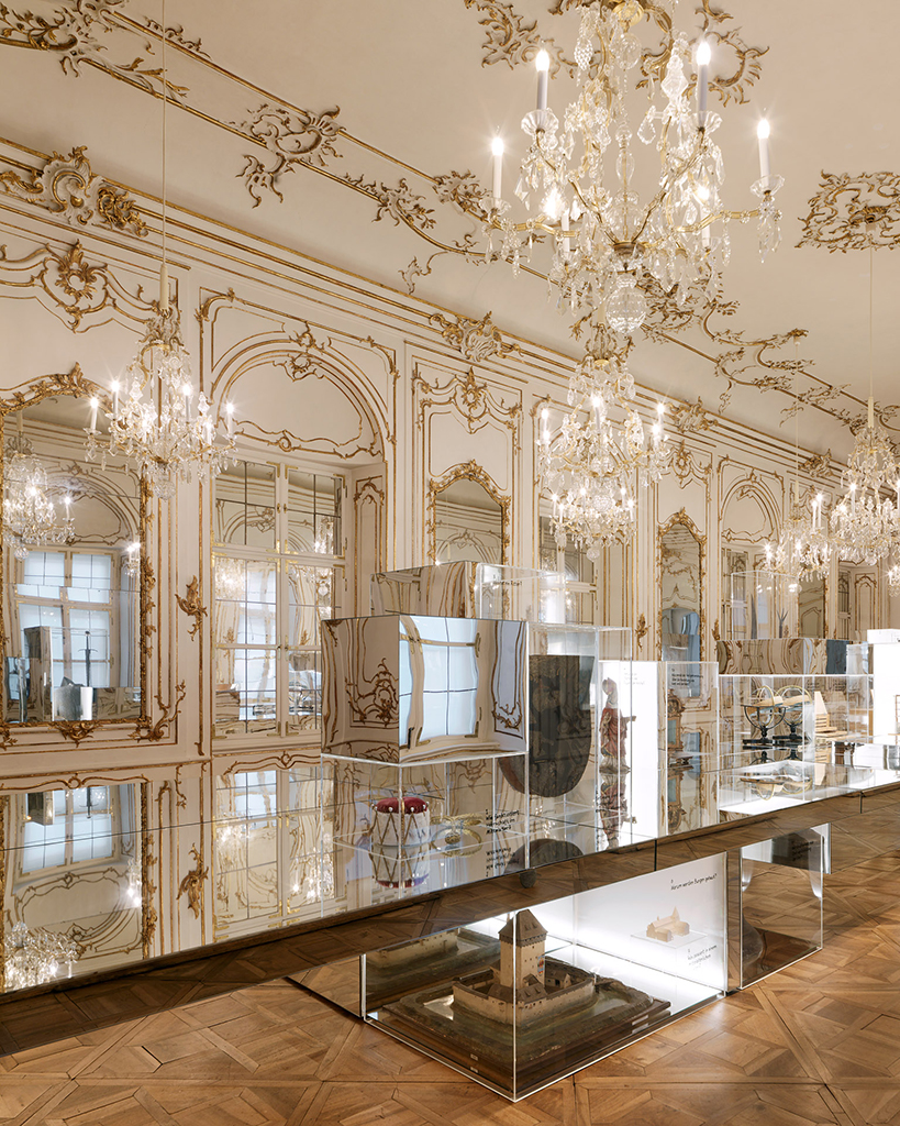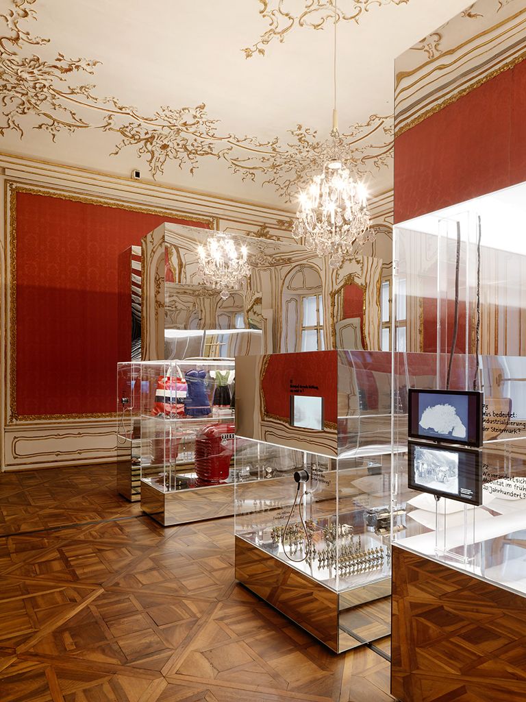 Die „100 x Steiermark“ im historischen Spiegelsaal besteht aus vier miteinander verbundenen Prunkräumen. Die Herausforderung dabei war es die 100 Objekte, die 100 Episoden der Geschichte des Landes der letzten 1000 Jahre repräsentieren, auf 346 m² auszustellen. Für den schon an sich eindrucksvollen Spiegelsaal wurde eine möglichst Raum reflektierende Lösung konzipiert, welche die Präsentation der Objekte beinhaltet. Geschaffen wurde eine einteilige, skulpturale Installation aus Spiegel, Glas und Licht, die durch präzise proportionierte Möbelblöcke eine schwebende Bühne für die vielfältigen Inhalte bietet. Die Komposition aus spiegelnden Objektträgern ermöglicht eine Vielzahl an Betrachtungswinkeln der Inhalte und integriert dabei die vorgegebenen technischen Anforderungen. Das Raummöbel selbst fungiert dabei als Kunstwerk – eine metaphorische und formale Reflektion von Raum, Zeit und Existenz. (Text: Architekten)