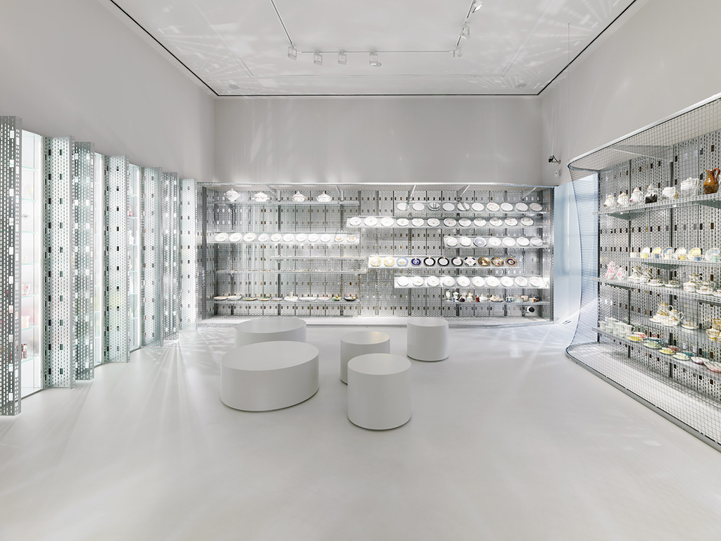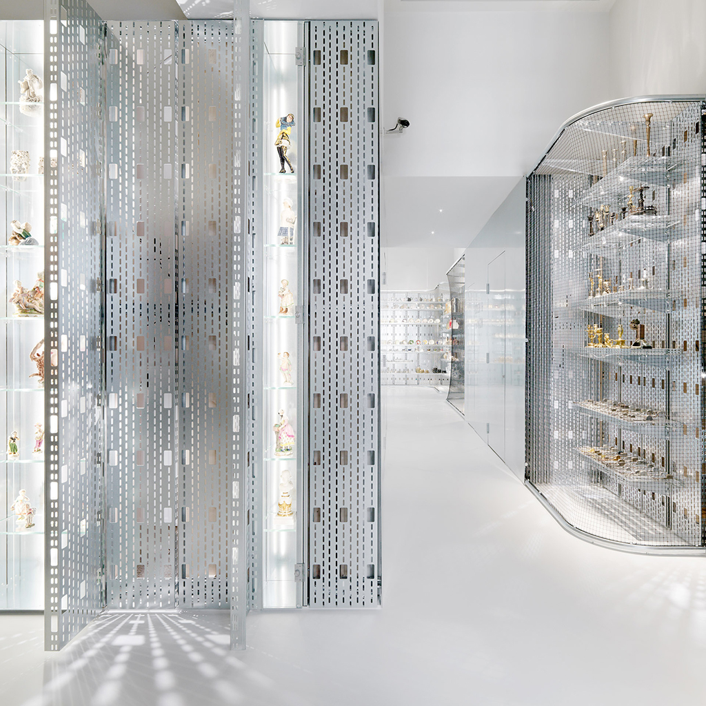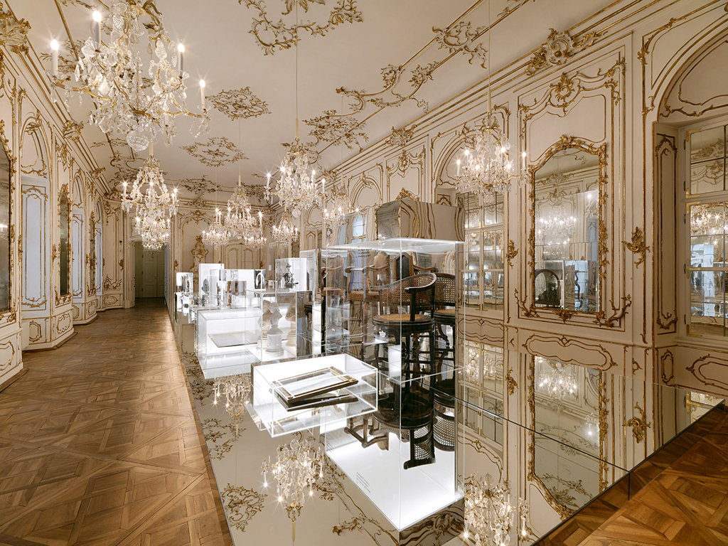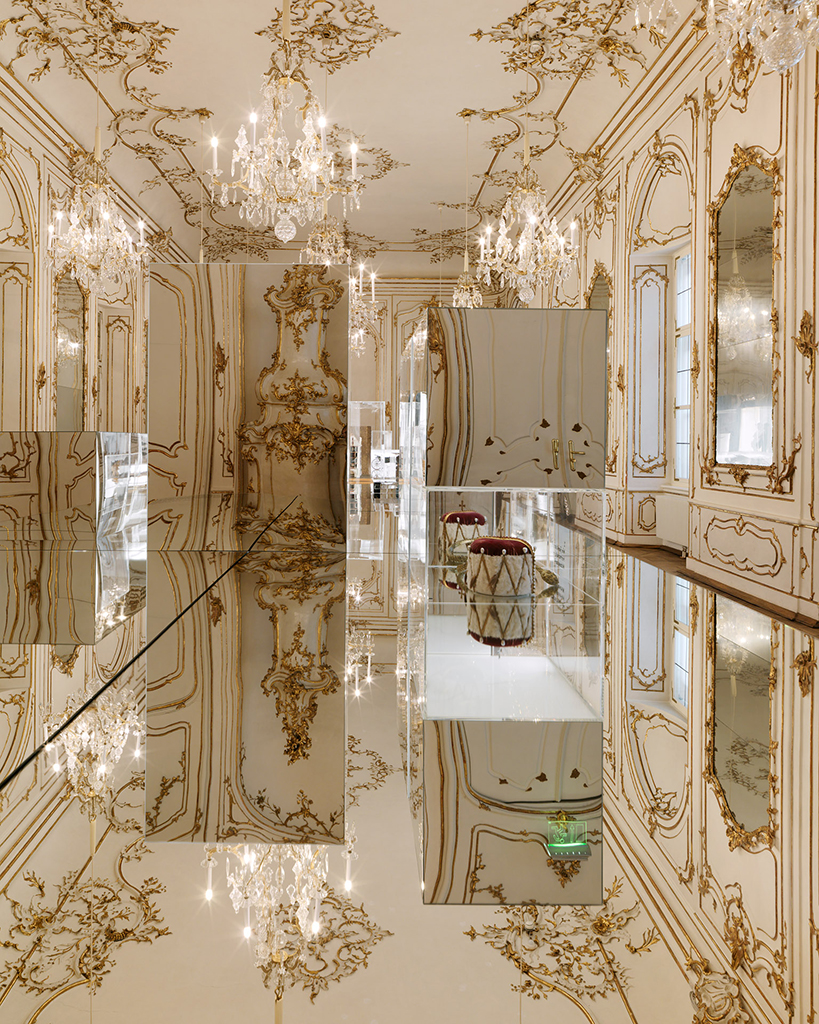 Die „100 x Steiermark“ im historischen Spiegelsaal besteht aus vier miteinander verbundenen Prunkräumen. Die Herausforderung dabei war es die 100 Objekte, die 100 Episoden der Geschichte des Landes der letzten 1000 Jahre repräsentieren, auf 346 m² auszustellen. Für den schon an sich eindrucksvollen Spiegelsaal wurde eine möglichst Raum reflektierende Lösung konzipiert, welche die Präsentation der Objekte beinhaltet. Geschaffen wurde eine einteilige, skulpturale Installation aus Spiegel, Glas und Licht, die durch präzise proportionierte Möbelblöcke eine schwebende Bühne für die vielfältigen Inhalte bietet. Die Komposition aus spiegelnden Objektträgern ermöglicht eine Vielzahl an Betrachtungswinkeln der Inhalte und integriert dabei die vorgegebenen technischen Anforderungen. Das Raummöbel selbst fungiert dabei als Kunstwerk – eine metaphorische und formale Reflektion von Raum, Zeit und Existenz. (Text: Architekten)