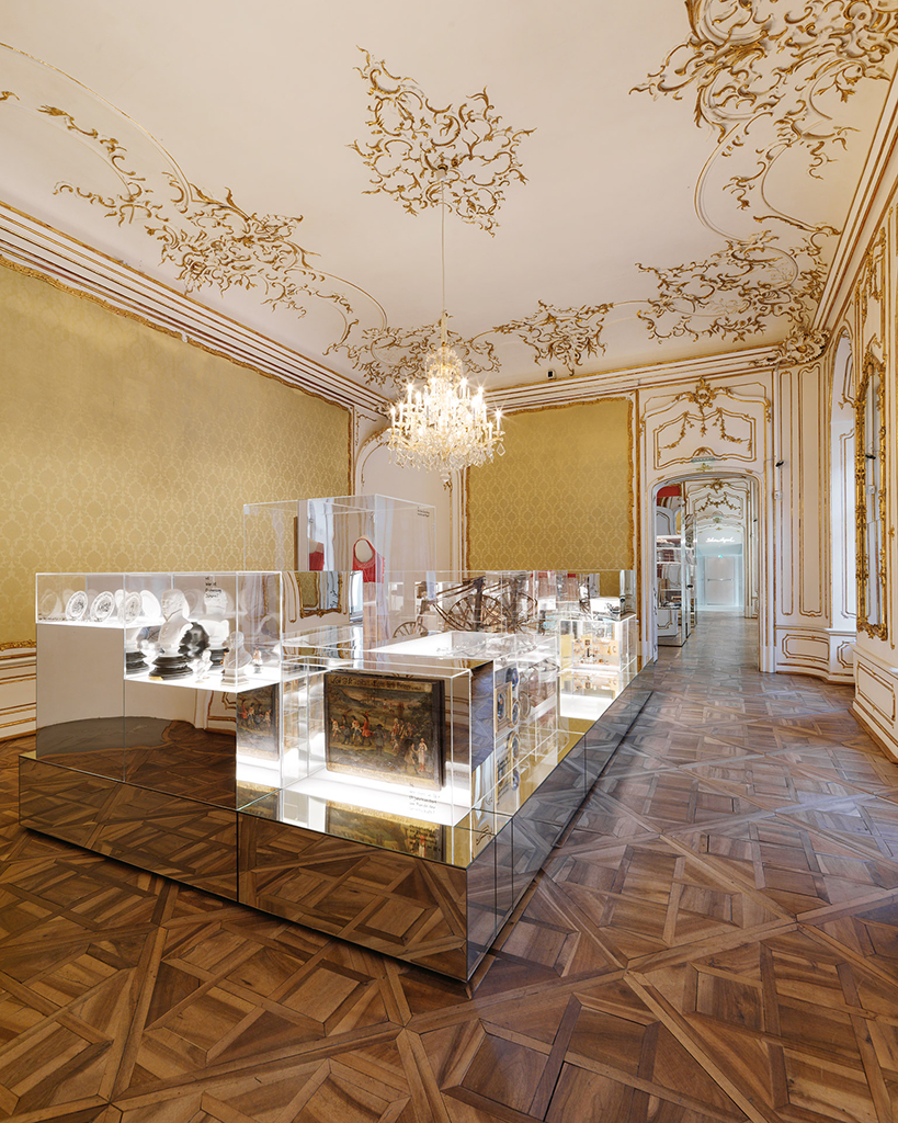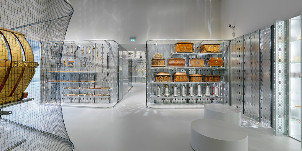 Die zweiteilige Ausstellung „Schaudepot“ enthält etwa 2000 Exponate aus den kulturhistorischen und den multimedialen Sammlungen, die auf einer Fläche von circa 486 m² mit einem Displaysystem aus industriellen Baumodulen präsentiert werden. Das durchgehende Metallband ist behutsam in den historischen Wandbestand eingefügt und generiert einen Zwischenraum für technische Einbauten. Die modularen und multifunktionalen Objektträger, umschlossen von einem feinen Seilnetz, bilden einen materialkonsistenten, fließenden Rahmen, der eine Einheit aus Objekten und Raum schafft und dabei den Kontrast zwischen den historischen und zeitgenössischen Inhalten hervorhebt. Durch die Adaption dieses standardisierten Konstruktionsmaterials wurde der Zugriff auf die Objekte seitens des Museumspersonals für Umgestaltungs- und Wartungsarbeiten komfortabel und nachhaltig gestaltet. Um die Ausstellungen natürlich zu belichten wurden die historischen Fenster in die metallene Wandebene integriert und diese bieten so als Teil des Ausstellungskonzepts Ausblicke auf die historische Stadtlandschaft.