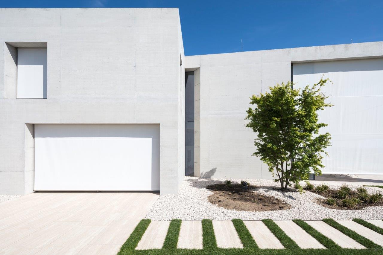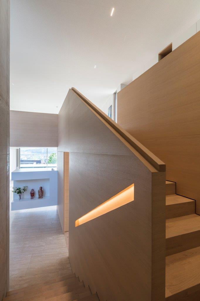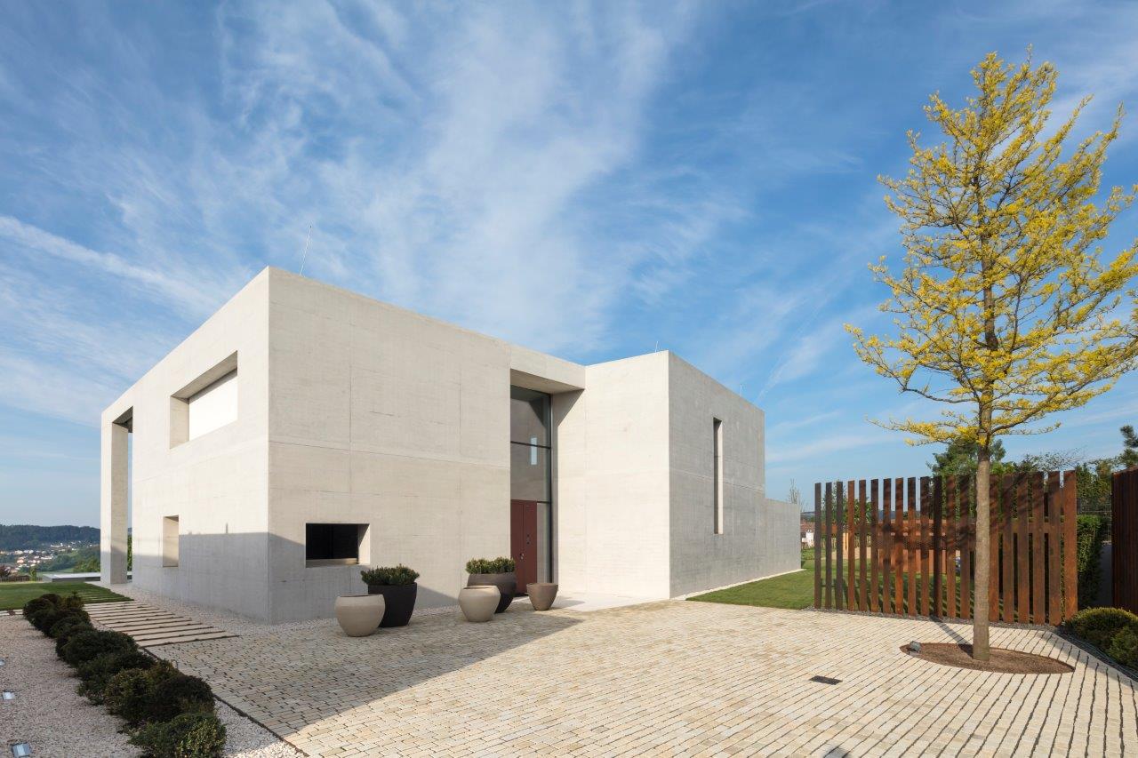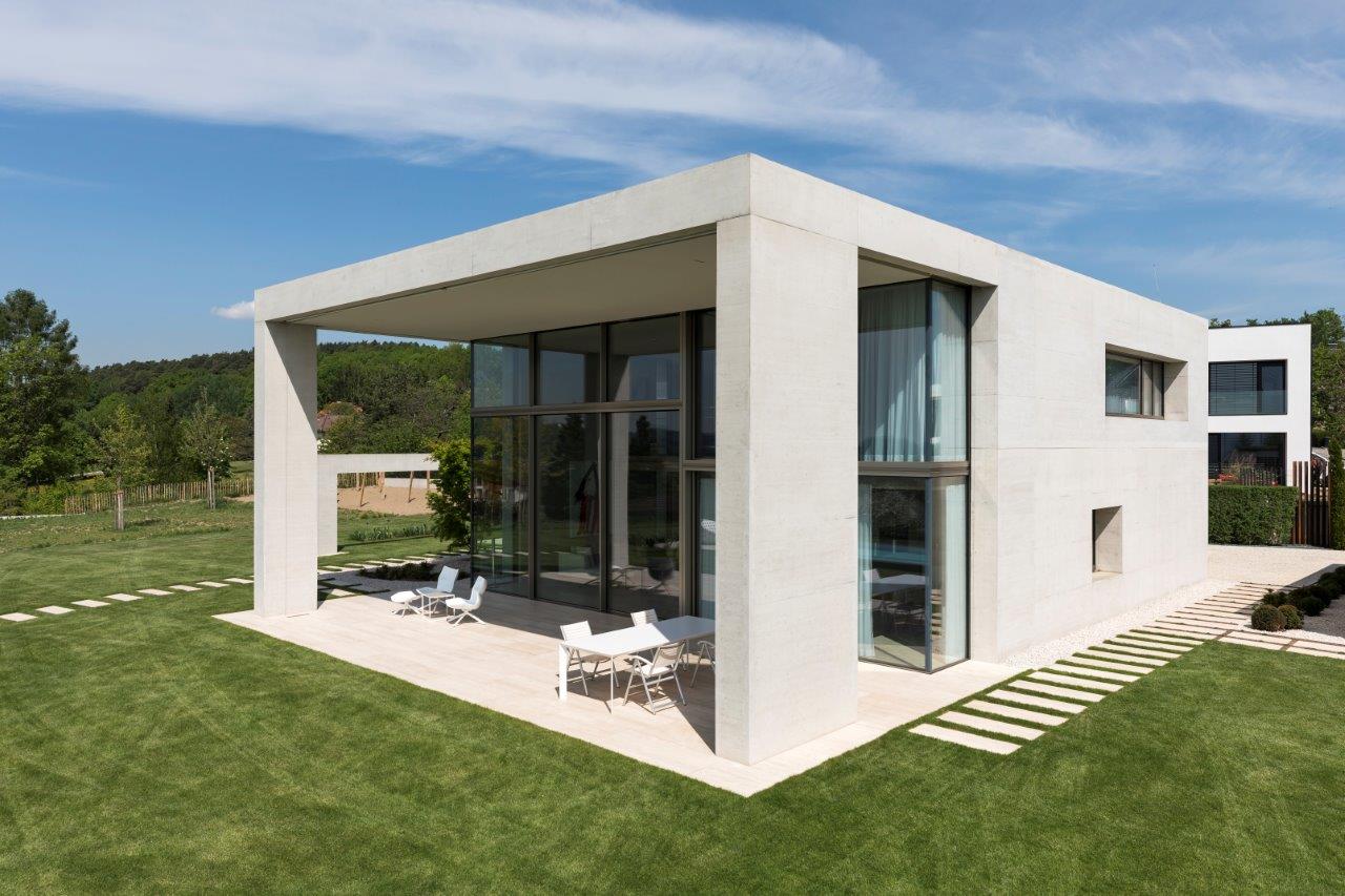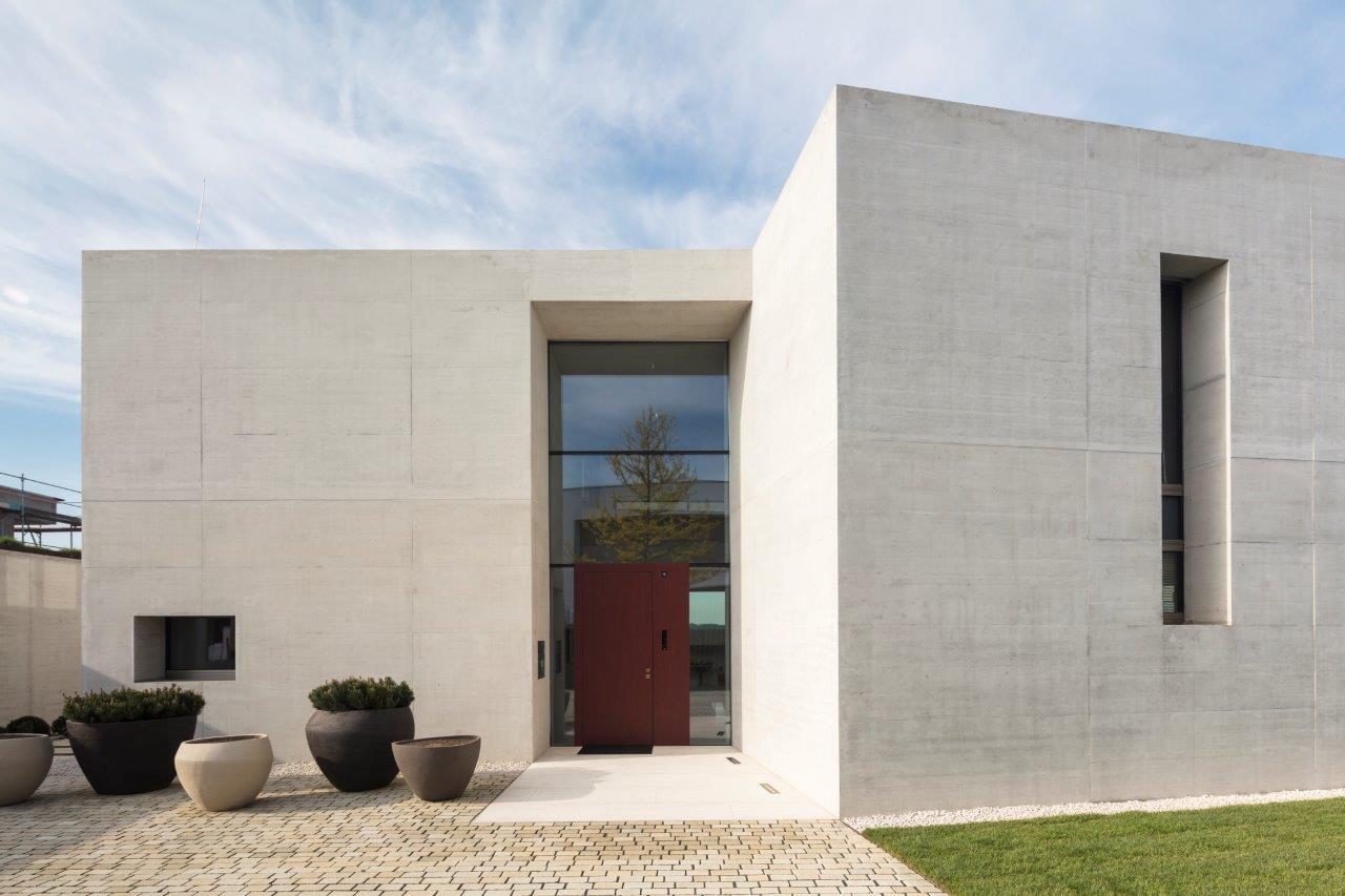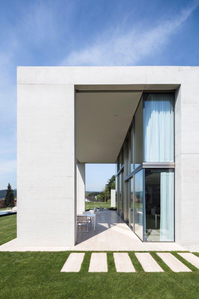 Der Sichtbeton wurde bei Außen- wie Innenwänden zweischalig verwendet, dazwischen befindet sich die Wärmedämmung. Man verzichtete auf Attiken und Fensterbänke.
