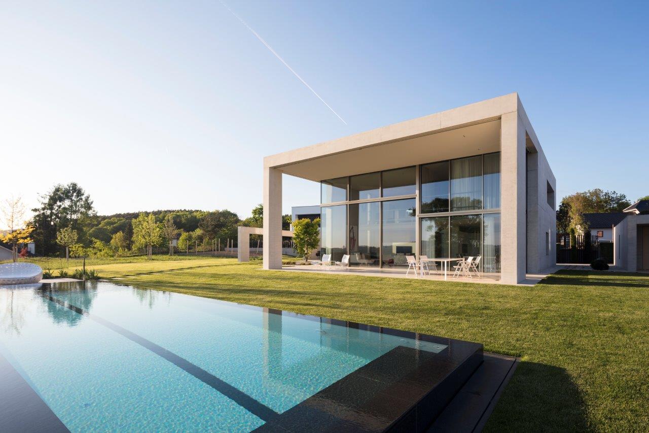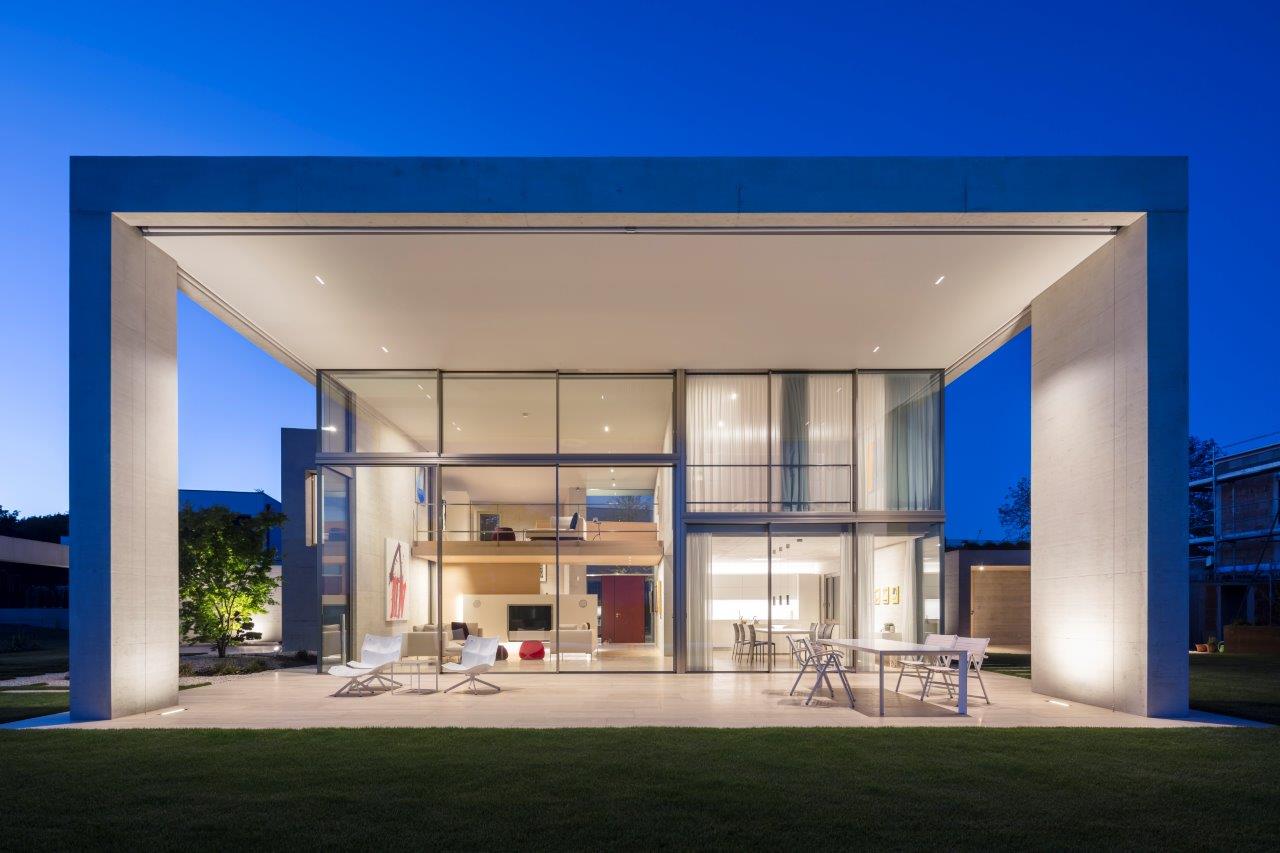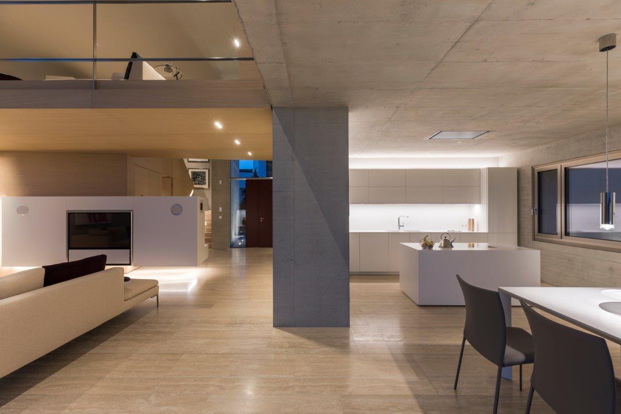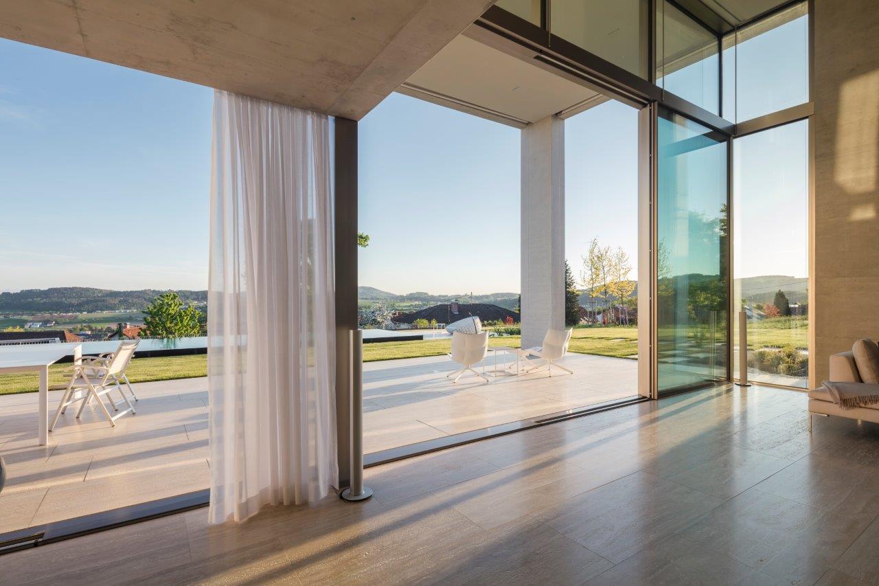 Die Bildersammlung der Bauherren fand ihren würdigen Platz im zweigeschoßigen Wohnraum. Dieser öffnet sich mit großformatigen, rahmenlosen Schiebetüren (Minimal Windows) zur überdeckten Terrasse. Sie lässt sich allseitig durch Screens schließen und gestaltet so einen neuen Zwischenraum als Übergang zum Garten. (Text: Regine Koth-Afzelius nach einem Text des Architekten)