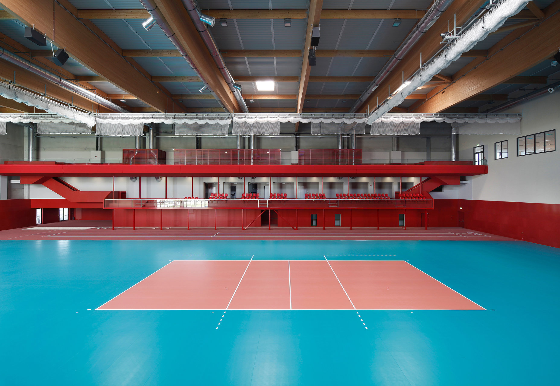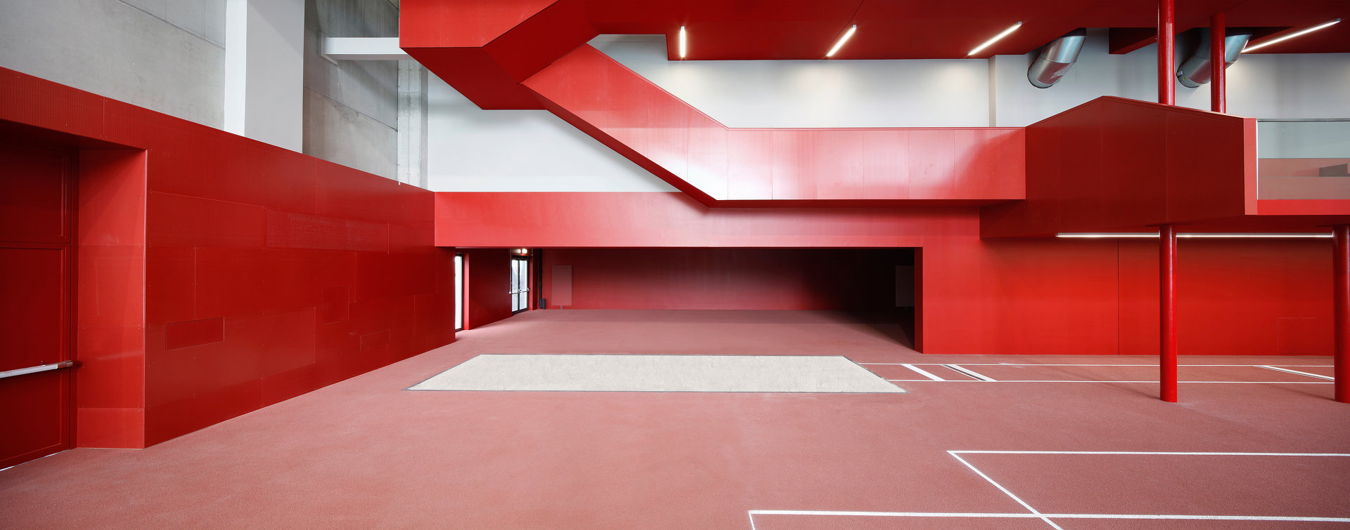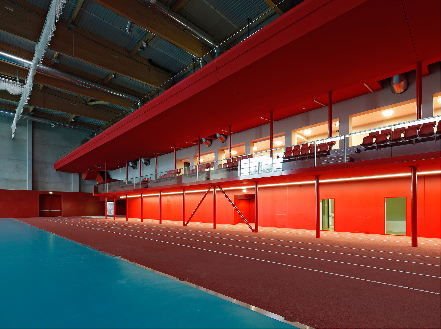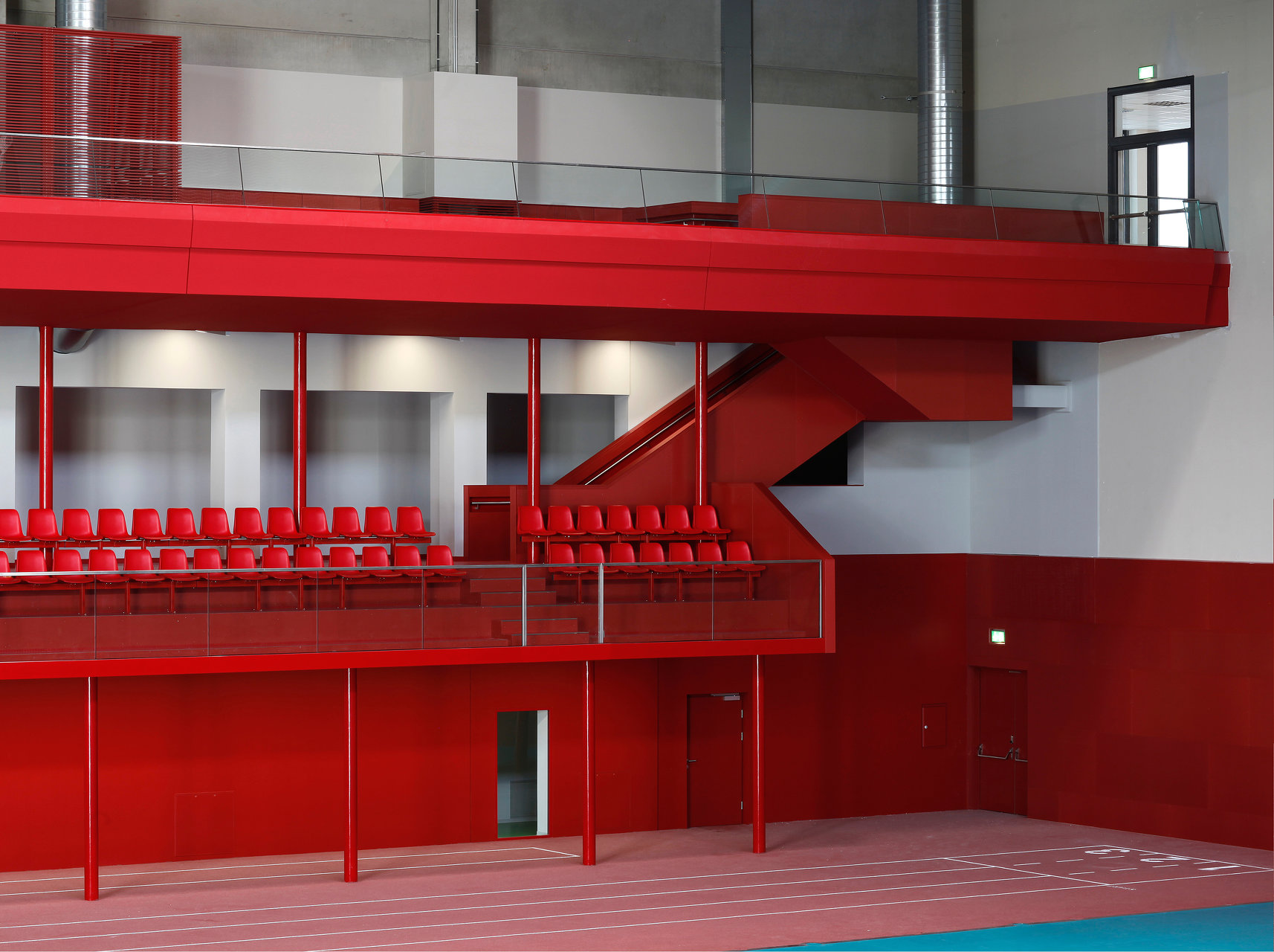 Die architektonische Gestaltung der Halle folgte der Idee eines Implantates, das aus Sportboden für Volleyball und Leichtathletik, Prallwand, Zuschauer- und Cardio-Galerie besteht und konsequent in roter Farbe gehalten ist. Im Detail werden die einzelnen Elemente mit durchgefärbtem MDF, rotem Kautschuk, Latex und Stahl materialisiert.
