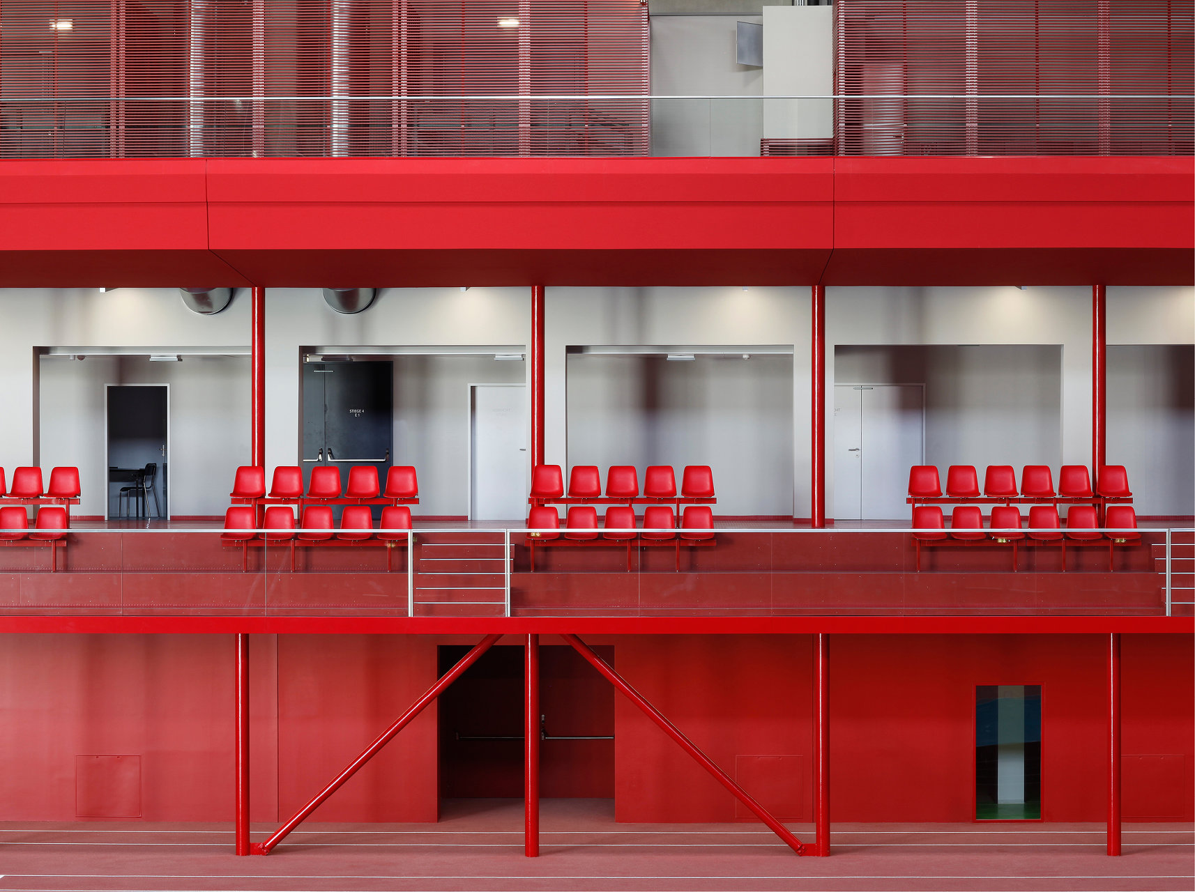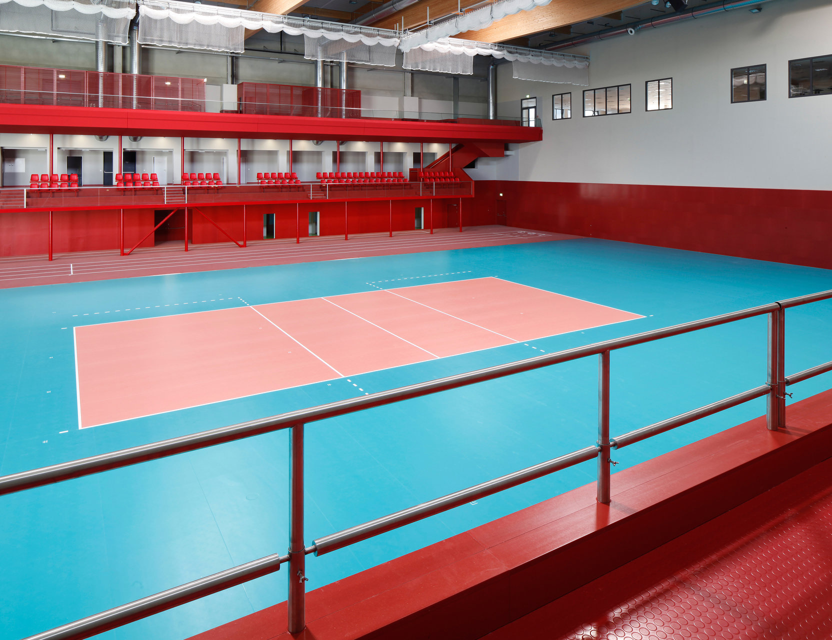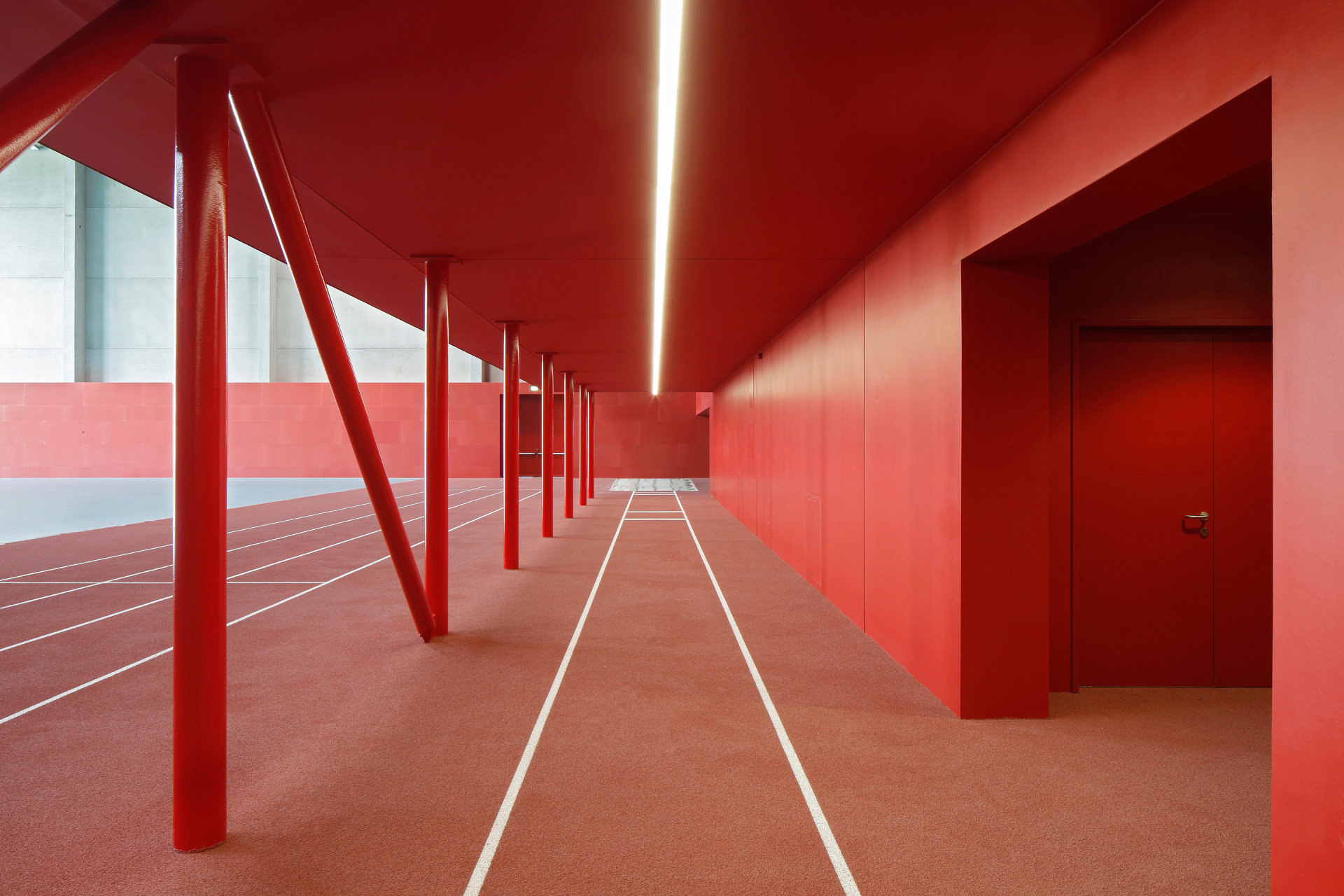 Die architektonische Gestaltung der Halle folgte der Idee eines Implantates, das aus Sportboden für Volleyball und Leichtathletik, Prallwand, Zuschauer- und Cardio-Galerie besteht und konsequent in roter Farbe gehalten ist. Im Detail werden die einzelnen Elemente mit durchgefärbtem MDF, rotem Kautschuk, Latex und Stahl materialisiert.