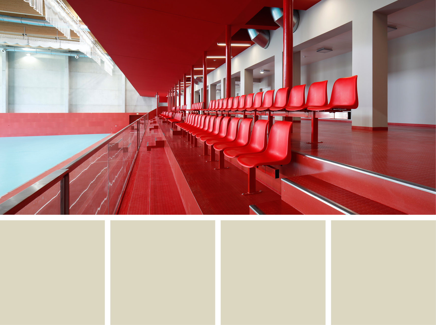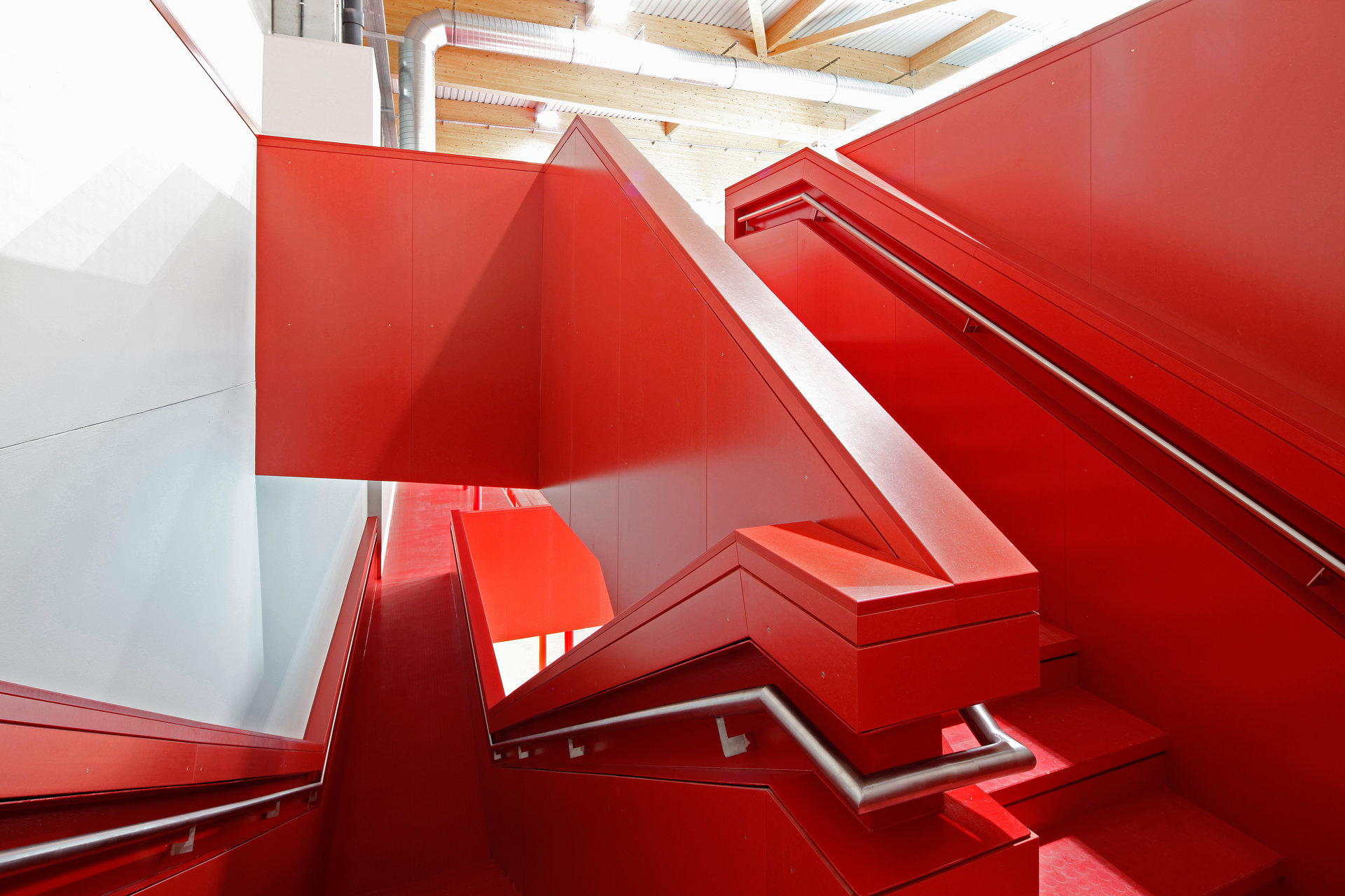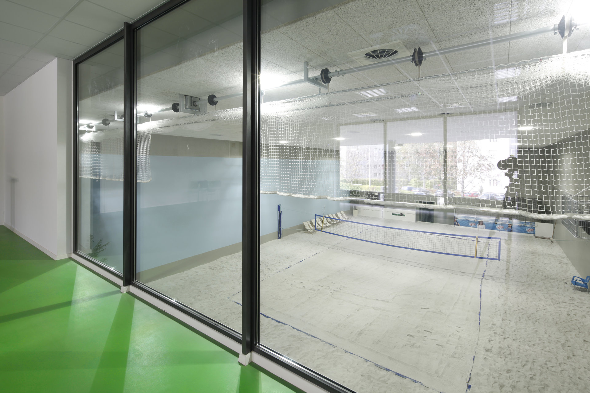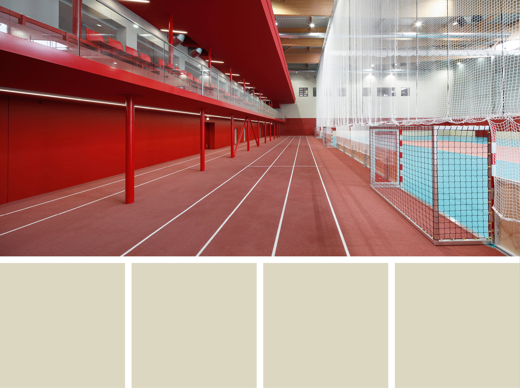 Die architektonische Gestaltung der Halle folgte der Idee eines Implantates, das aus Sportboden für Volleyball und Leichtathletik, Prallwand, Zuschauer- und Cardio-Galerie besteht und konsequent in roter Farbe gehalten ist. Im Detail werden die einzelnen Elemente mit durchgefärbtem MDF, rotem Kautschuk, Latex und Stahl materialisiert.