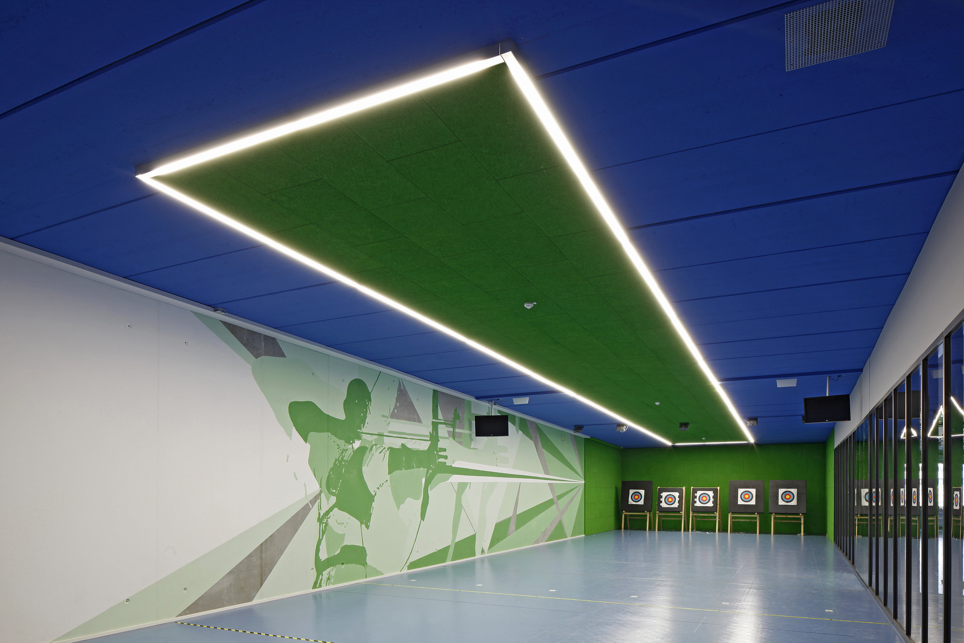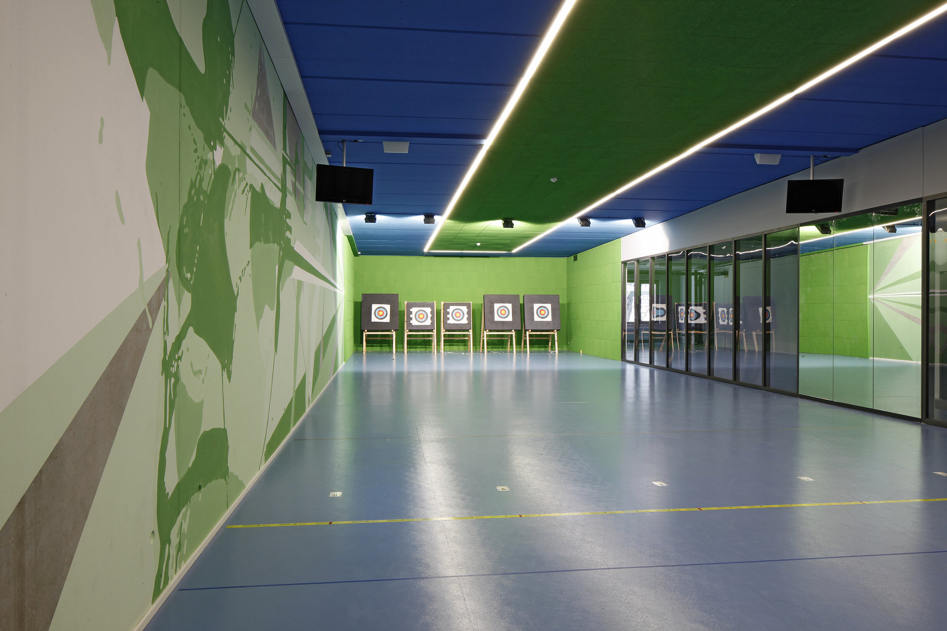 Die Bogenschiesshalle dient dem Training und der Ausbildung von Bogenschützen. Sie ist seitlich einsichtig, jedoch, wie für die Konzentration der Sportler wichtig, ausschließlich künstlich belichtet.