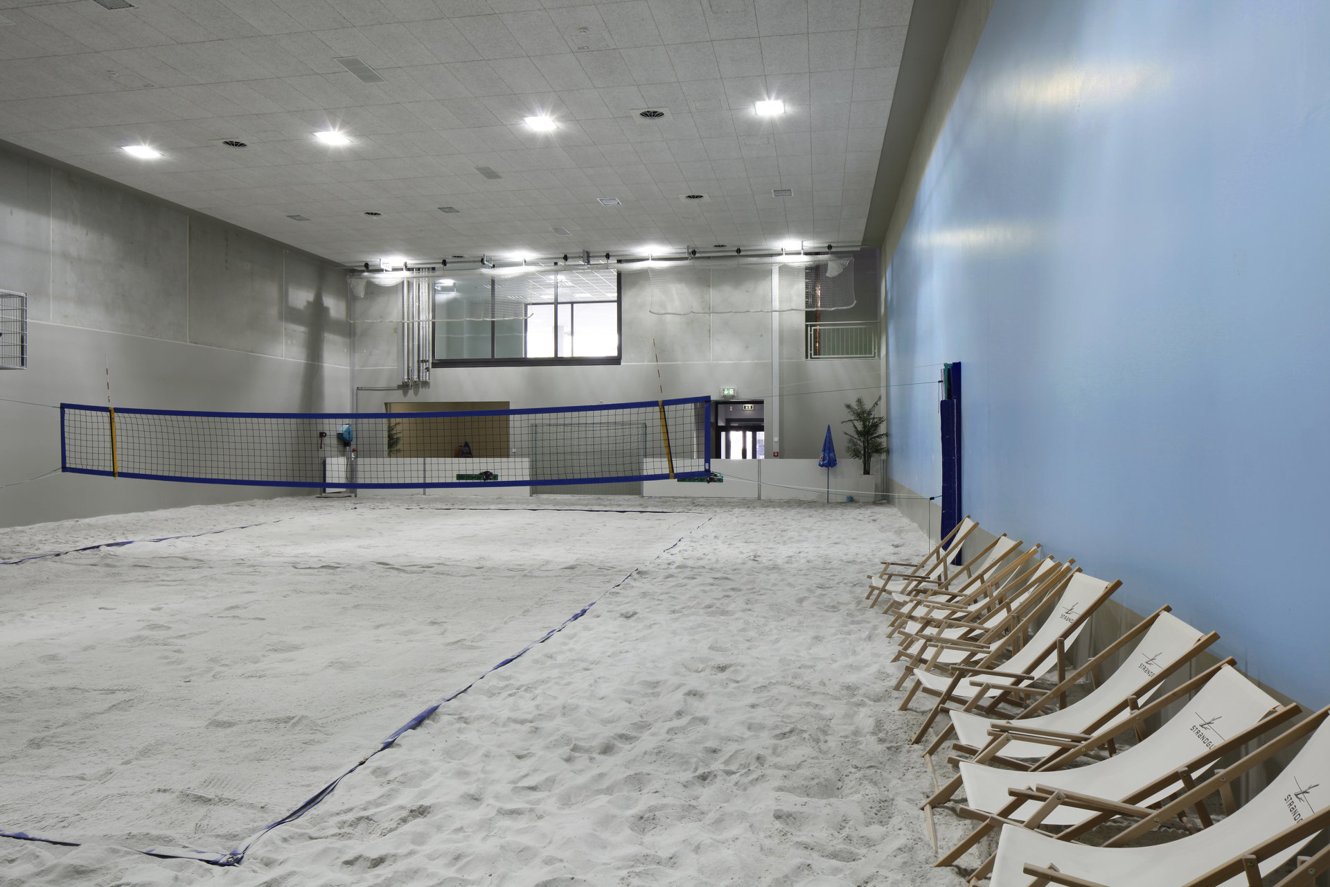 Die Beachvolleyballhalle ist ganz dem Ballspiel auf dem Sand gewidmet. Hier wurde erstmals in Österreich eine Sandheizung ausgeführt. Im sogenannten Beachcourt können Beach-Volleyball und Beach-Soccer gespielt werden. Ein Lounge-Bereich mit Sicht auf den Court und entsprechende Umkleiden runden das Angebot ab. (Text: Regine Koth-Afzelius nach einem Text der Architekt:innen)