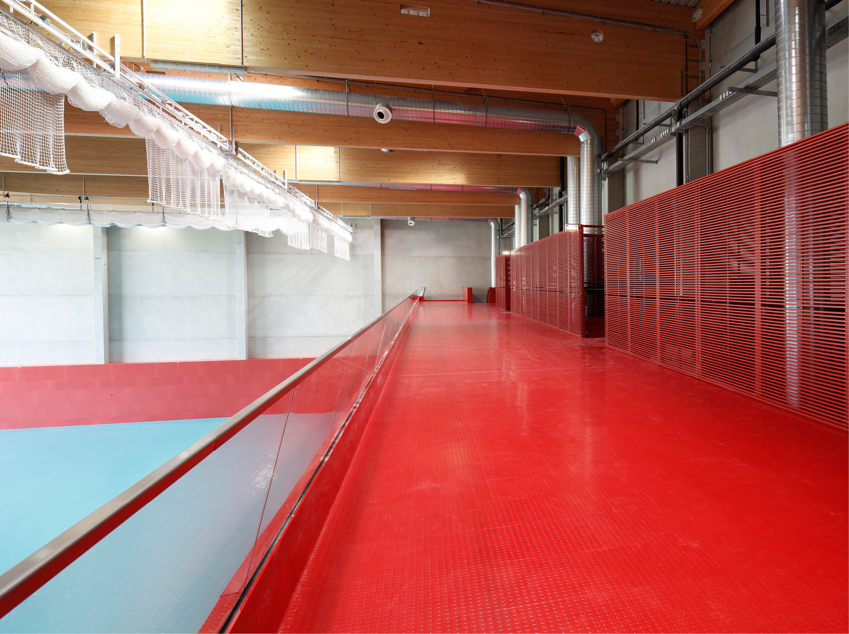 In der obersten Ebene befindet sich eine Cardio-Galerie, verbunden mit der Halle, der Zuschauertribüne und dem bestehenden Restaurant.