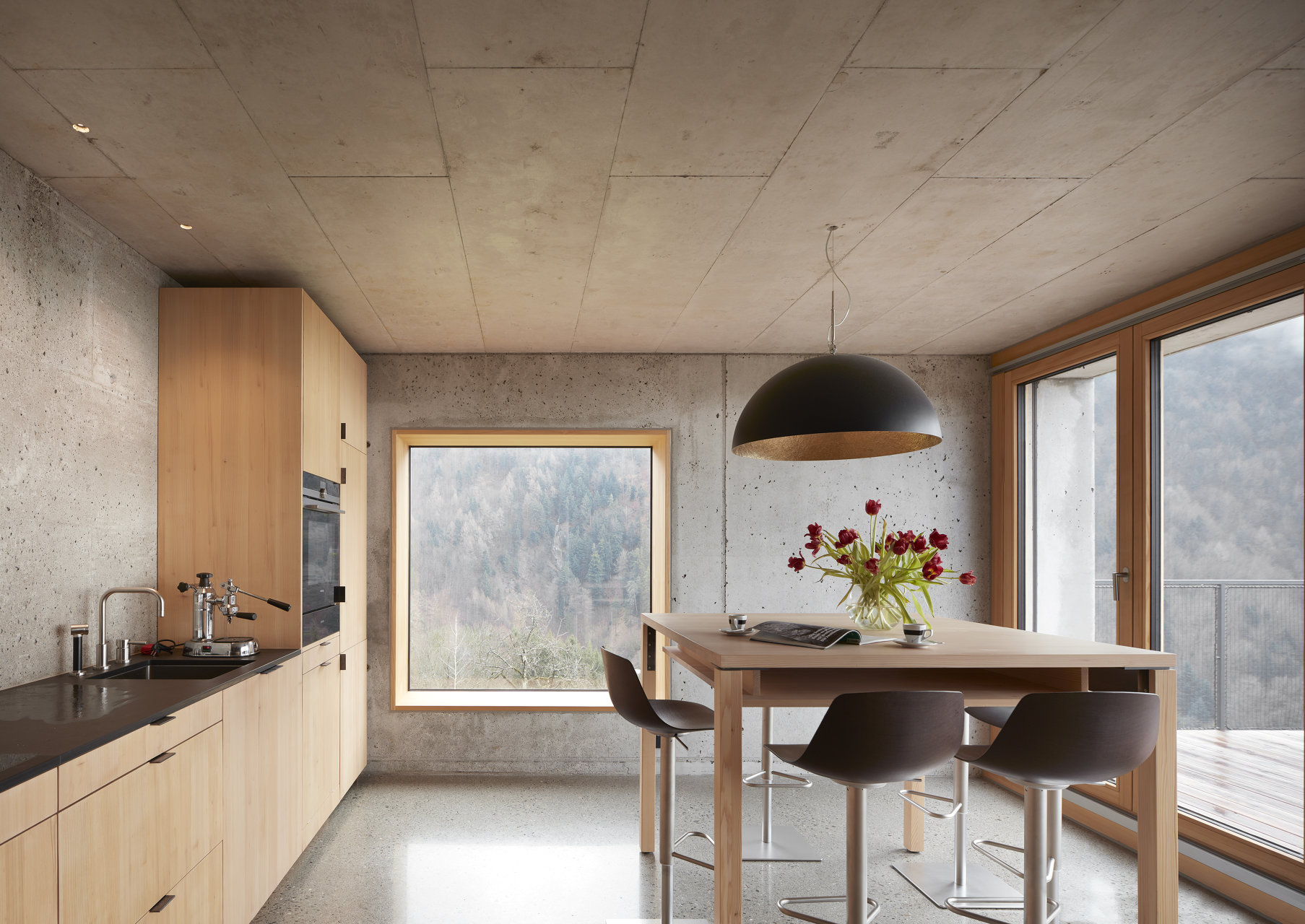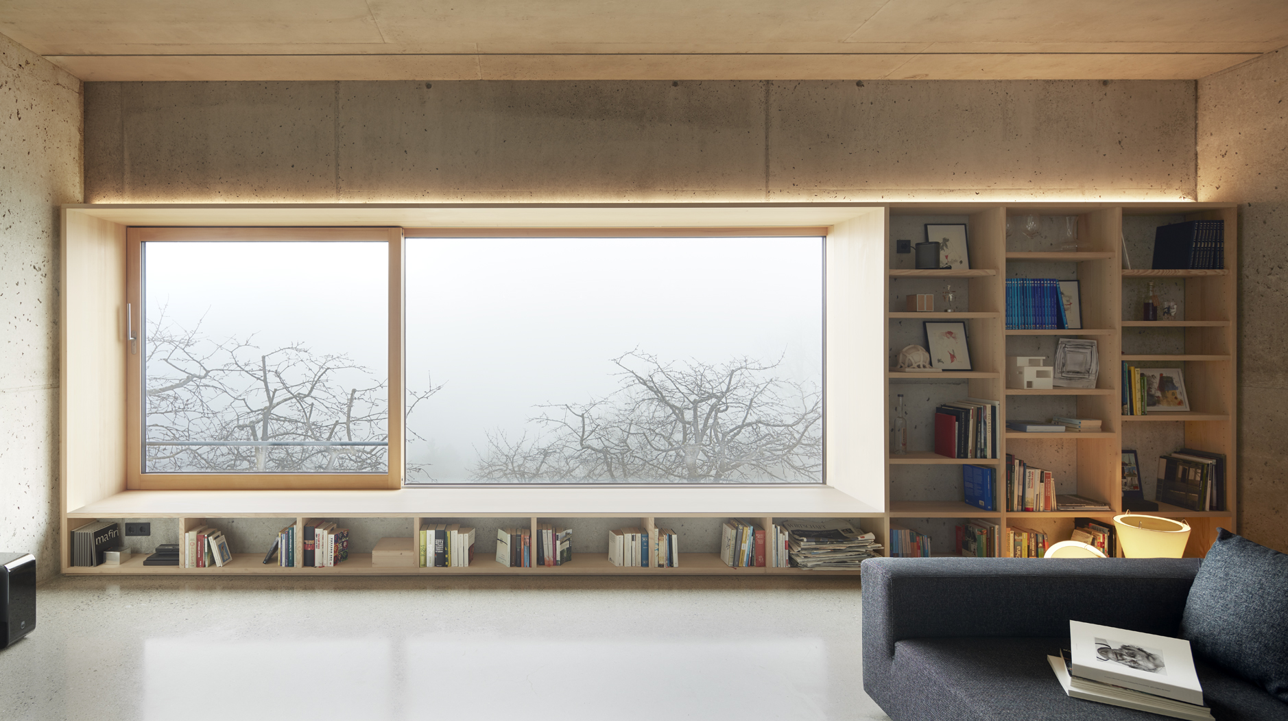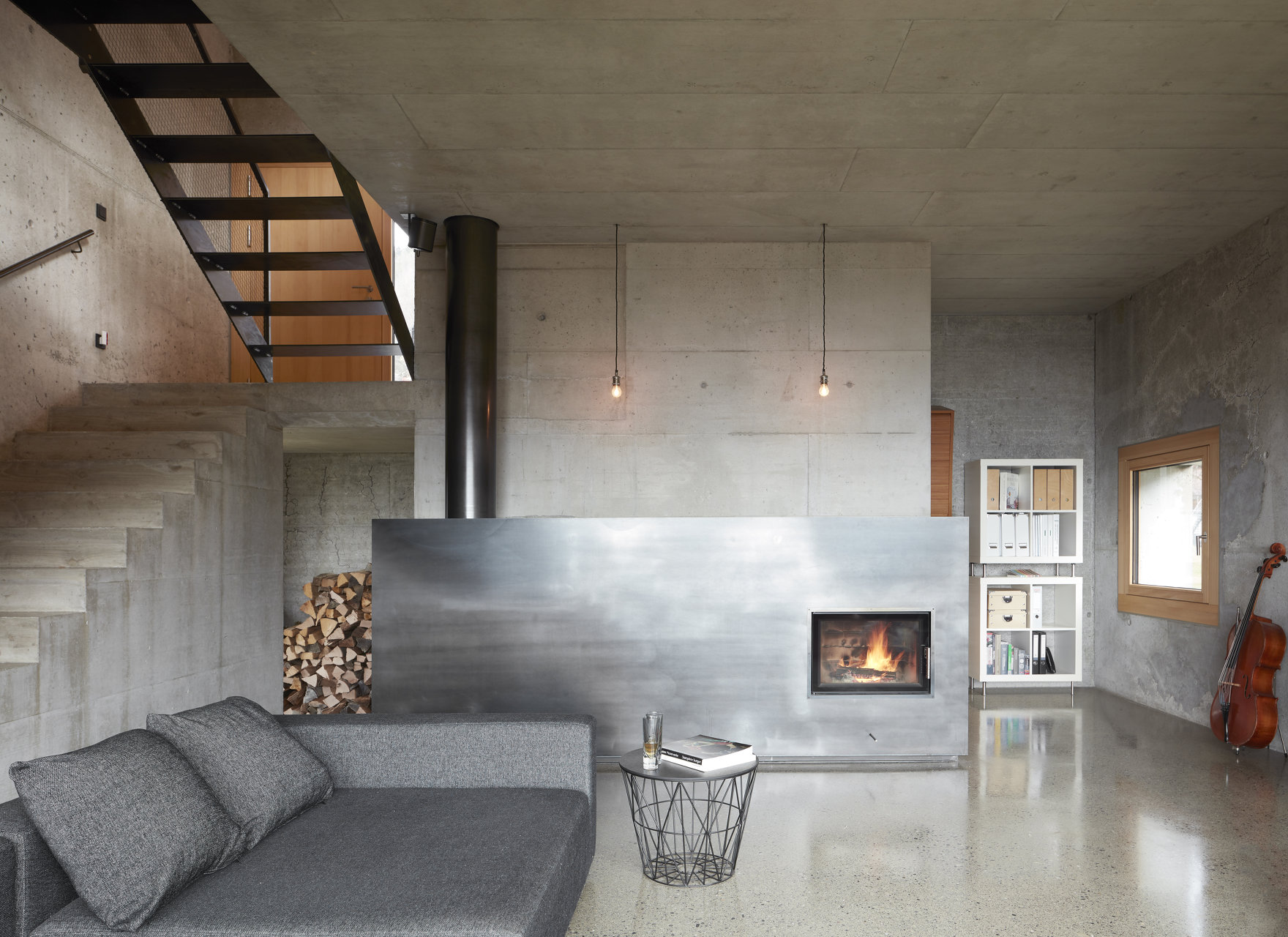 Die bewusst analog konzipierte Haustechnik nutzt Sonne und Holz als Energielieferant. Die Beheizung des Hauses erfolgt mittels Betonkernaktivierung: Heizleitungen wurden vor dem Betonieren in die Deckenschalung eingelegt. 16m² Vakuumröhrenkollektoren am Dach liefern die Heizenergie an einen Pufferspeicher. Der Grundofen mit 5 kW ergänzt das System in kalten und sonnenarmen Jahreszeiten. Die Masse und Trägheit der massiven Außenwände absorbiert die Sonneneinstrahlung und sorgt für ein gleichmäßiges, angenehmes Raumklima.