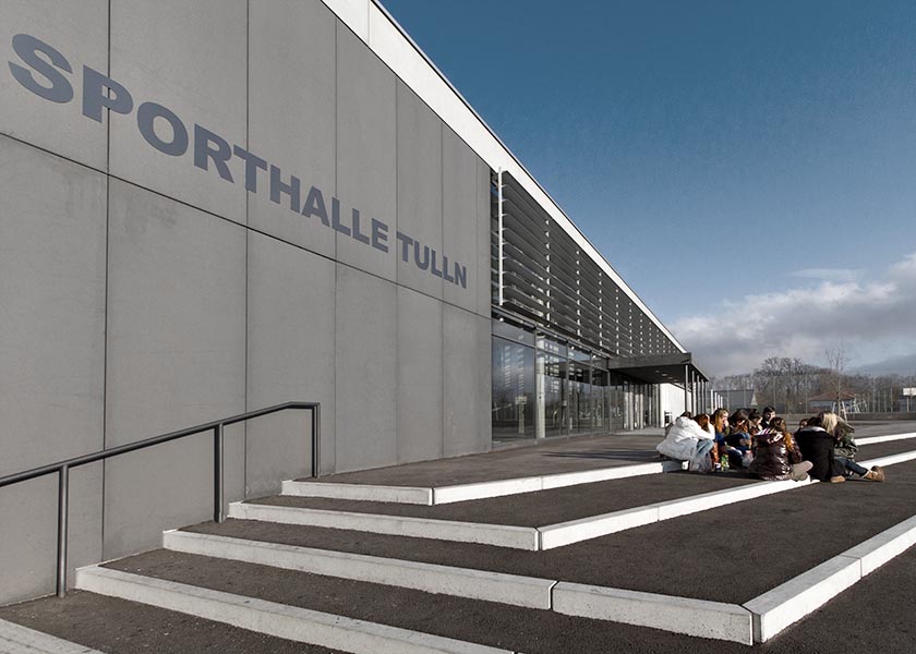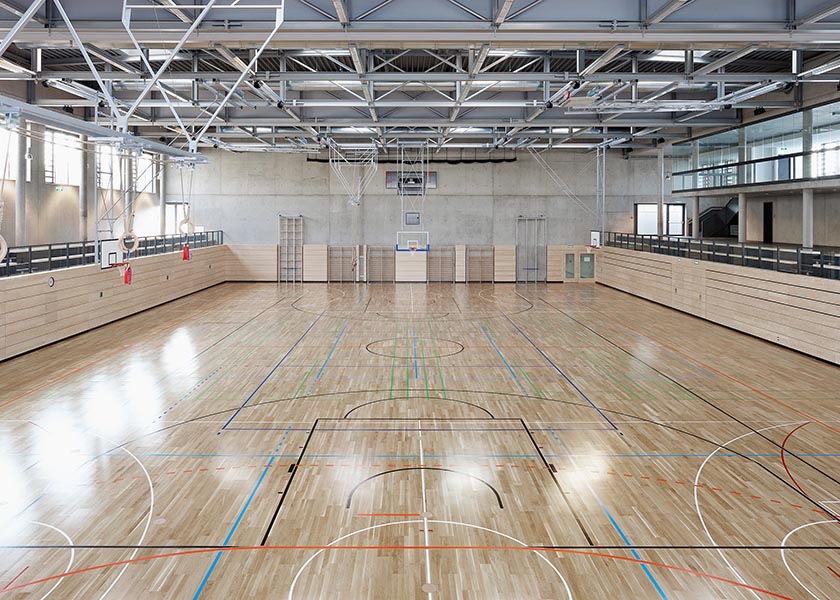 Eine homogene Deckengestaltung mit integrierten Dachlichtbändern ermöglicht eine blendfreie natürliche Belichtung. Die Halle ist für Schul- und Wettkampfsport ideal nutzbar. Die Bestandssporthalle ist Teil des bestehenden Gebäudeensemble. Während der laufenden Bauarbeiten wird die Sporthalle im Interimsbetrieb für den Unterricht genutzt. Für eine Reaktivierung waren Sanierungsmaßnahmen hinsichtlich Gebäudehülle, Haustechnik, Brandschutz und Barrierefreiheit notwendig. (Text: Architekten)