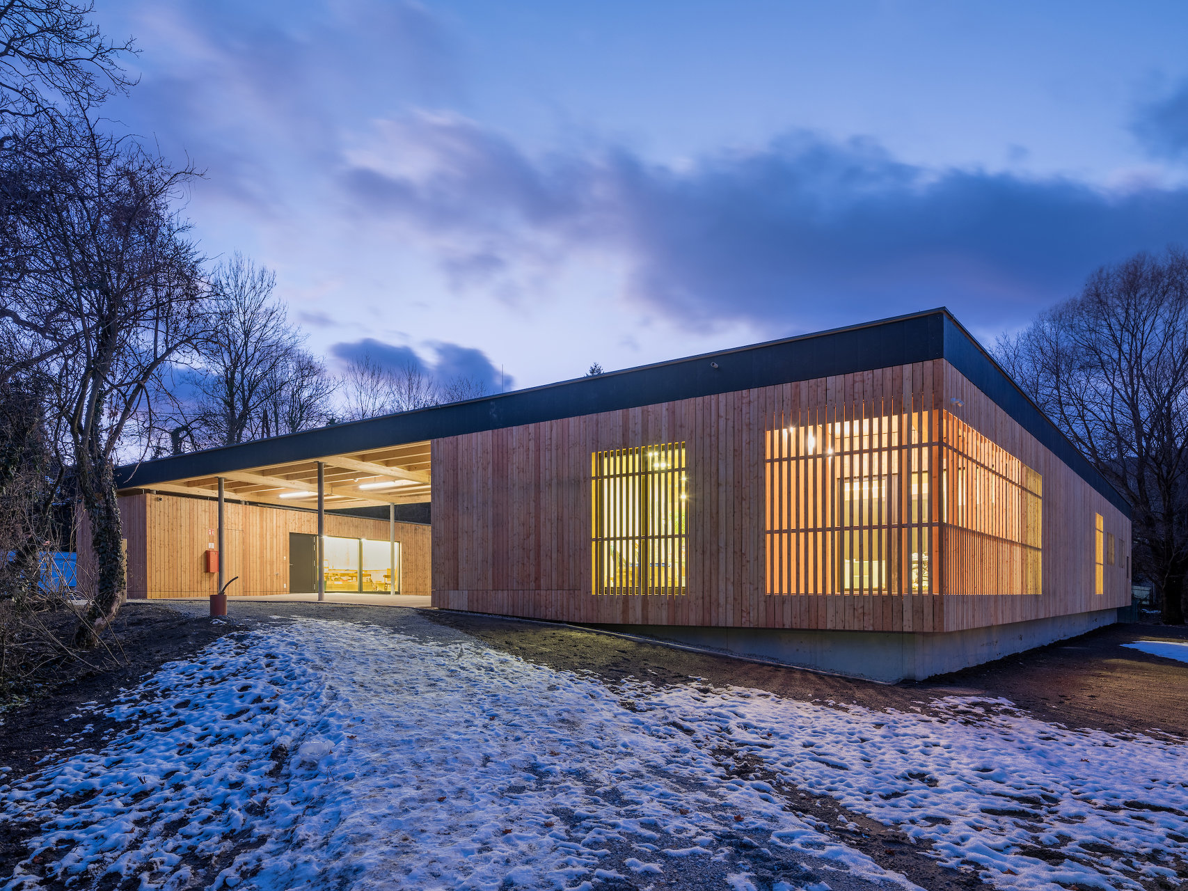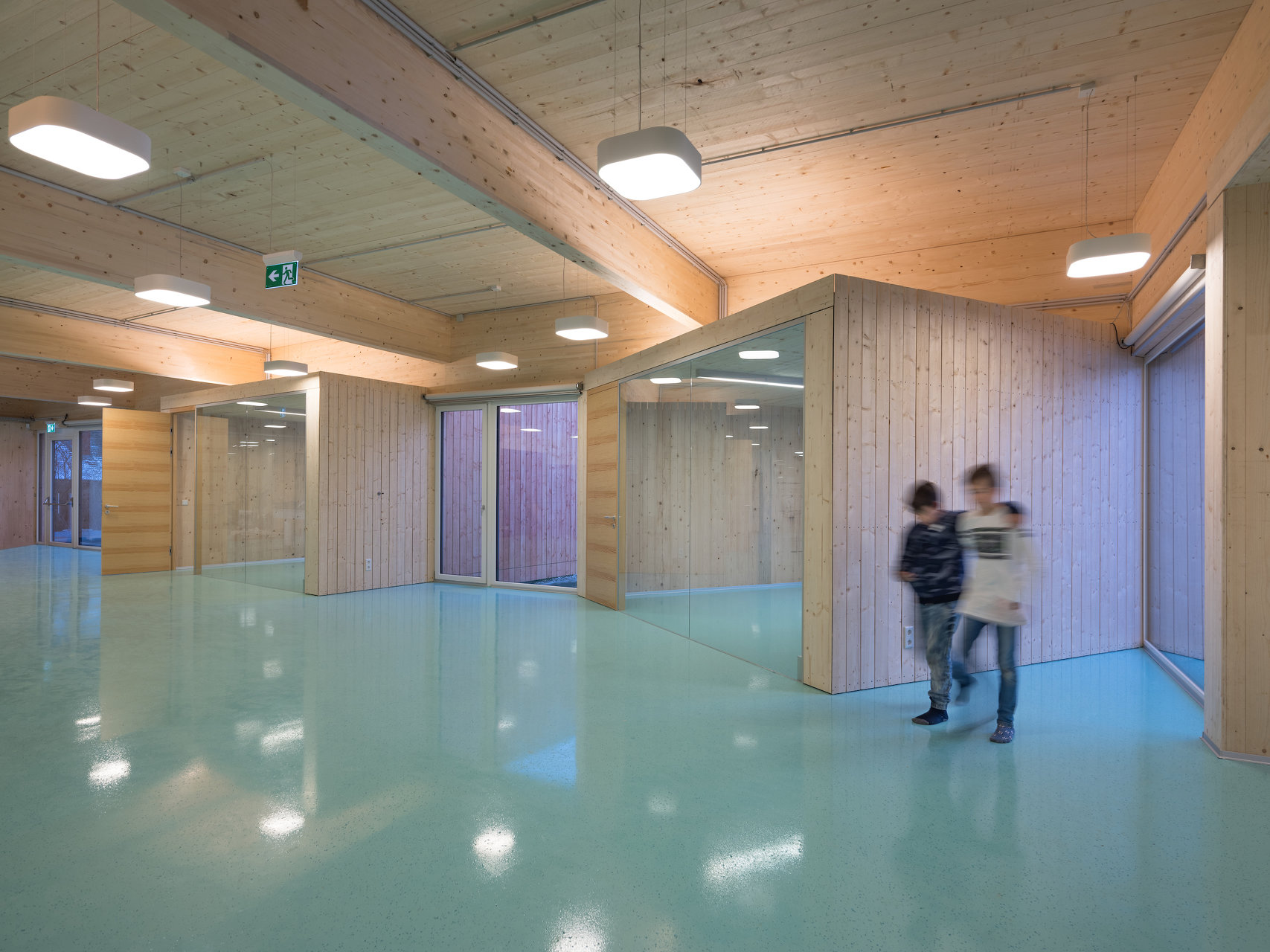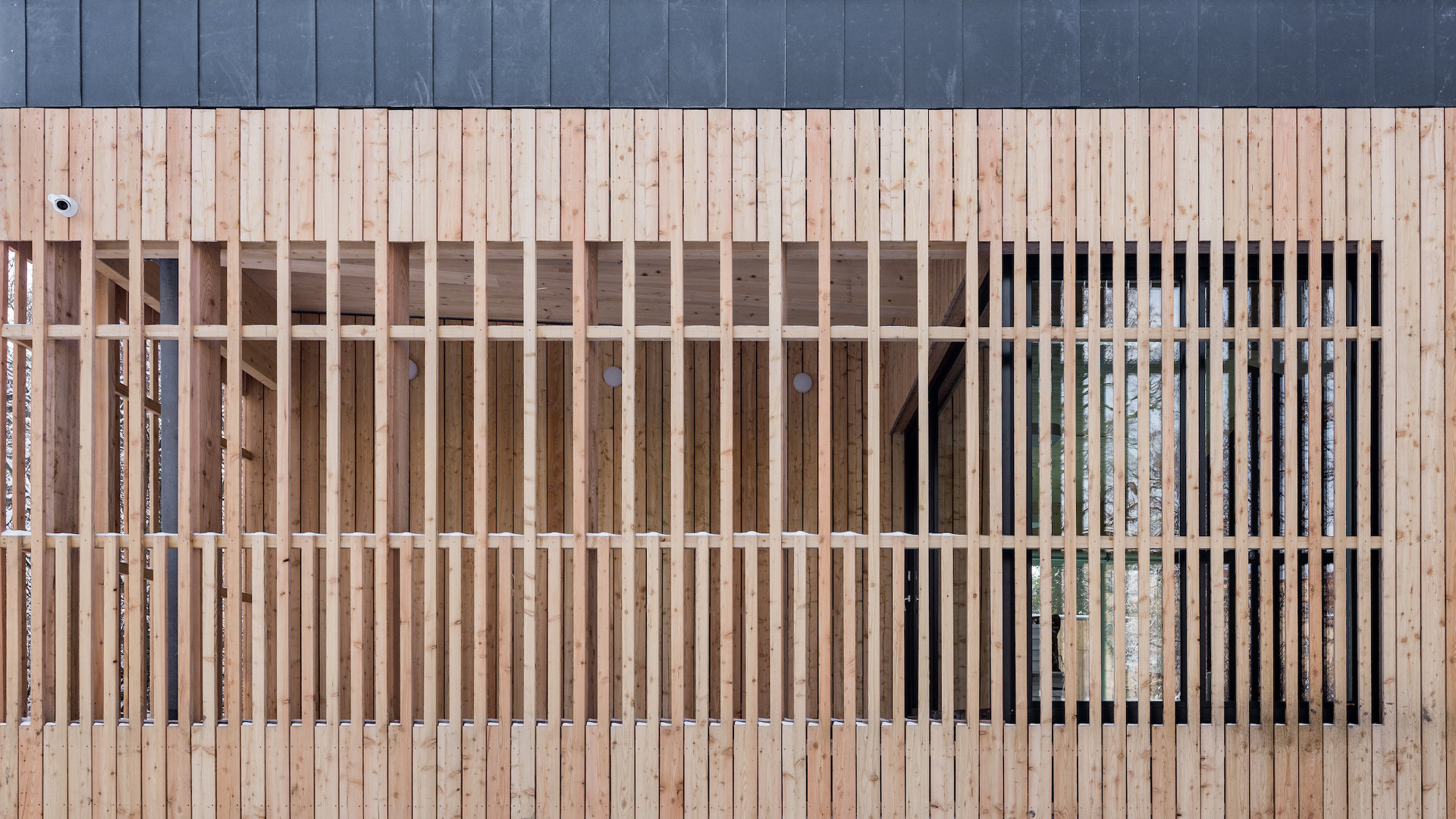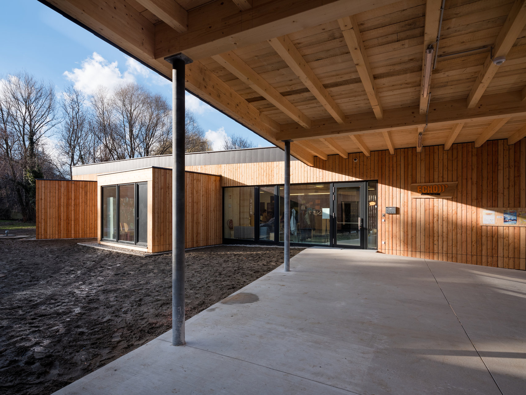 Das Jugendzentrum ECHO ist ein reiner Holzbau, bestehend aus BSP-Platten und BSH-Trägern mit Stahlstützen auf einer Stahlbetonplatte. Das Gebäude ist mit einer sägerauen Lärchenschalung und einer offenen Fuge wärmegedämmt. Der Dachrand wurde umlaufend mit Eternit Dachplatten in schwarz abgeschlossen.