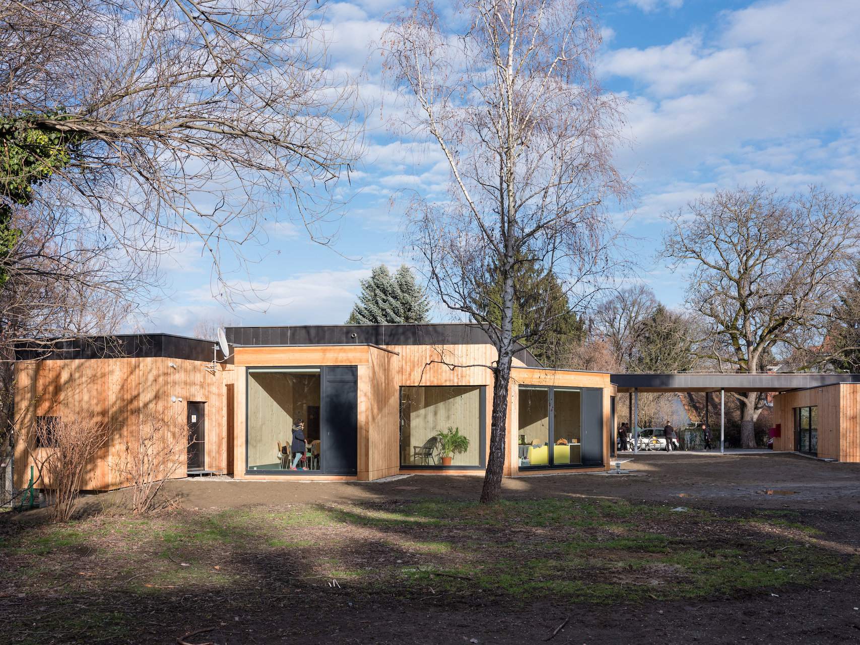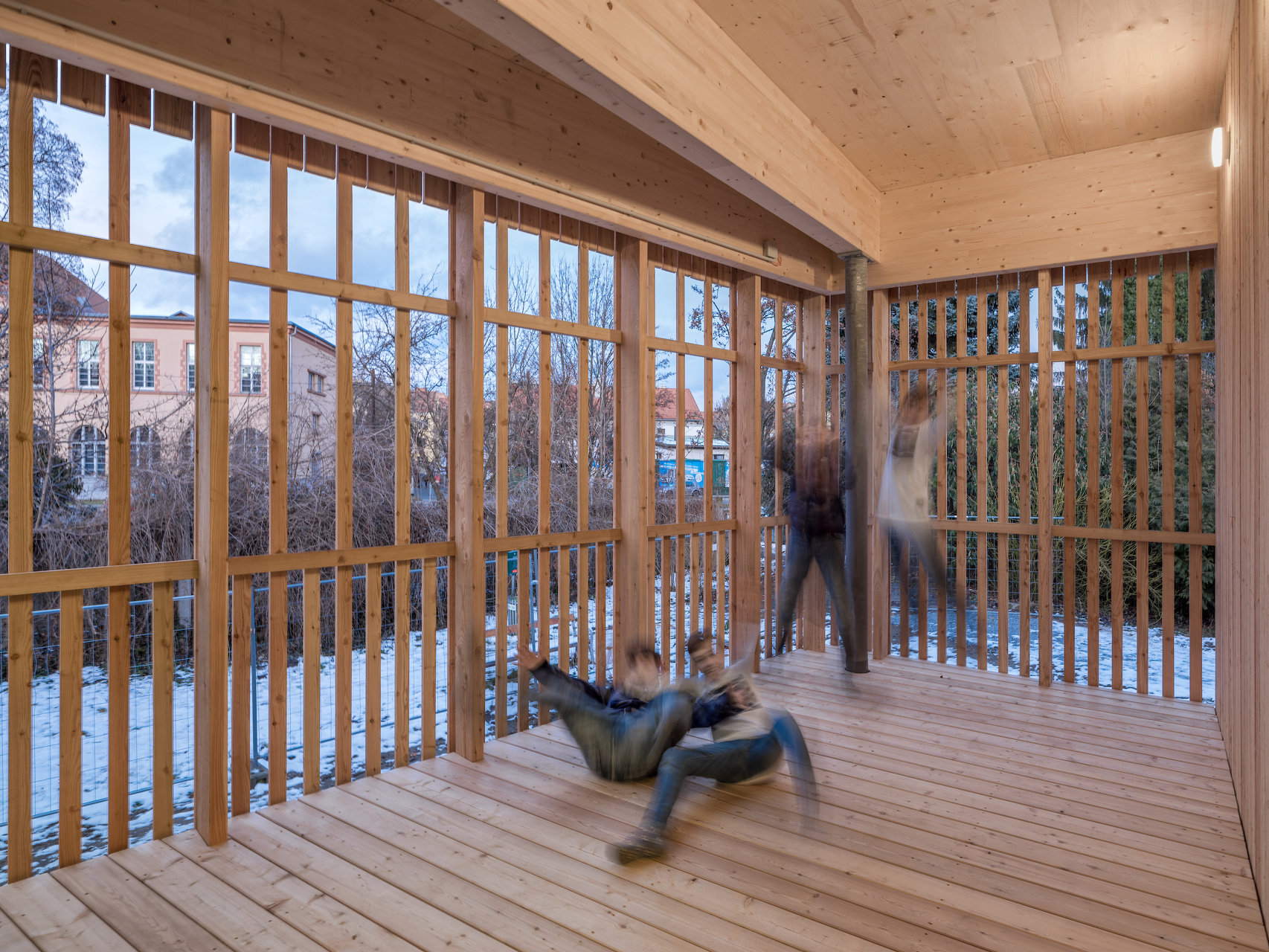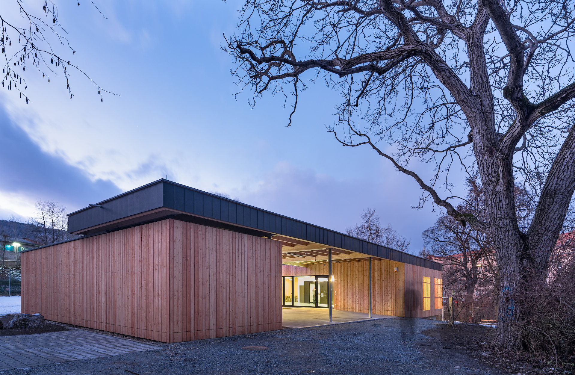 Für die Gestaltung des Jugendzentrums ECHO wurde ein geladener Wettbewerb der Stadt Graz abgehalten. Die Haupt-Vorgaben waren die Einsichtigkeit der Innen- und Außenbereiche sowie die Einhaltung des Budgetrahmens von 550.000 Euro. Anstelle des sanierungsunfähigen desolaten Altbestands, der einst als Gärtnerei diente, wurde ein Holzbau geschaffen, der sowohl durch die Glasfassaden und die Freizonen im Süden Offenheit, als auch durch die Materialität, die unmittelbare Umgebung und Raumaufteilung Geborgenheit und Schutz suggeriert.