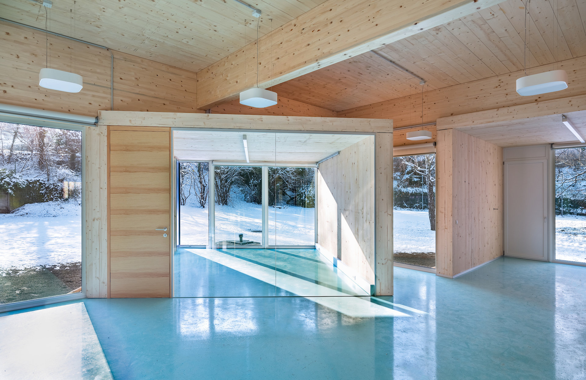 Eine Luftwärmepumpe in Kombination mit einer Fußbodenheizung sorgt für die Beheizung des Objekts. Die Nutzer:innen des Zentrums wurden in die Gestaltung der Einrichtung miteinbezogen, indem sie in Kooperation mit Caritas-Tagwerk die Innenausstattung kreierten. (Text: Eva Sophie Paulusberger)