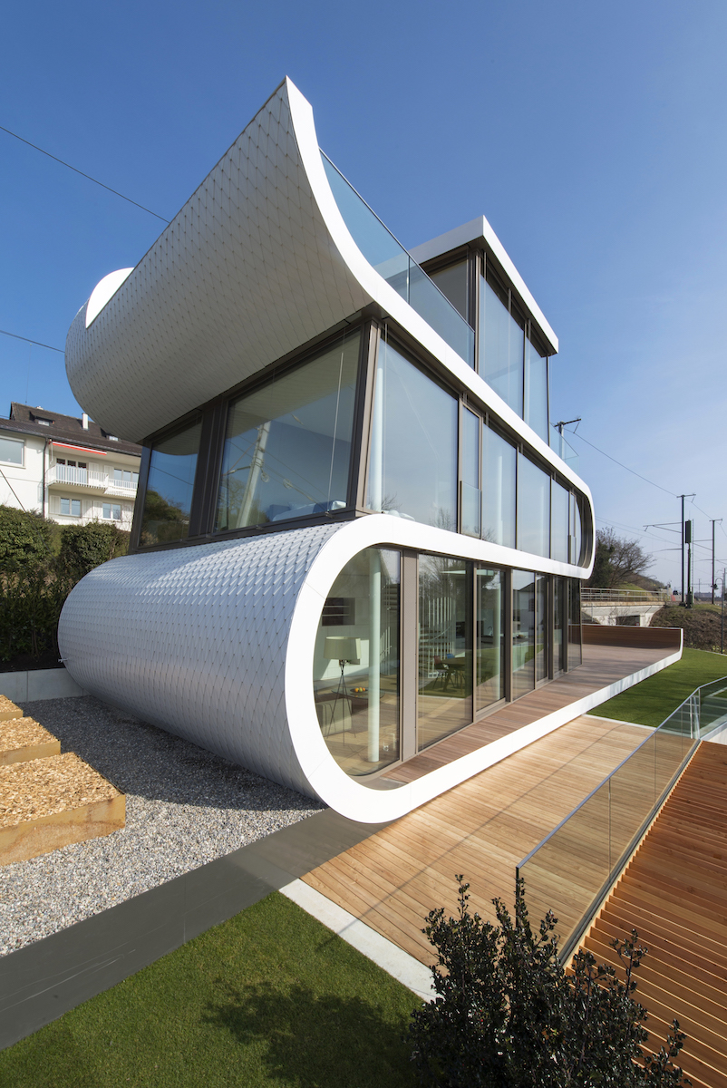 Das Flexhouse besteht aus Betondecken, Stahlstützen und aus Holz vorfabrizierten Rundbögen, die zur Konstruktion der Innendecken und Rundbögen mit einem gleichbleibenden Mass dienten. Beheizt wird das im Minergiestandard realisierte Gebäude mit Erdsonden-Wärmepumpe und thermoaktiven Decken. Das dadurch ermöglichte Free Cooling und die aussenliegenden Lamellenstoren garantieren demnach trotz grosszügiger Verglasung ein angenehm kühles Innenraumklima, selbst im Hochsommer. (Text: Regine Koth-Afzelius nach einem Text des Architekten)